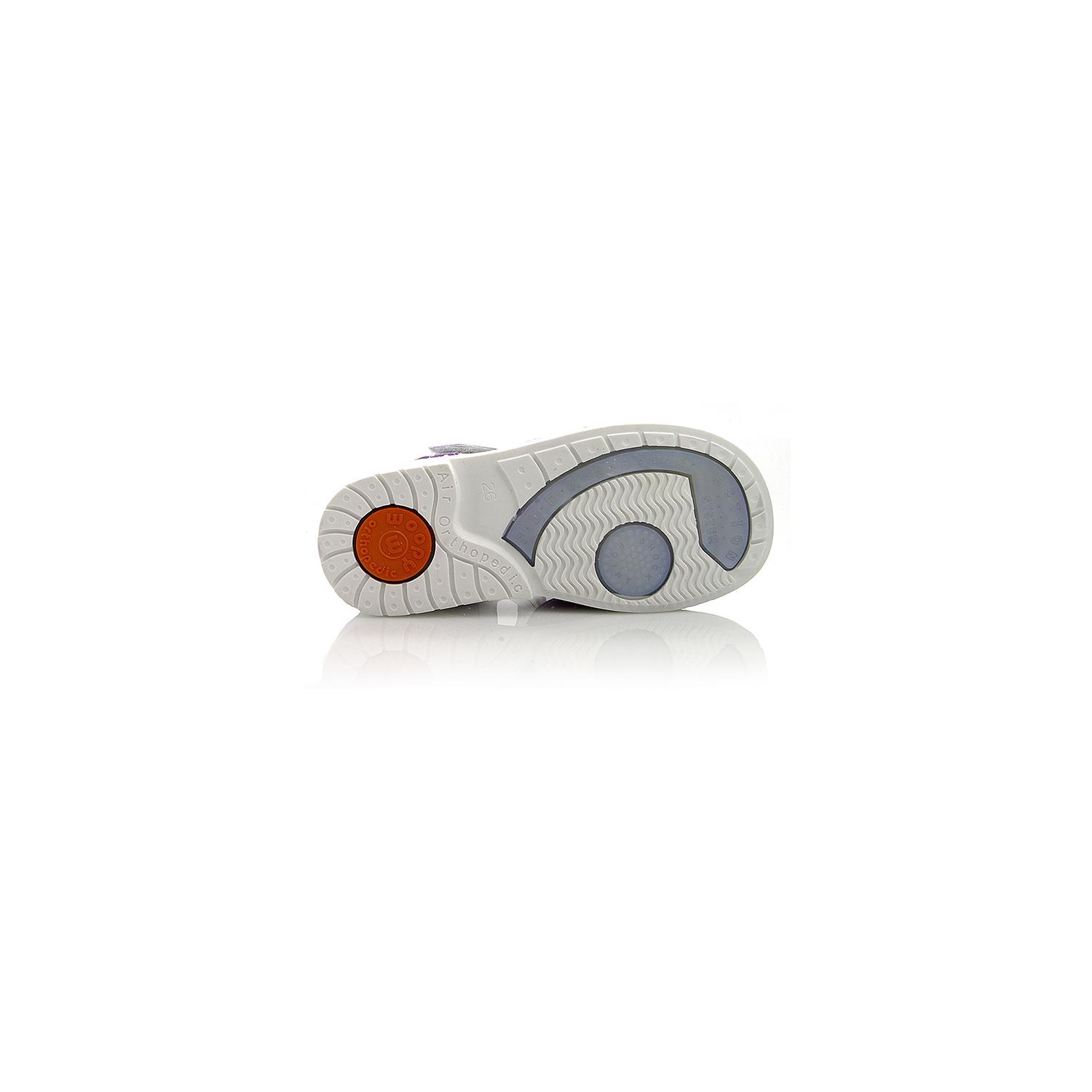 Босоножки ортопедические серебристого цвета с сиреневыми вставками. Сверху фиксируются двумя липучками. Снаружи кожа + нубук, внутри кожаные. Высокая твердая пятка, супинатор и ортопедический каблук Томаса.