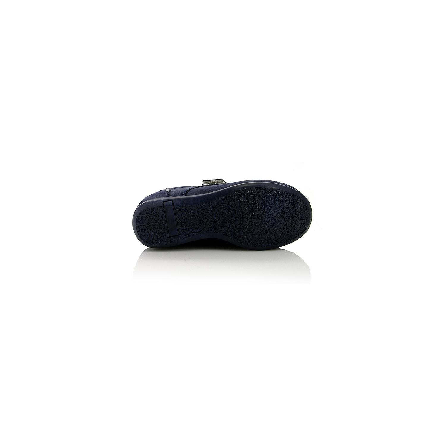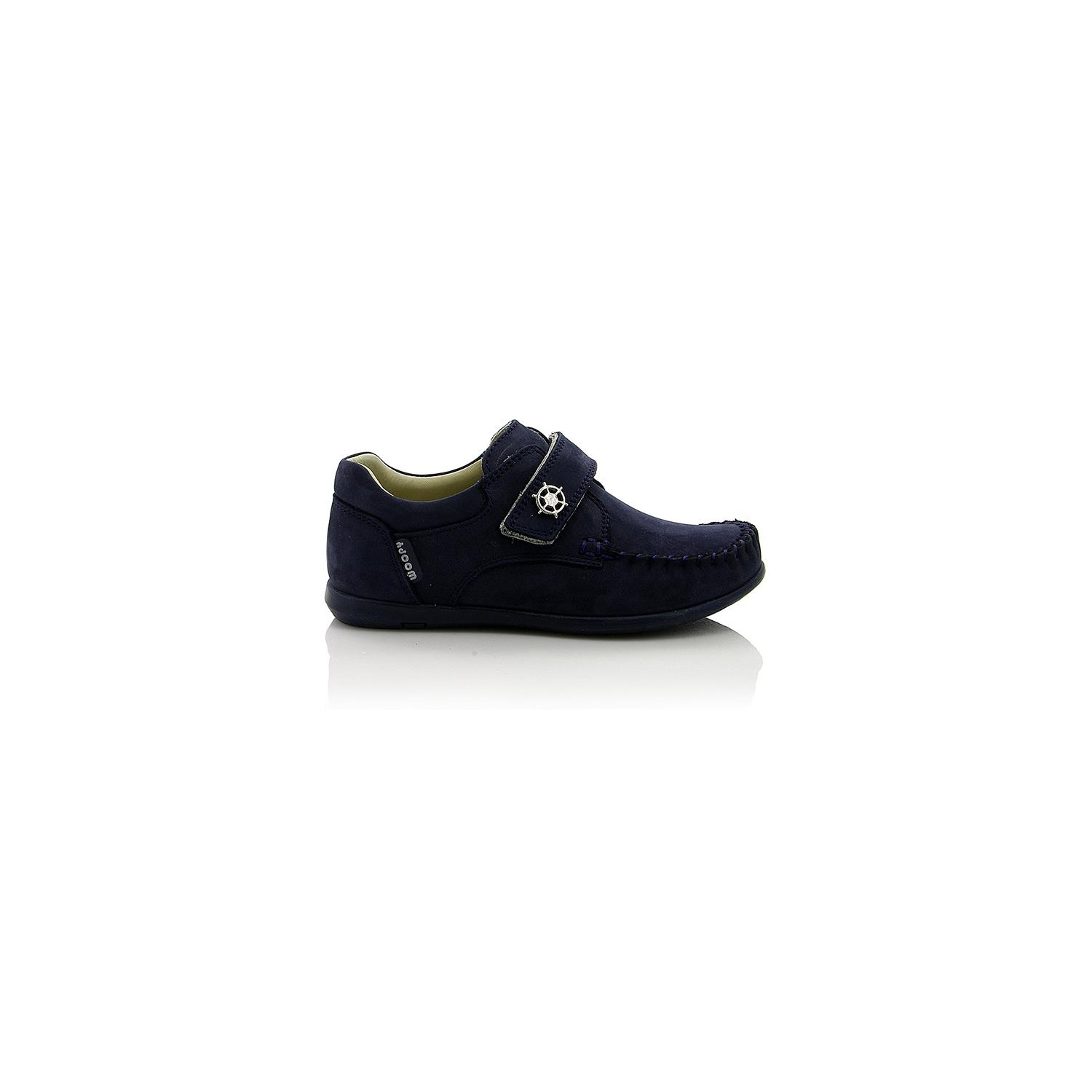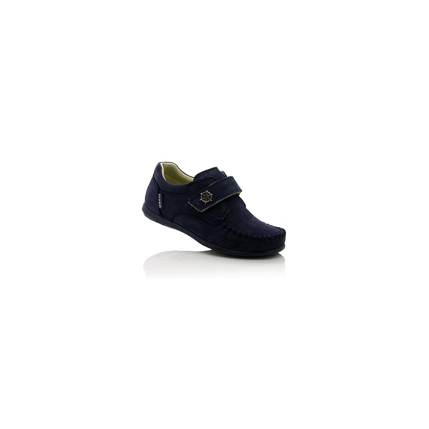 Мокасины темно-синего цвета. Сверху фиксируются липучкой, снаружи нубук, внутри кожаные. Есть супинатор и твердая пятка.
