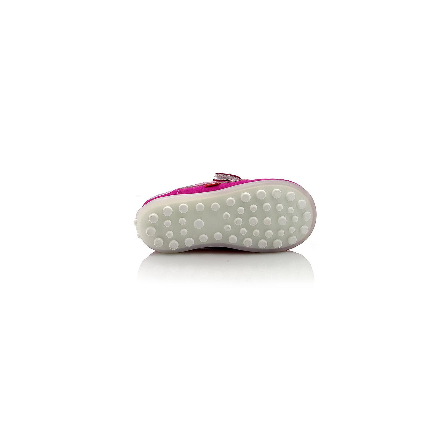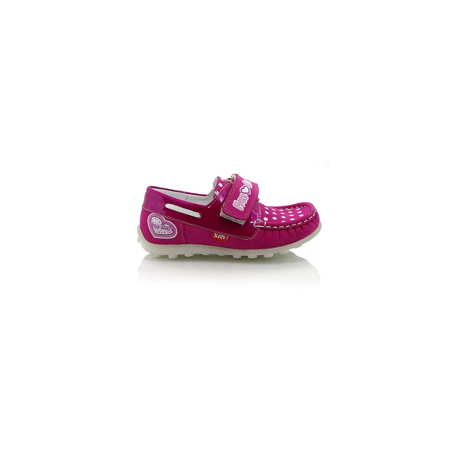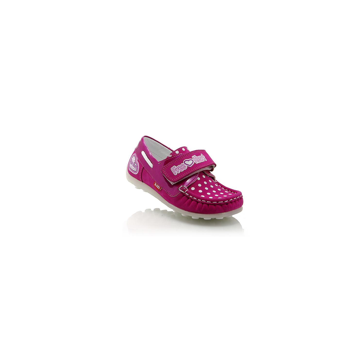 Мокасины малтнового цвета (в горошек). Сверху фиксируются липучкой, снаружи гладкий нубук, внутри кожаные. Есть супинатор и твердая пятка.