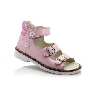Босоножки ортопедические светло-розового цвета. Снизу регулируются двумя застежками, сверху липучкой. Снаружи и внутри кожаные. Высокая твердая пятка, супинатор и ортопедический каблук Томаса.