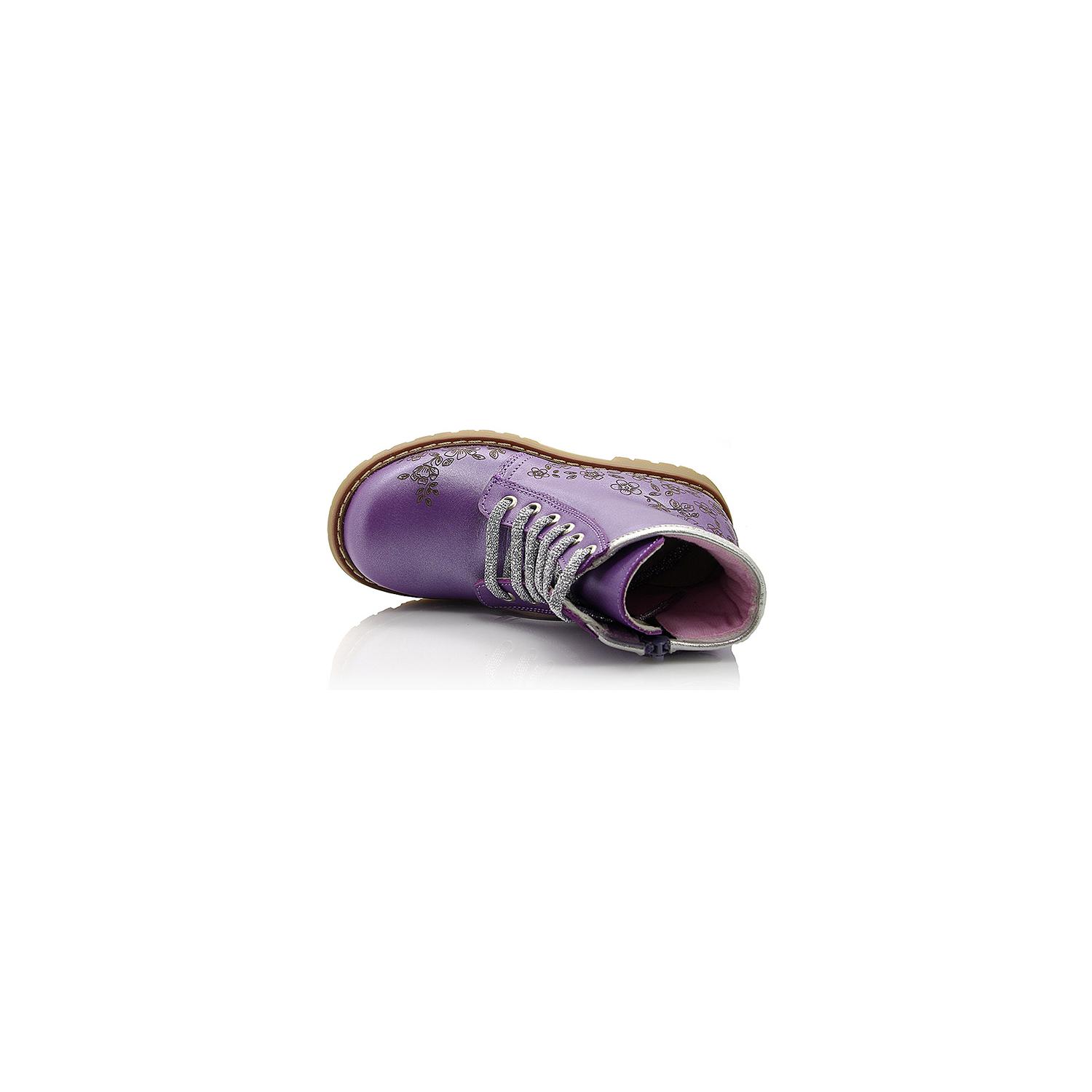 Демисезонные ботинки сиреневого цвета (перламутр) с лазерным рисунком. Сверху регулируются шнурками, с внутренней стороны - на молнии. Снаружи кожаные, внутри - стелька кожаная, бока на флисе. Имеется ортопедический каблук Томаса, супинатор, твердая пятка.