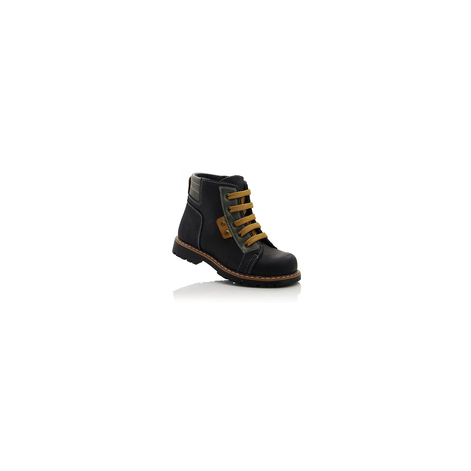 Демисезонные ботинки черного цвета. Сверху регулируются шнурками, с внутренней стороны - на молнии. Снаружи кожа (жирный нубук), внутри - стелька кожаная, бока на флисе. Имеется ортопедический каблук Томаса, супинатор, твердая пятка.