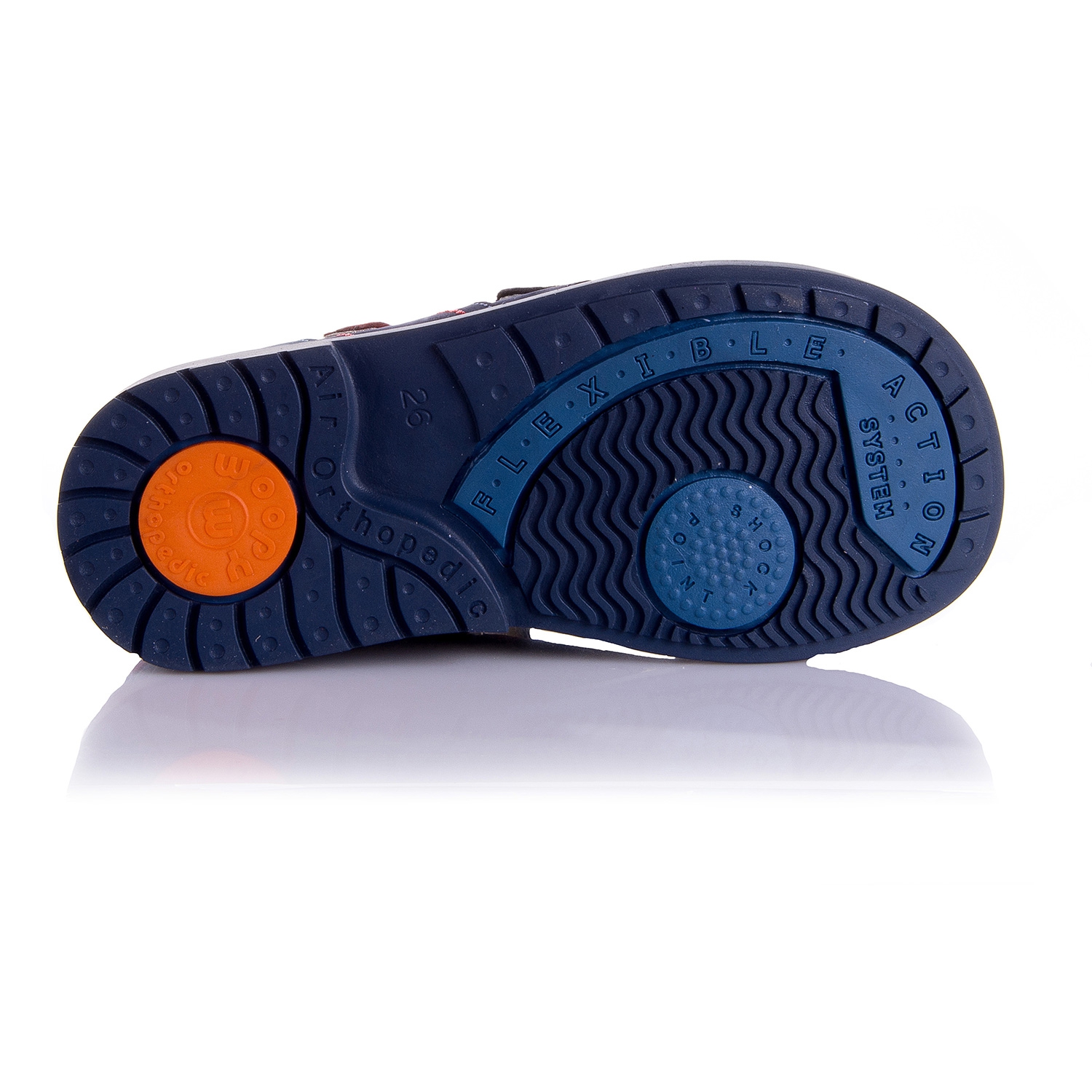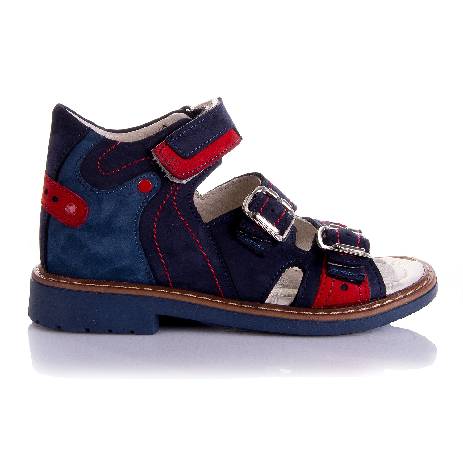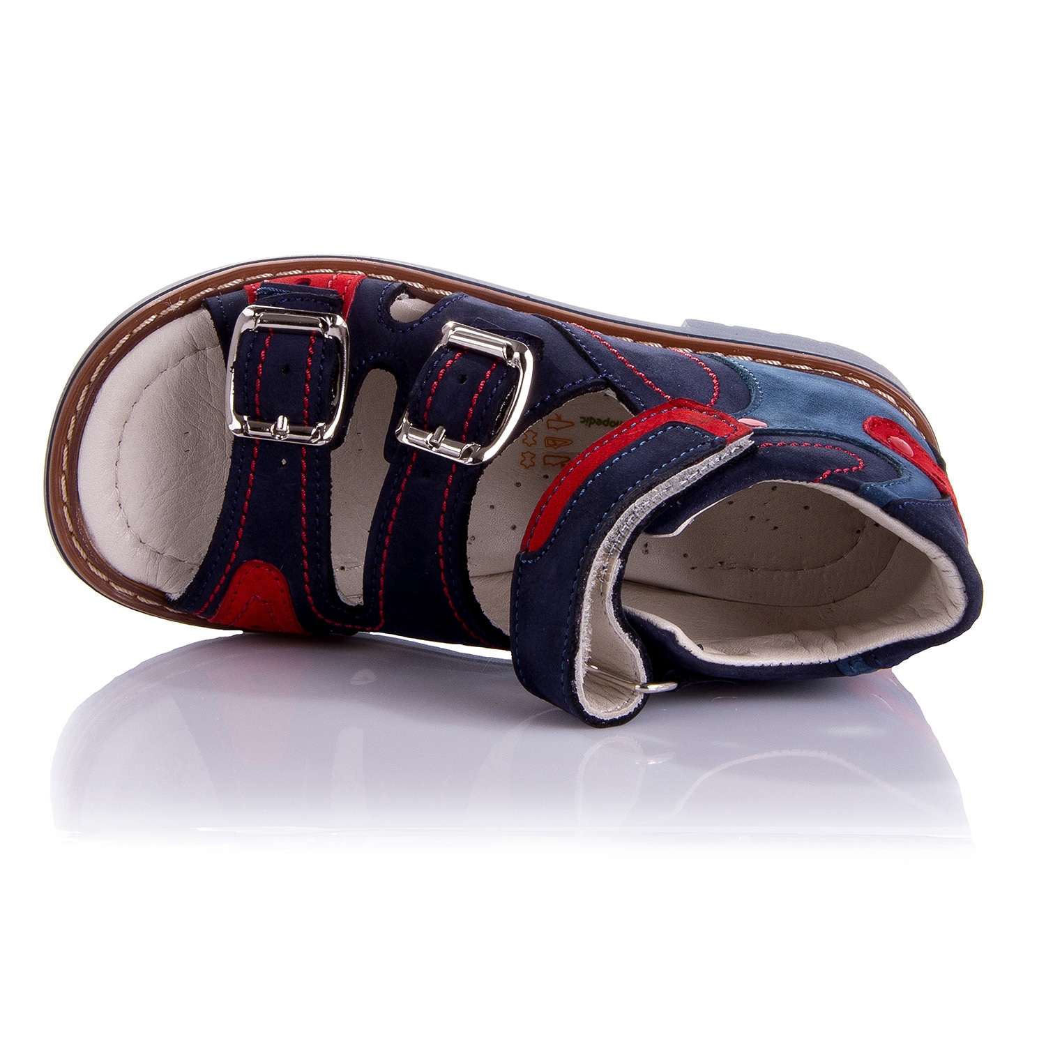 Босоножки ортопедические темно-синего цвета. Сверху регулируются липучкой и двумя застежками. Снаружи нубук, внутри кожаные. Есть высокий твердый твердый задник, ортопедический супинатор и каблук Томаса.