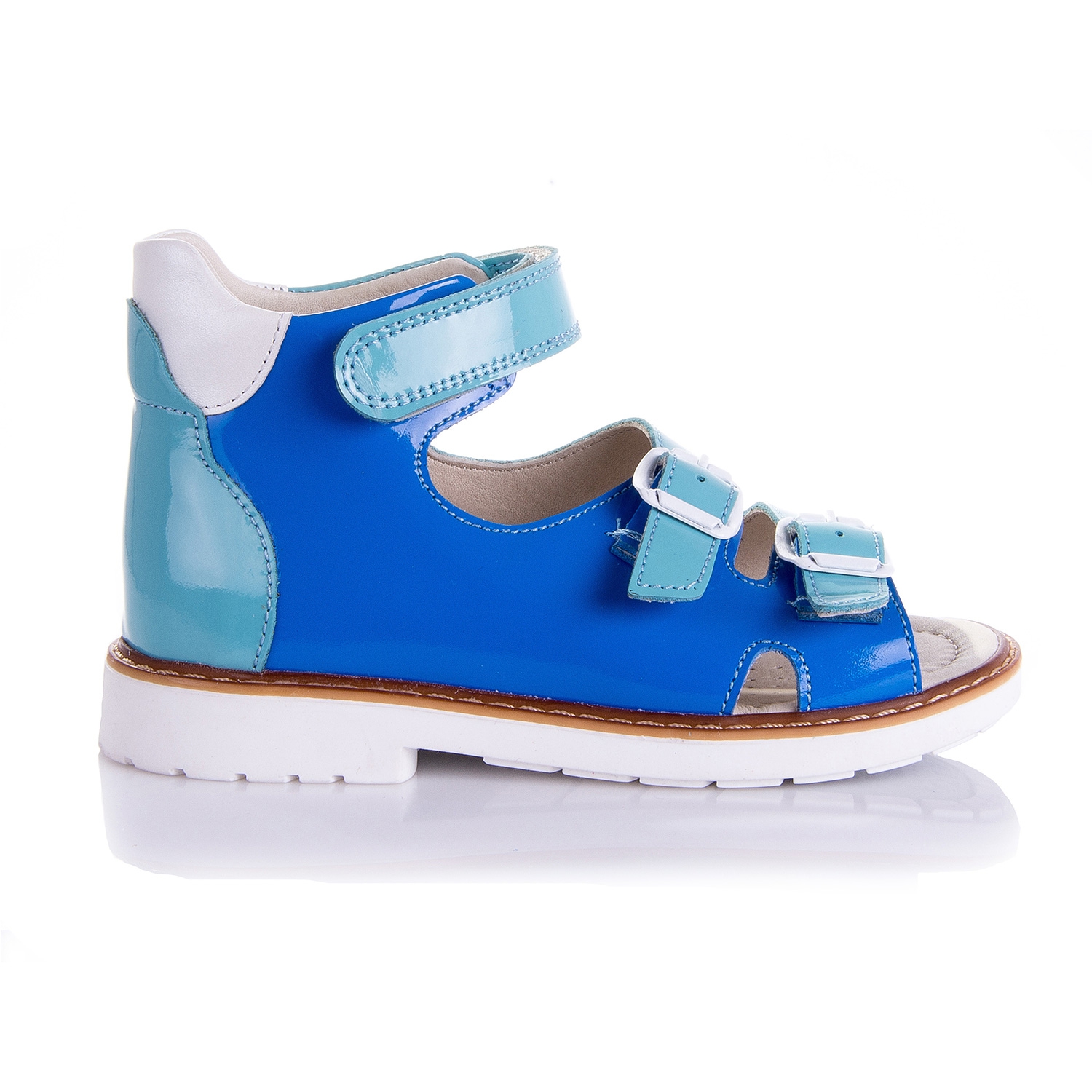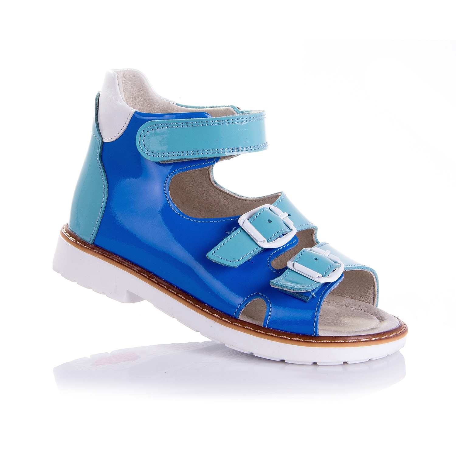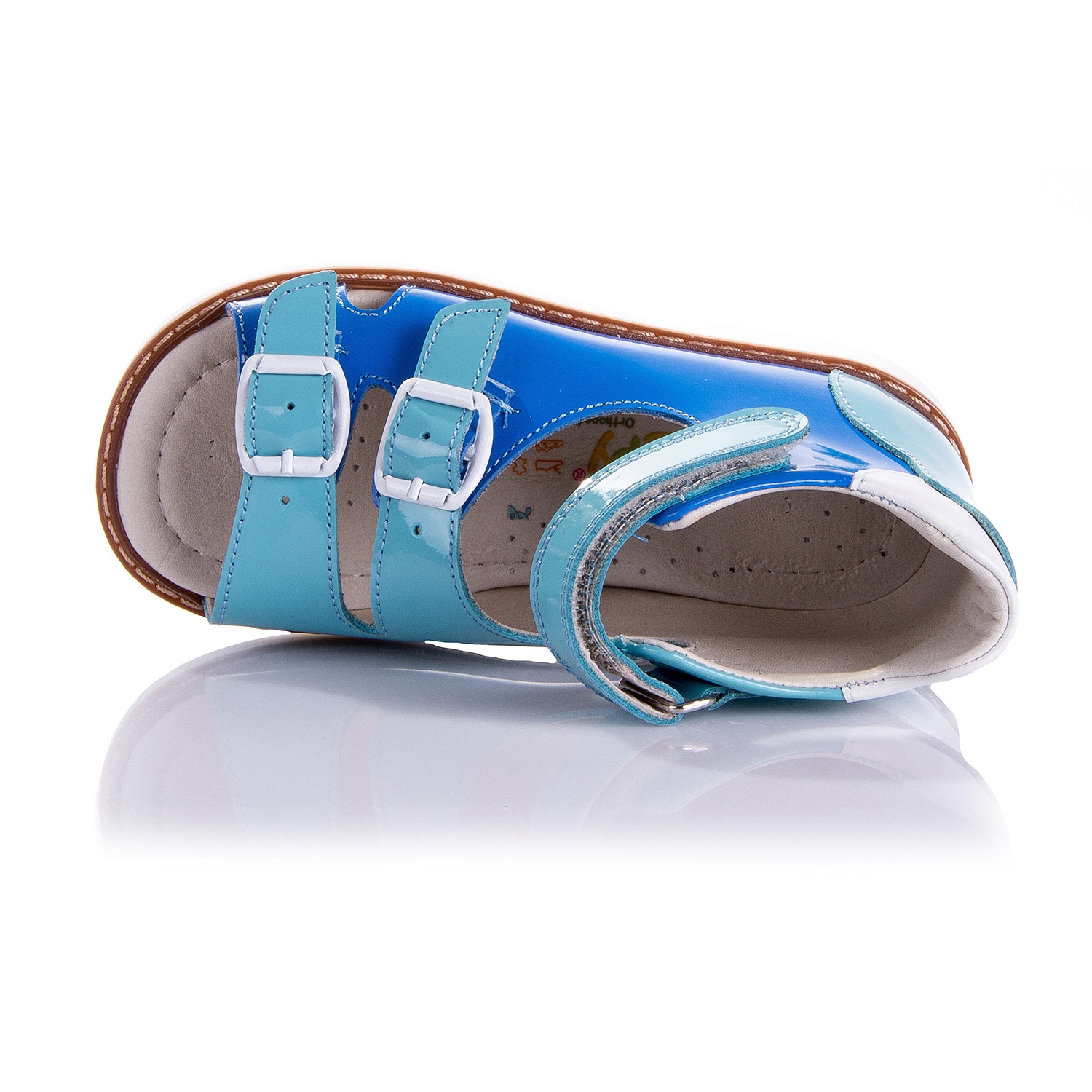 Босоножки ортопедические синего цвета с голубыми вставками (лаковые). Сверху регулируются липучкой и двумя застежками. Снаружи и внутри кожаные. Есть высокий твердый твердый задник, ортопедический супинатор и каблук Томаса.