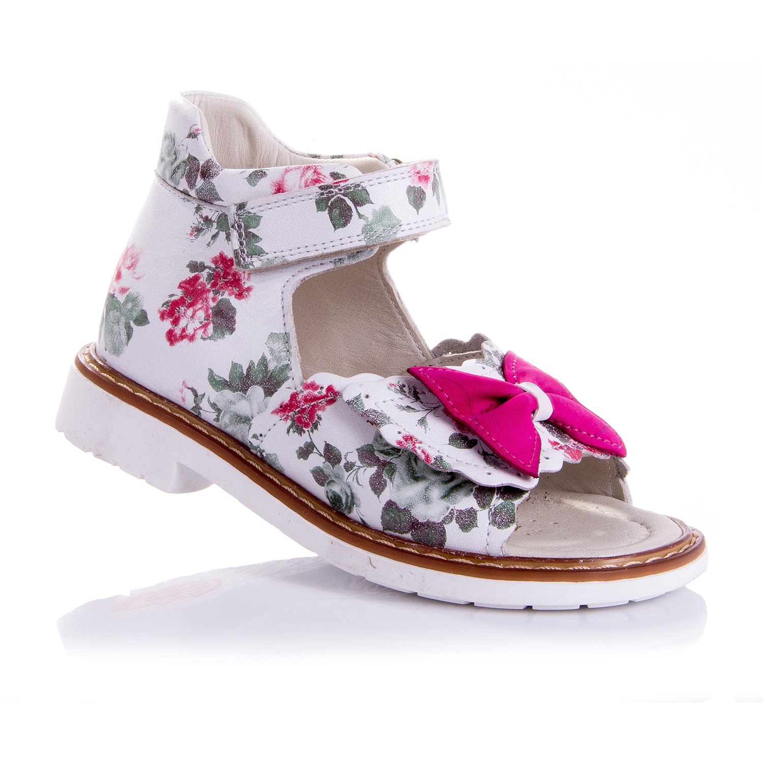 Босоножки ортопедические с цветным принтом и розовым бантиком. Сверху фиксируются двумя липучками. Снаружи и внутри кожаные. Высокая твердая пятка, супинатор и ортопедический каблук Томаса.
