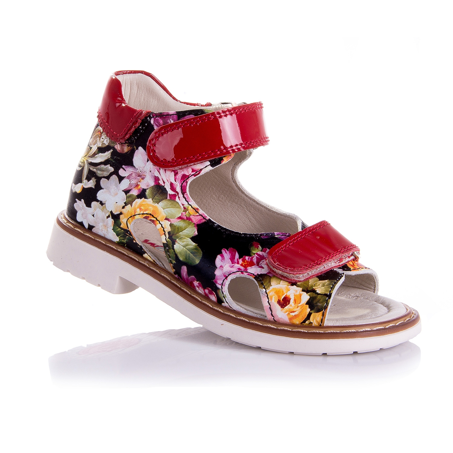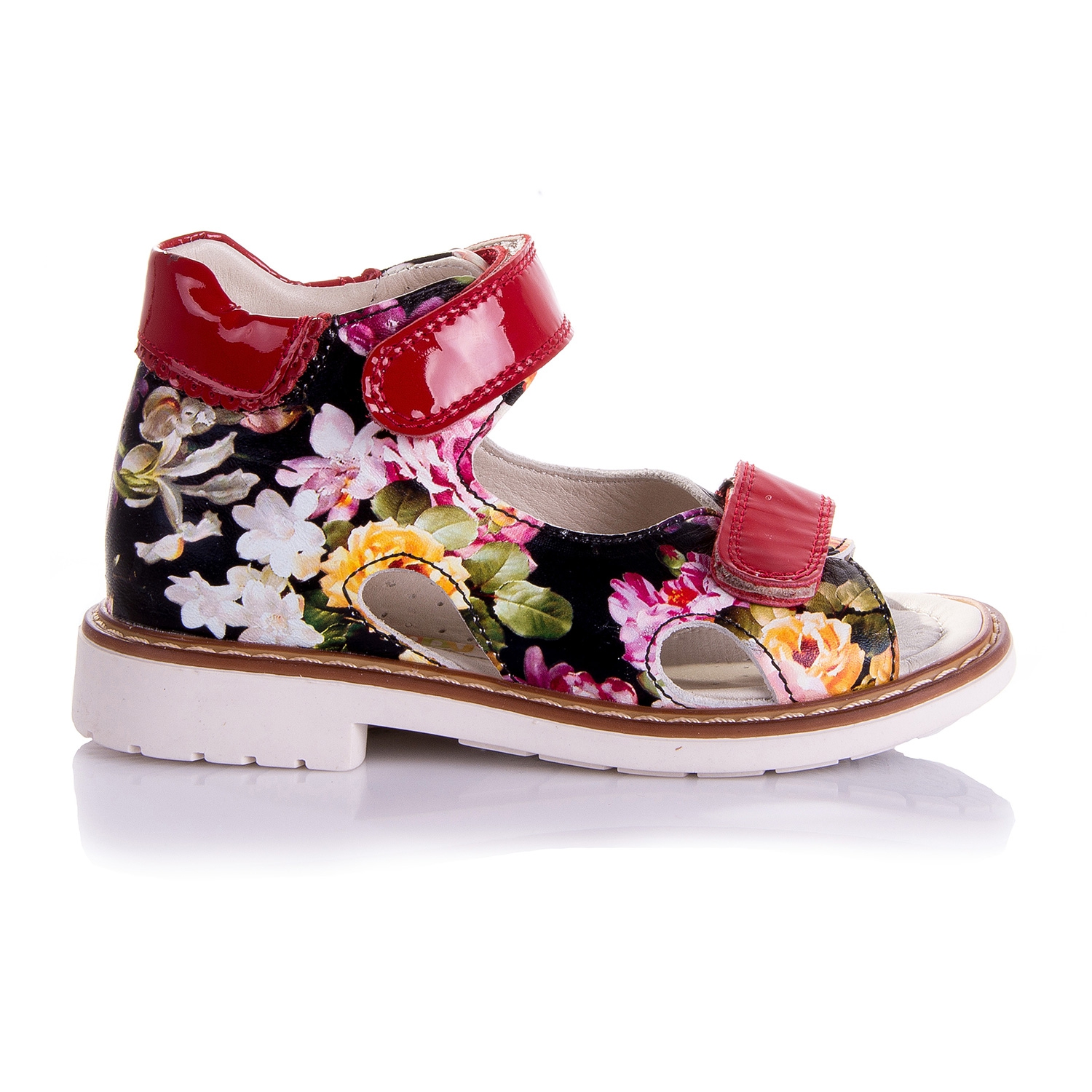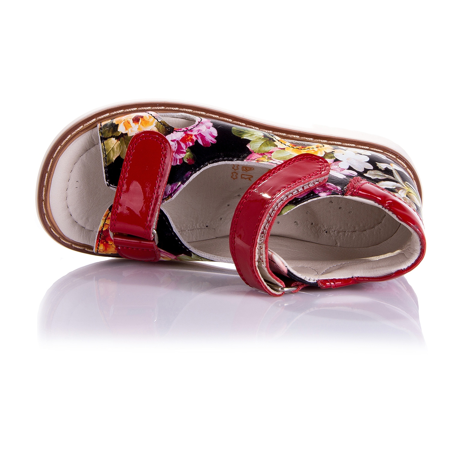 Босоножки ортопедические с цветным принтом. Сверху фиксируются двумя липучками. Снаружи и внутри кожаные. Высокая твердая пятка, супинатор и ортопедический каблук Томаса.
