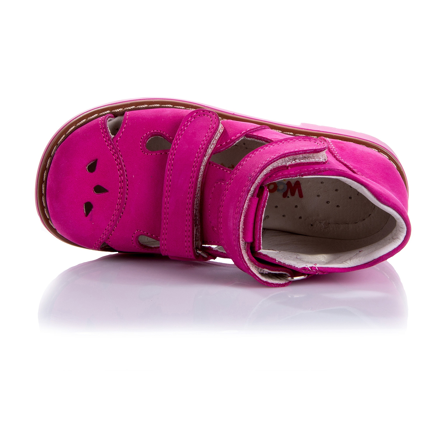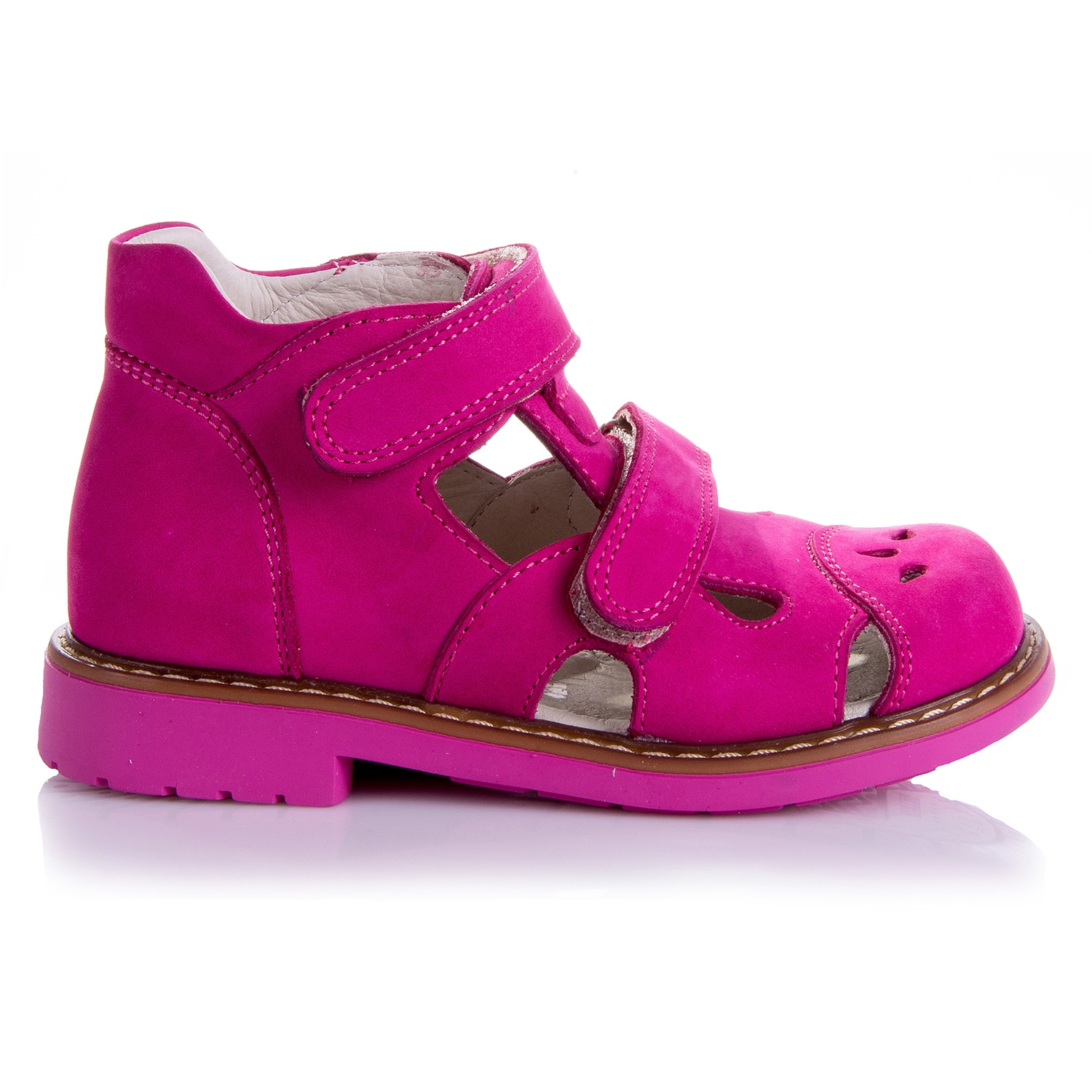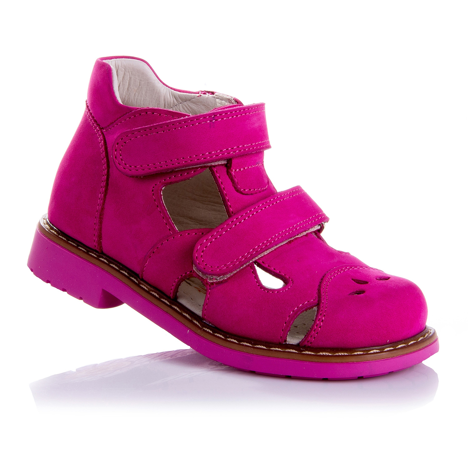Босоножки ортопедические розового цвета. Сверху регулируются двумя липучками. Снаружи нубук, внутри кожаные. Есть высокий твердый твердый задник, ортопедический супинатор и каблук Томаса.