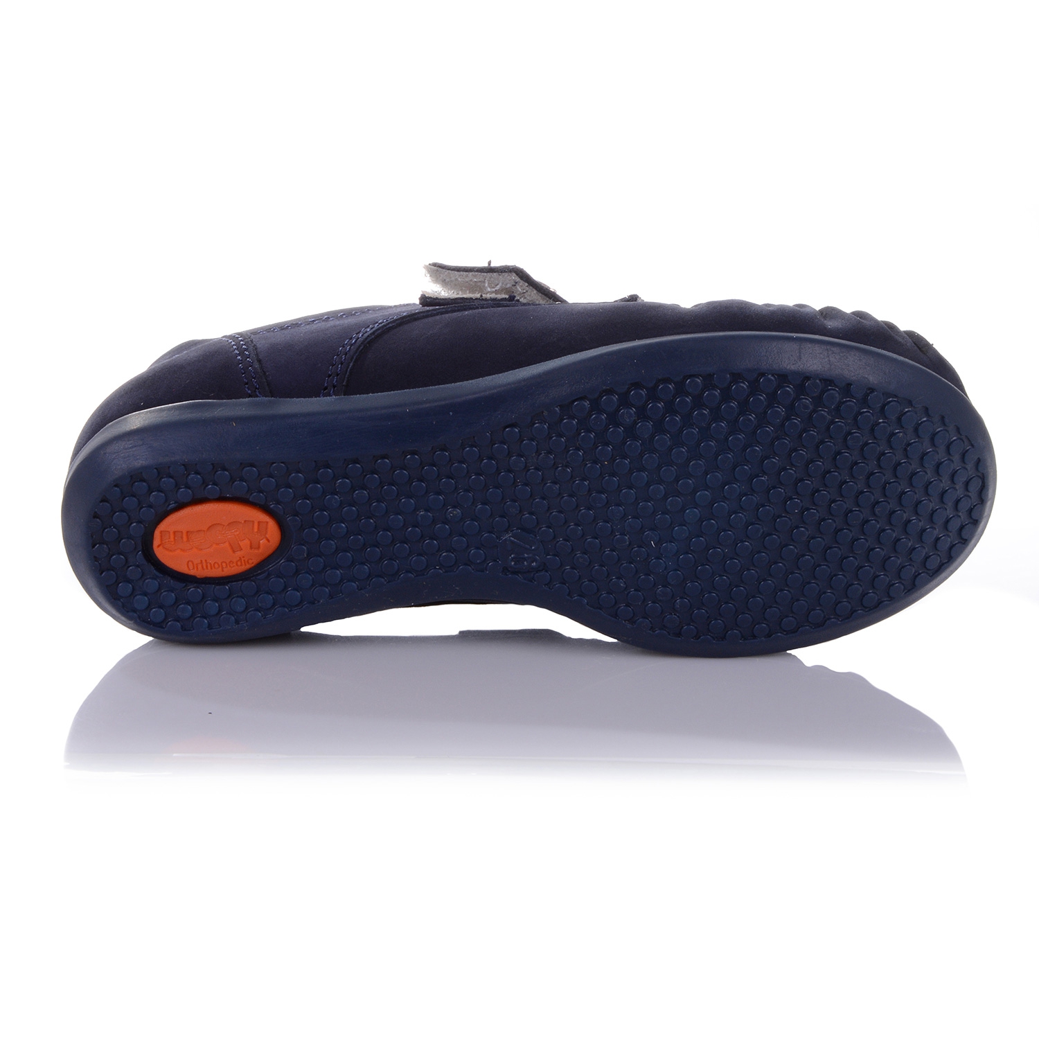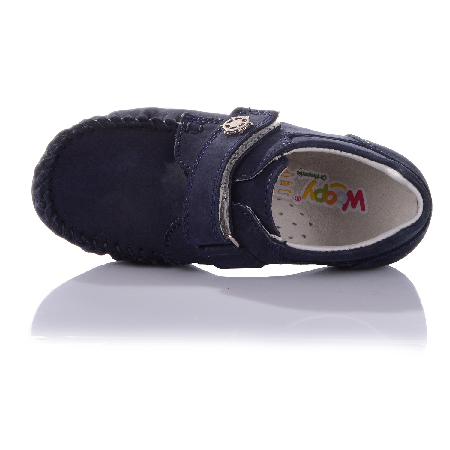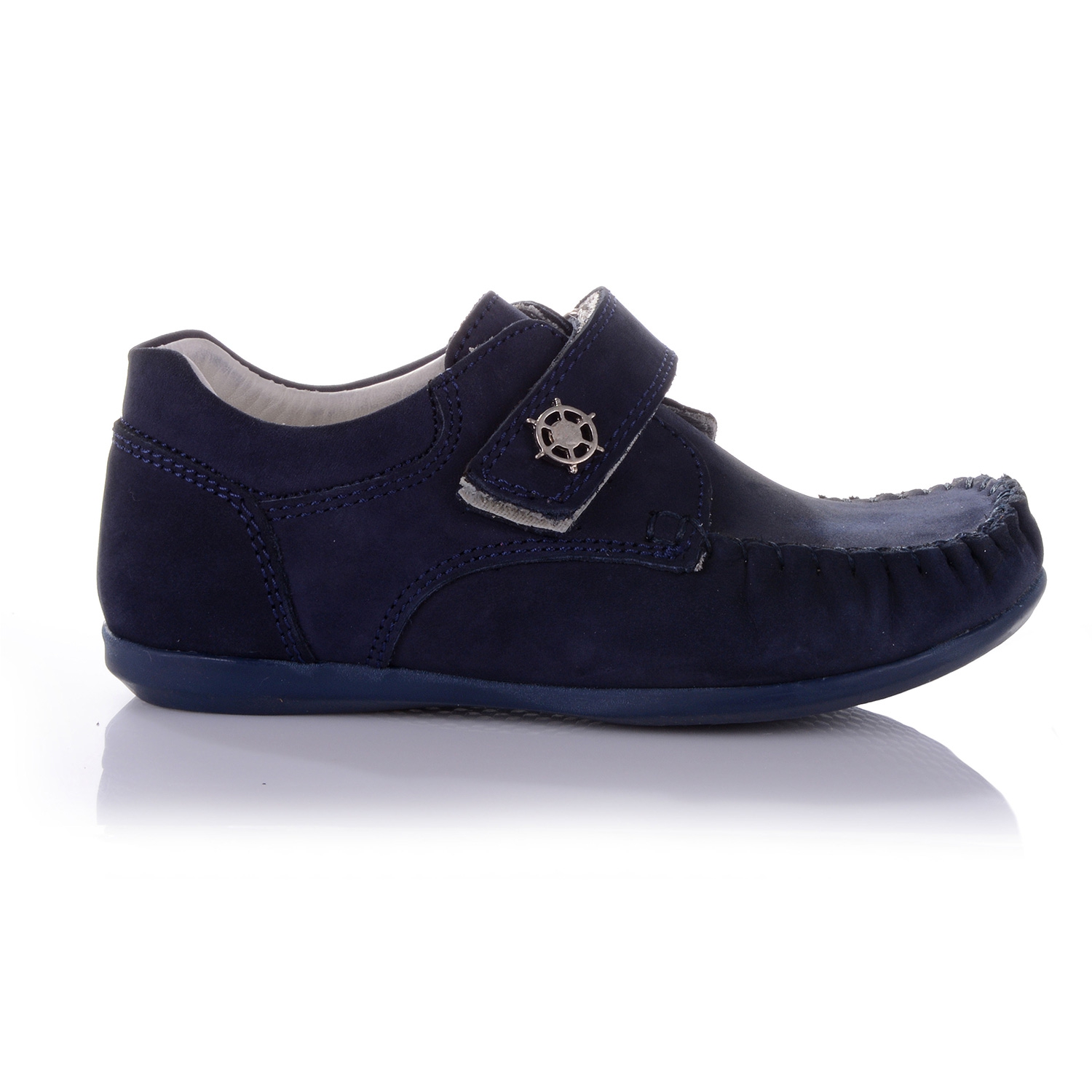 Мокасины темно-синего цвета. Сверху фиксируются липучкой. Снаружи нубук, внутри кожаные. Есть супинатор и твердая пятка.