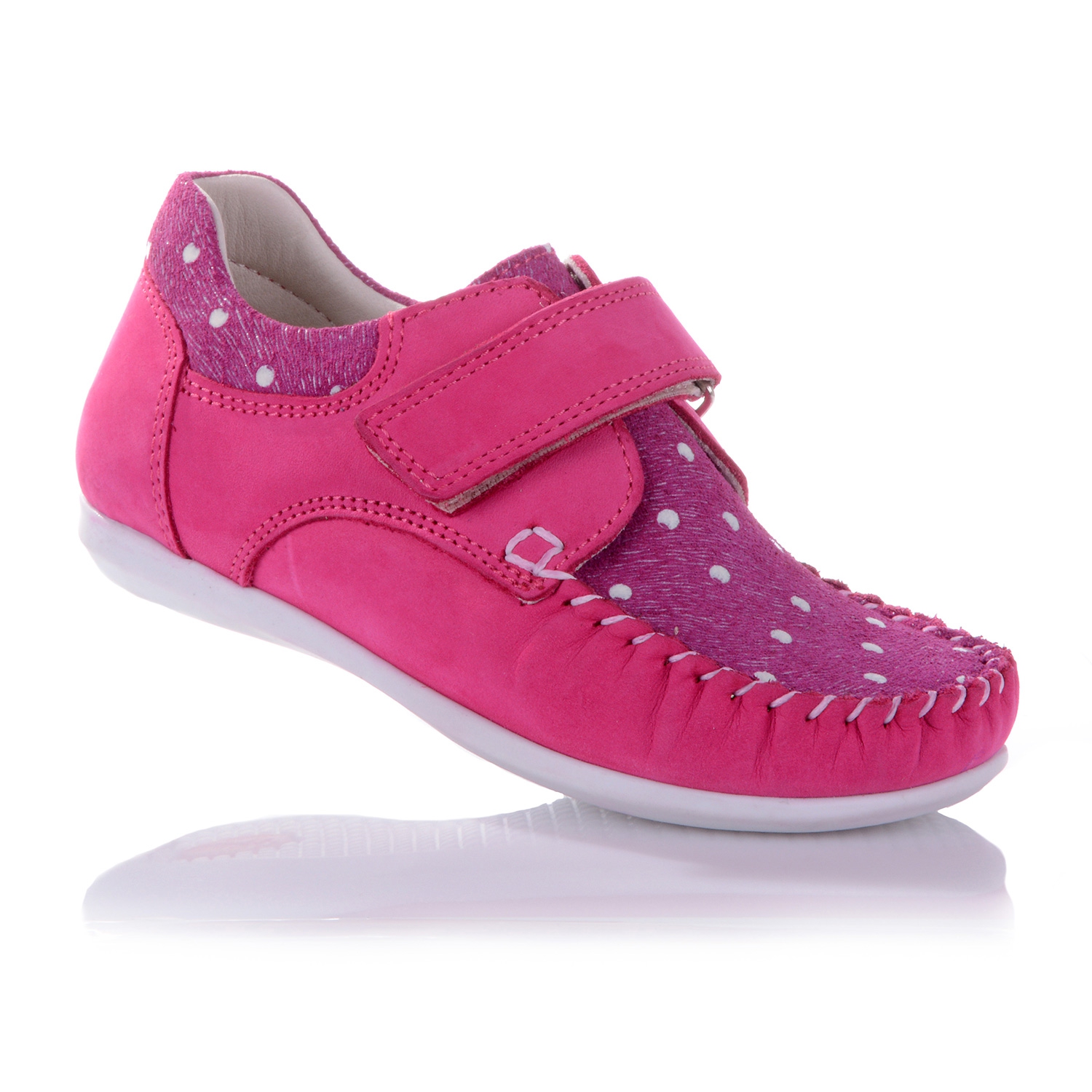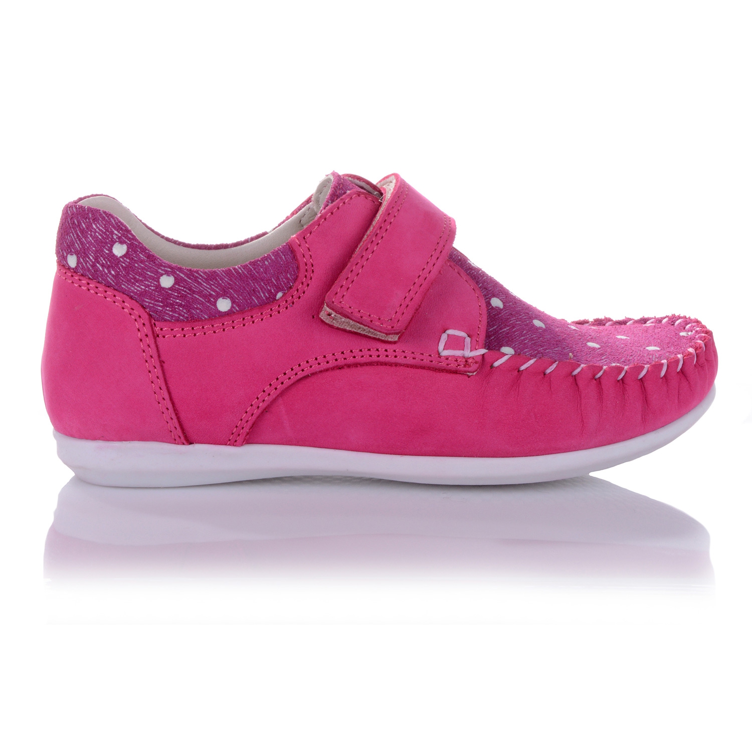 Мокасины ярко-розового цвета. Сверху фиксируются липучкой. Снаружи нубук, внутри кожаные. Есть супинатор и твердая пятка.
