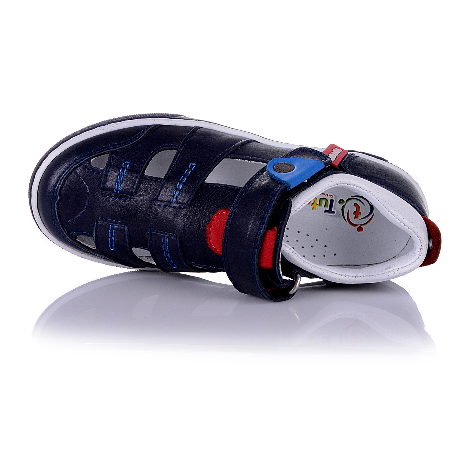 Сандали ортопедические темно-синего цвета с закрытым носком. Сверху фиксируются липучкой. Снаружи и внутри кожаные. Есть твердая пятка и супинатор.