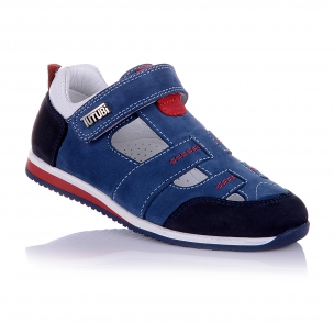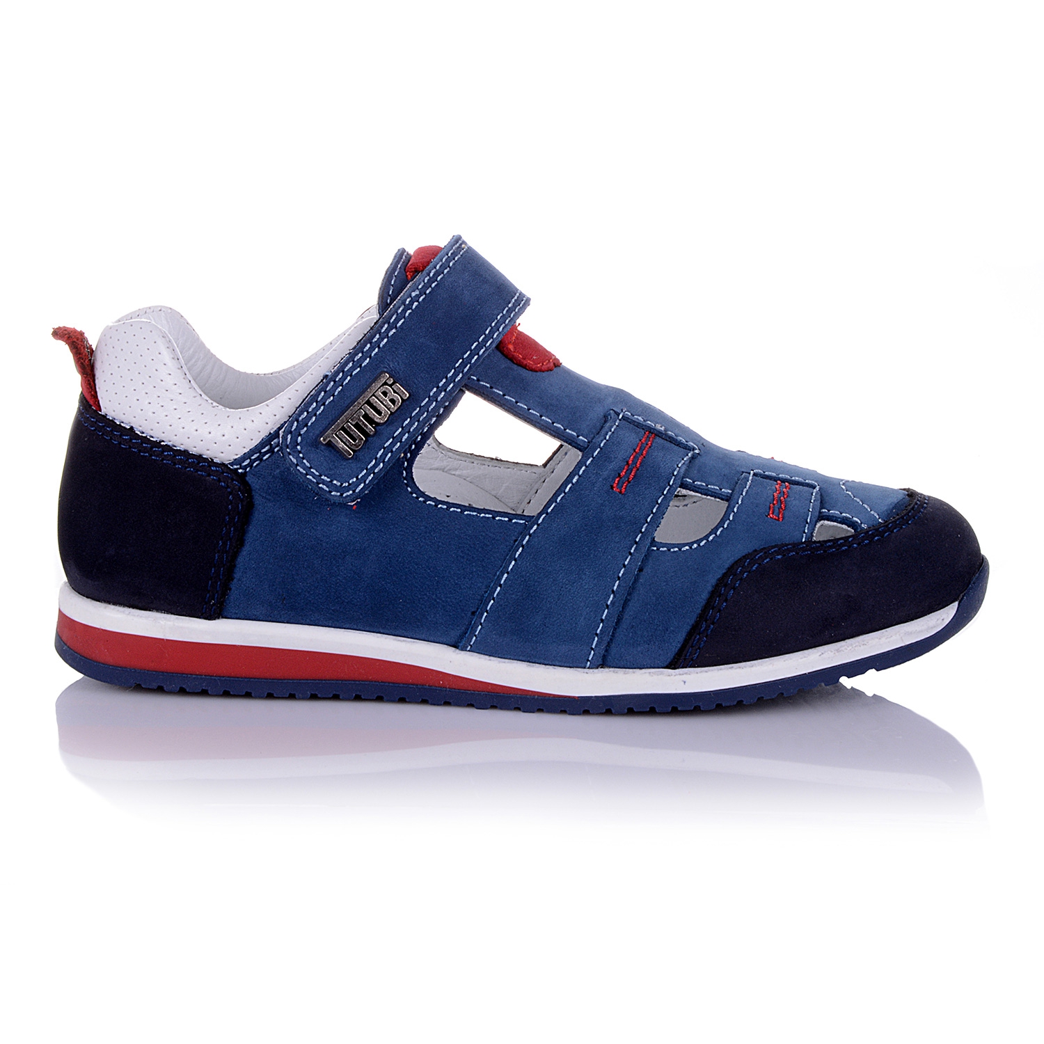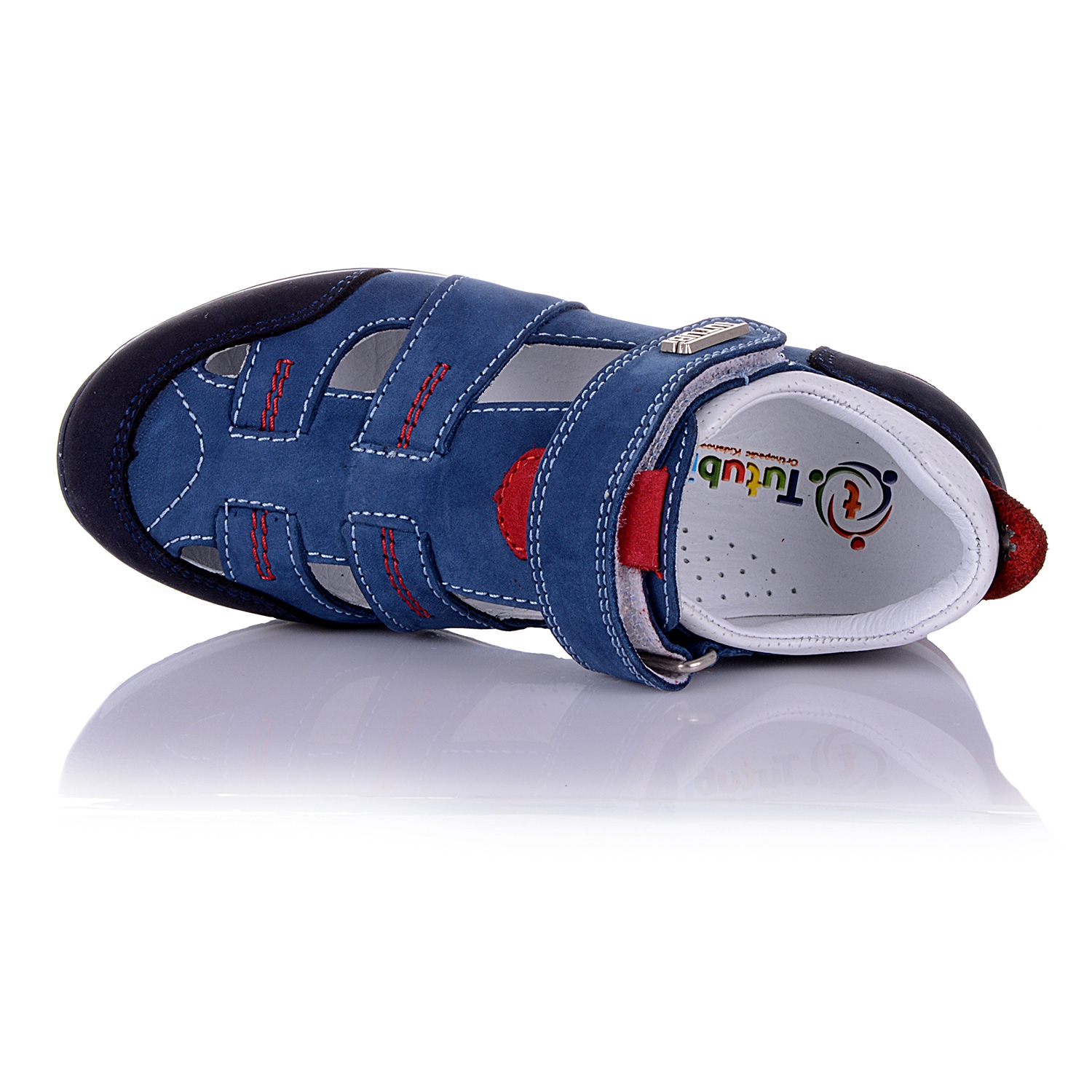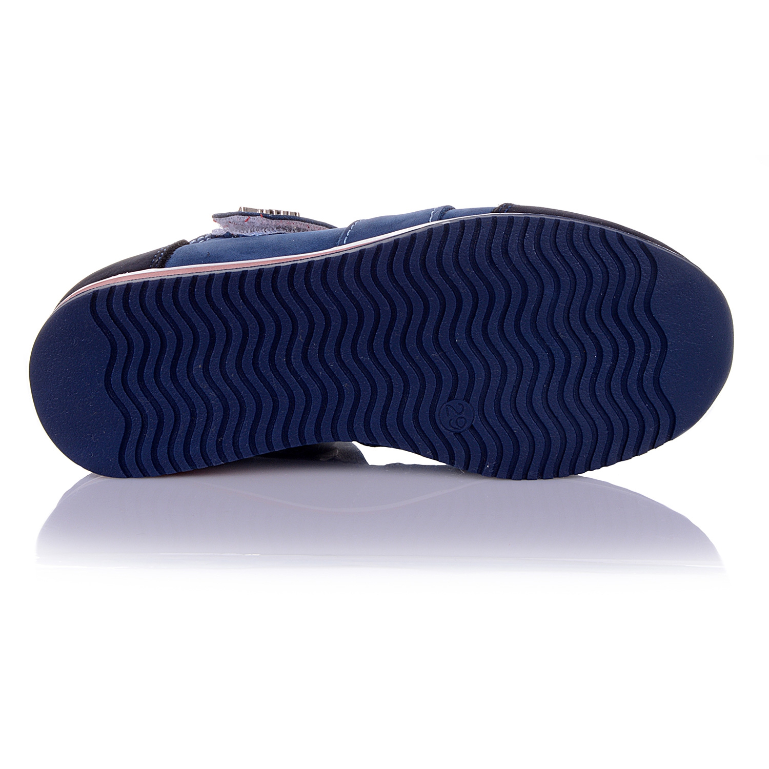 Сандали ортопедические синего цвета с закрытым носком. Сверху фиксируются липучкой. Снаружи нубук, внутри кожаные. Есть твердая пятка и супинатор.