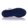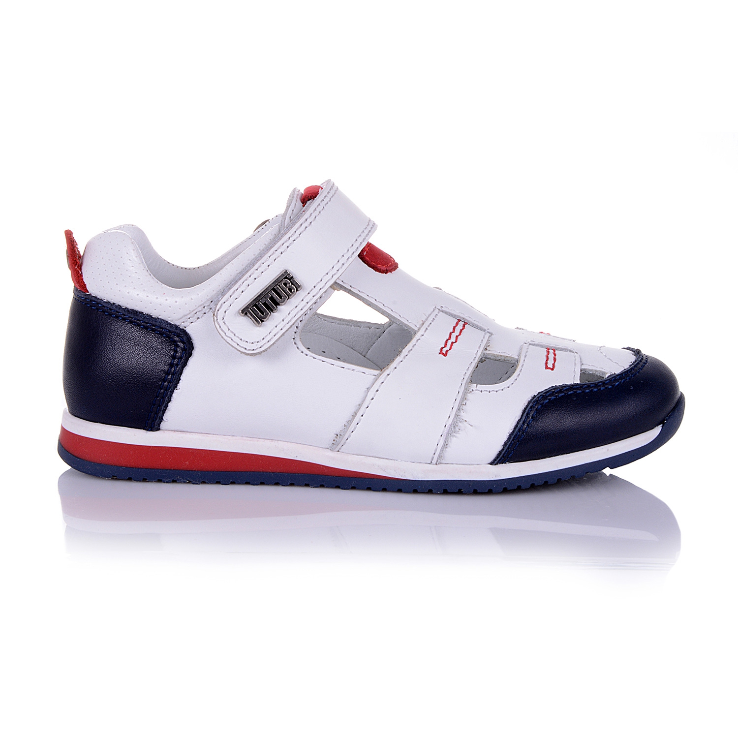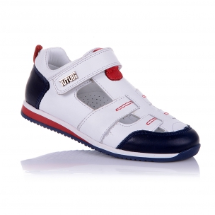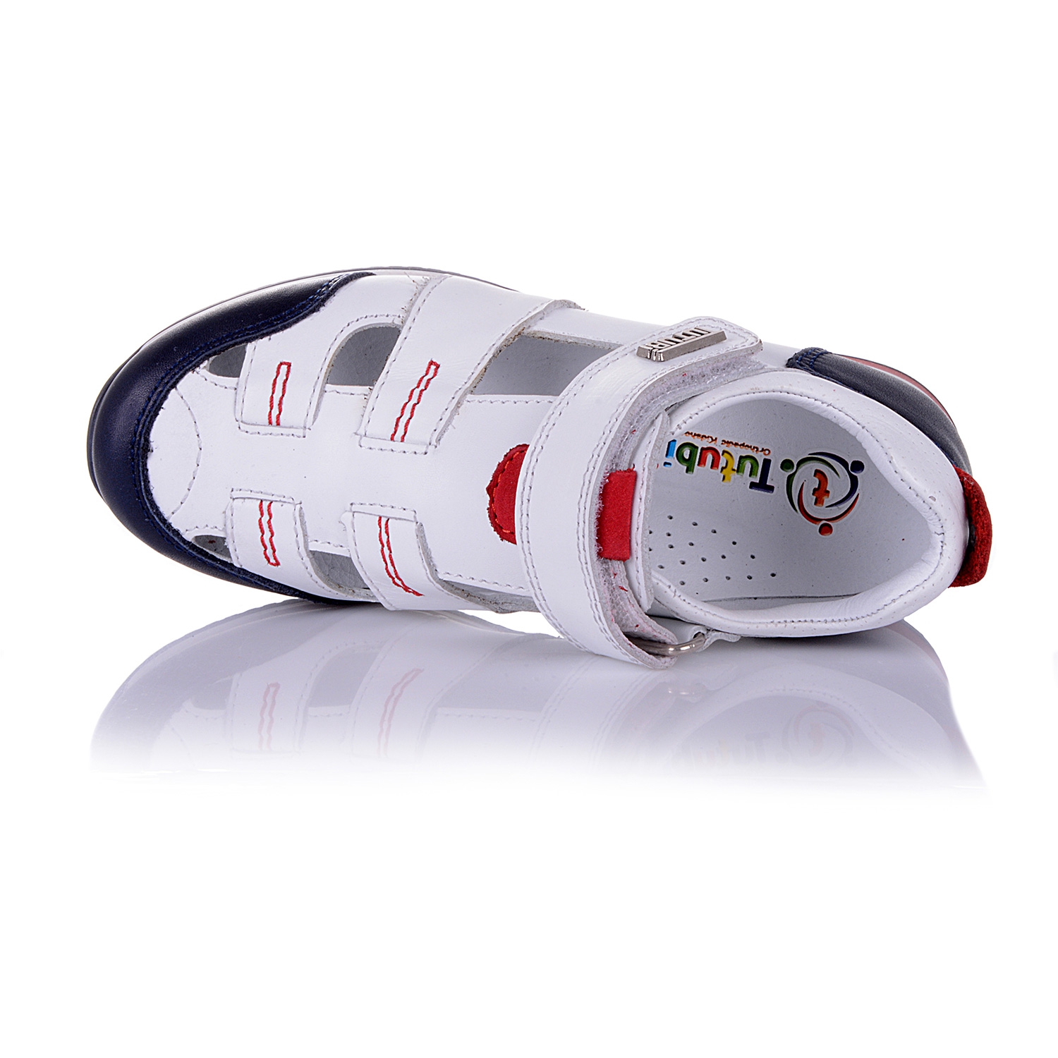 Сандали ортопедические белого цвета с темно-синими вставками с закрытым носком. Сверху фиксируются липучкой. Снаружи и внутри кожаные. Есть твердая пятка и супинатор.