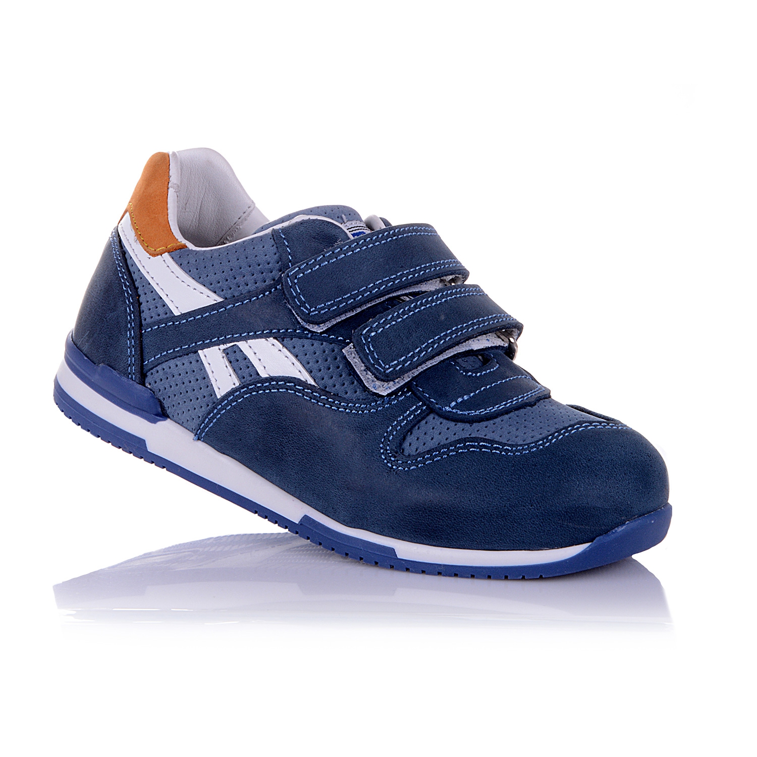 Кроссовки синего цвета. Сверху регулируются двумя липучками. Снаружи кожа + нубук, внутри - кожа. Есть твердый задник и супинатор.