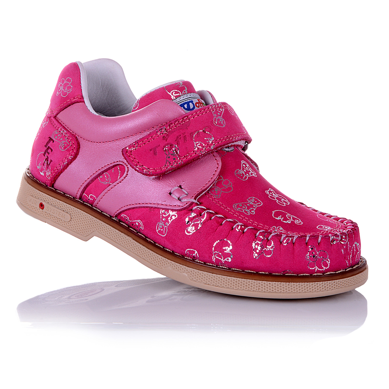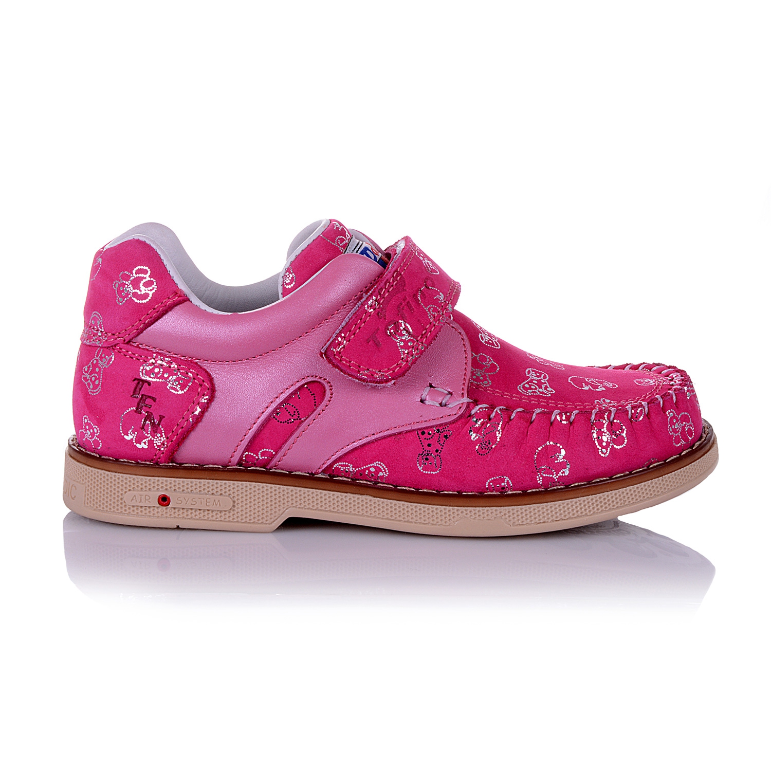 Мокасины ортопедические ярко-розового цвета. Сверху фиксируются липучкой. Снаружи нубук + кожа, внутри кожаные. Есть твердая пятка, супинатор и ортопедический каблук Томаса.