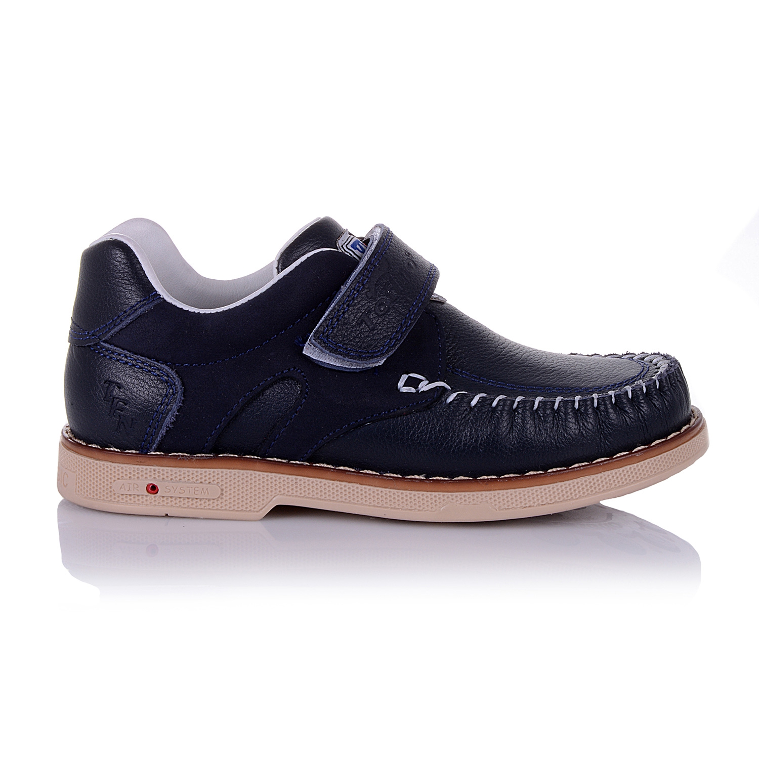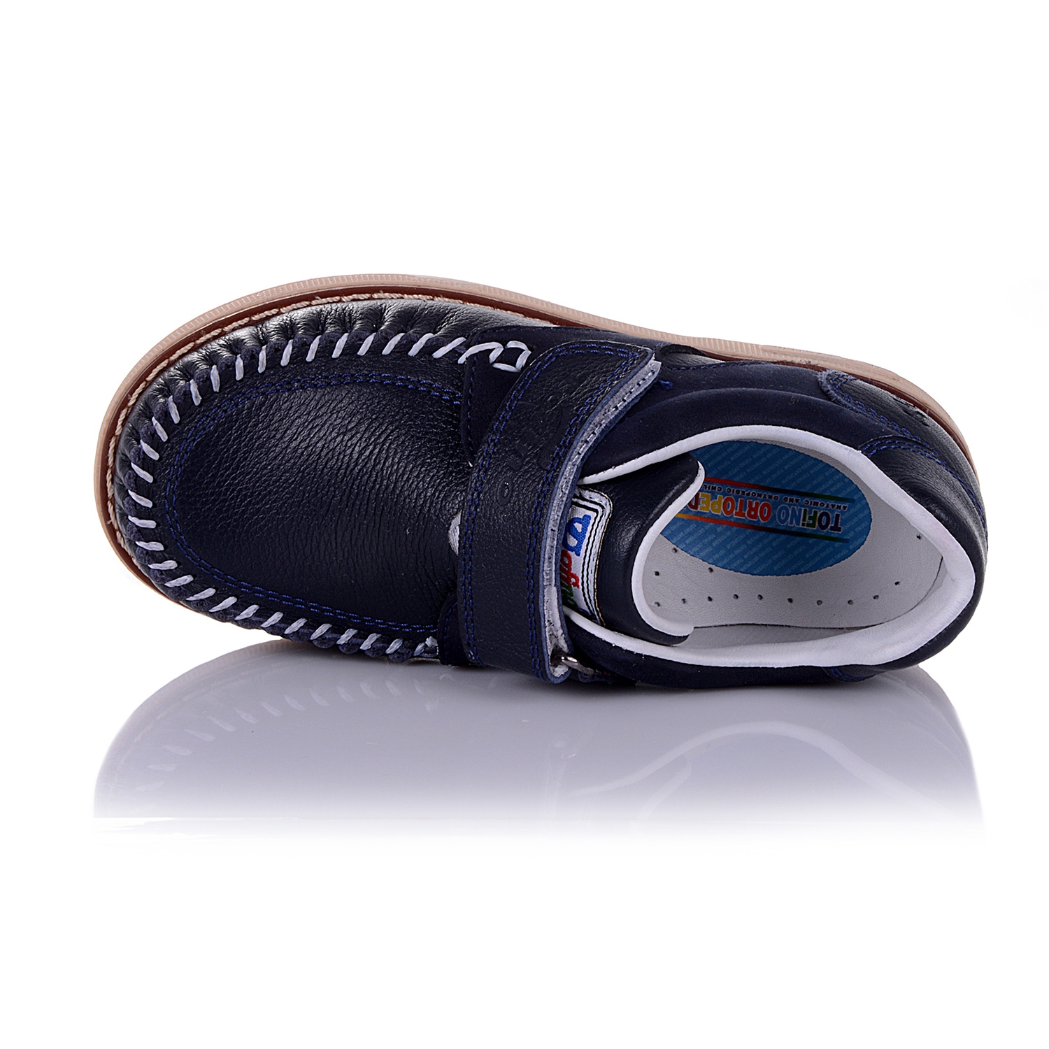 Мокасины ортопедические темно-синего цвета. Сверху фиксируются липучкой. Снаружи и внутри кожаные. Есть твердая пятка, супинатор и ортопедический каблук Томаса.