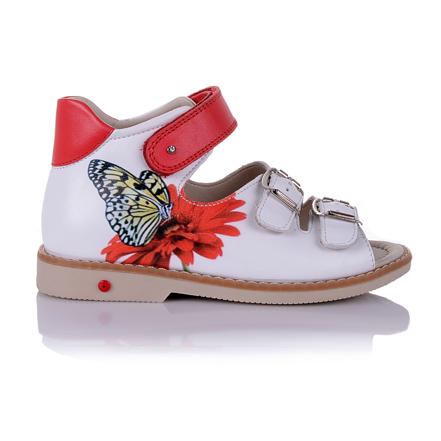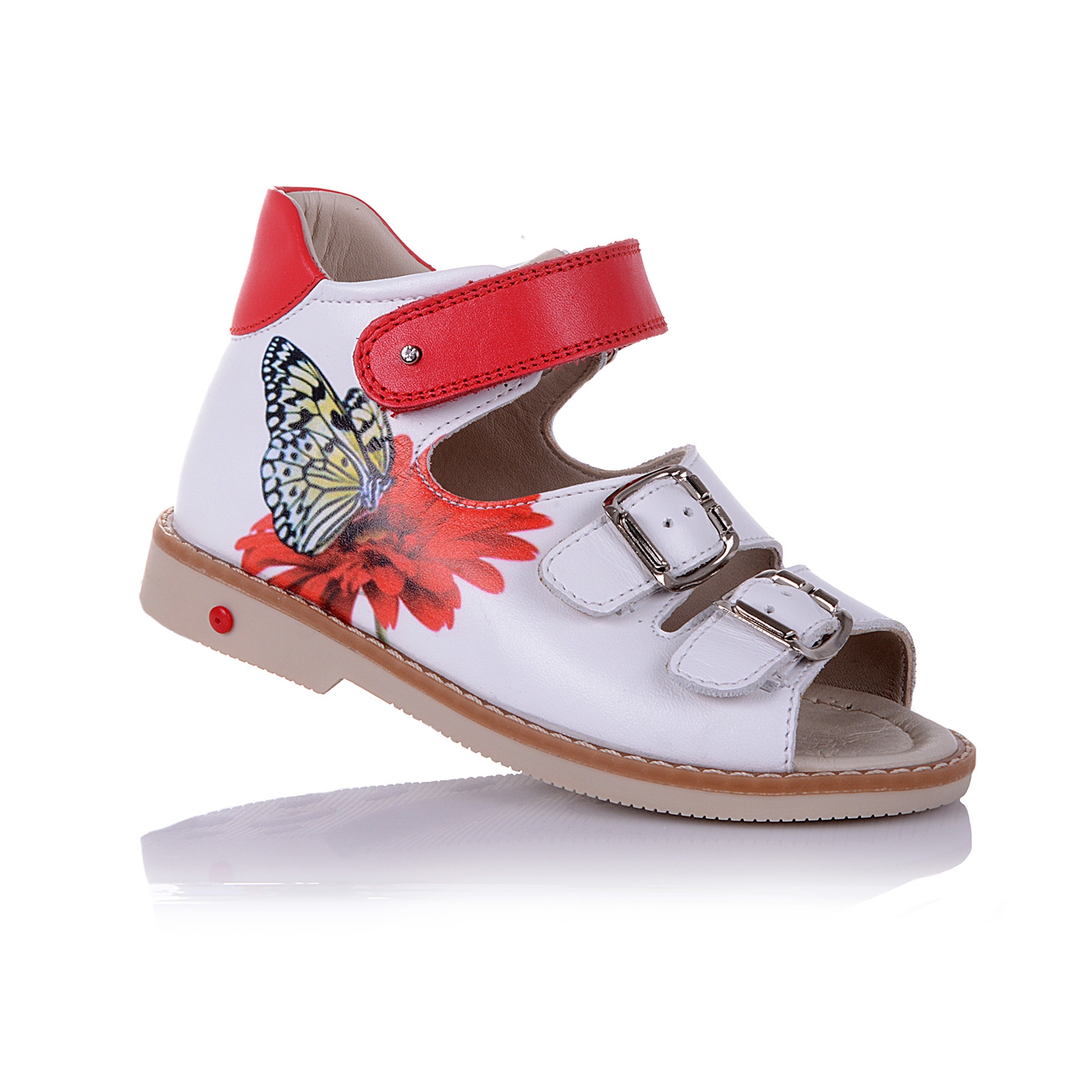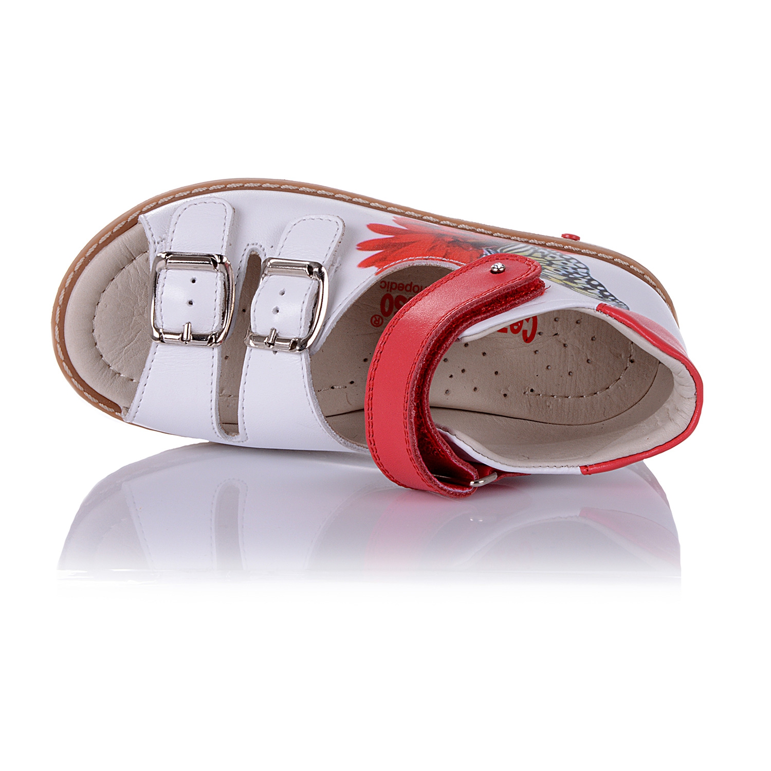 Босоножки ортопедические белого цвета с цветным принтом. Сверху фиксируются липучкой и двумя застежками. Снаружи и внутри кожаные. Высокая твердая пятка, супинатор и ортопедический каблук Томаса.