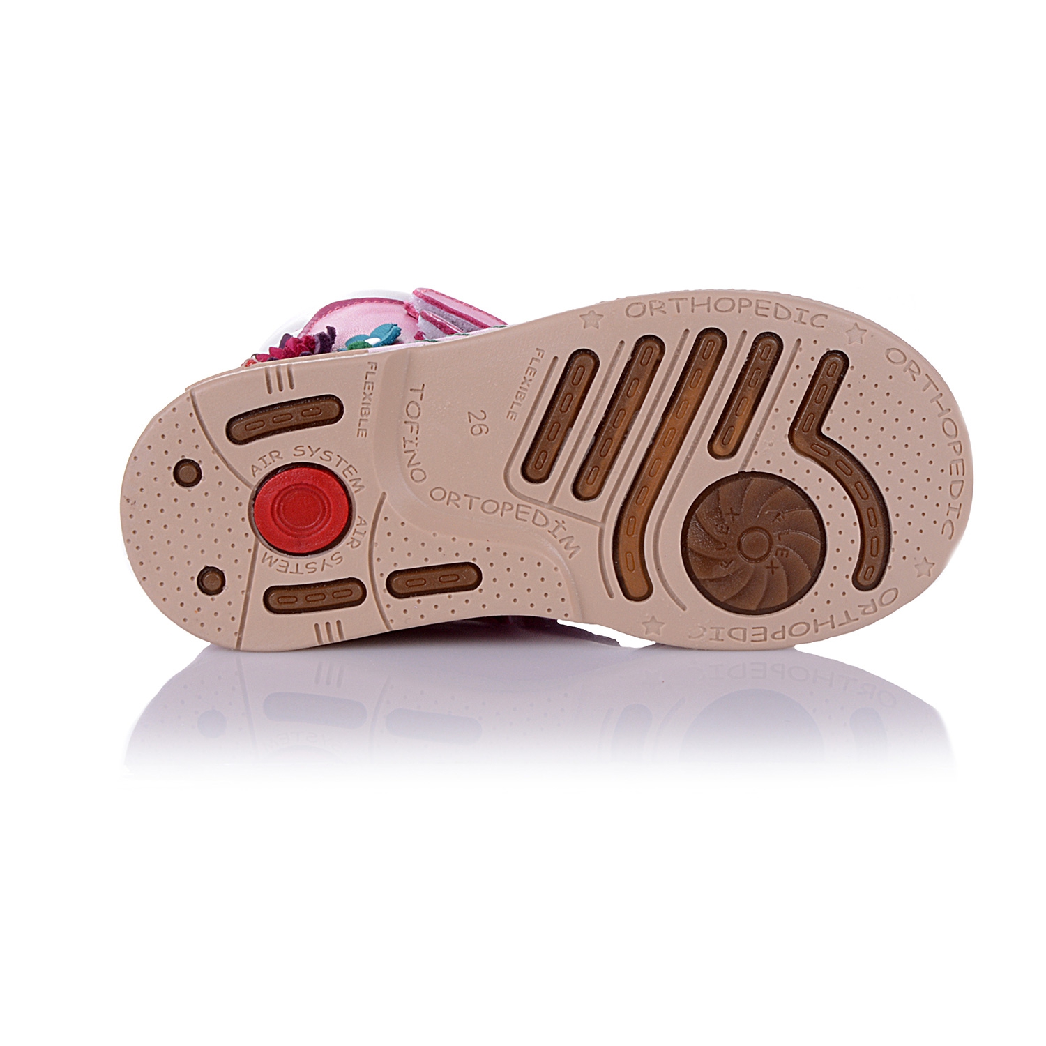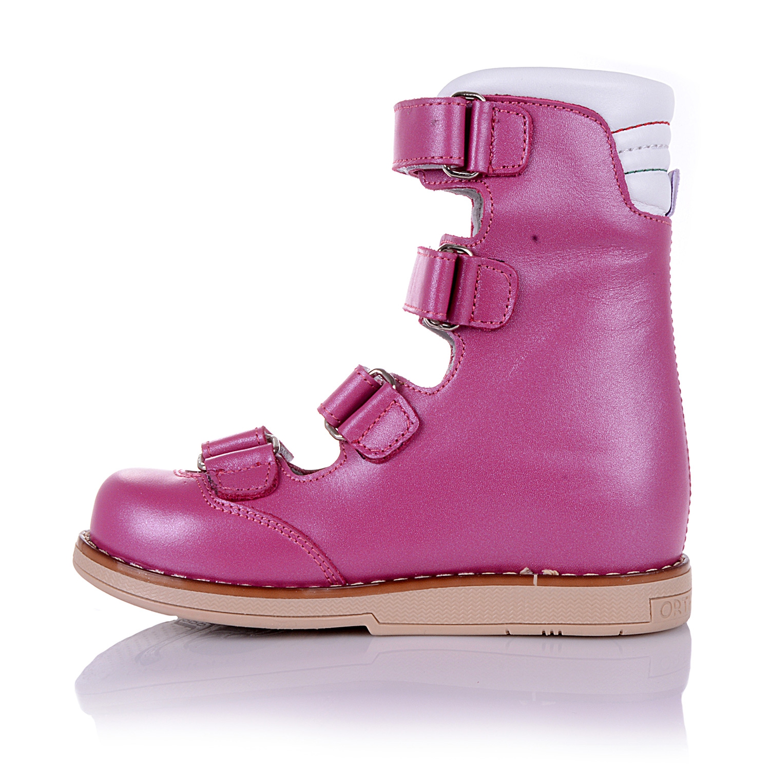 Лечебные босоножки-берцы розового цвета с закрытым носком. Сверху фиксируются четырьмя липучками. Снаружи и внутри кожаные. Завышенная твердая пятка, супинатор и ортопедический каблук Томаса.