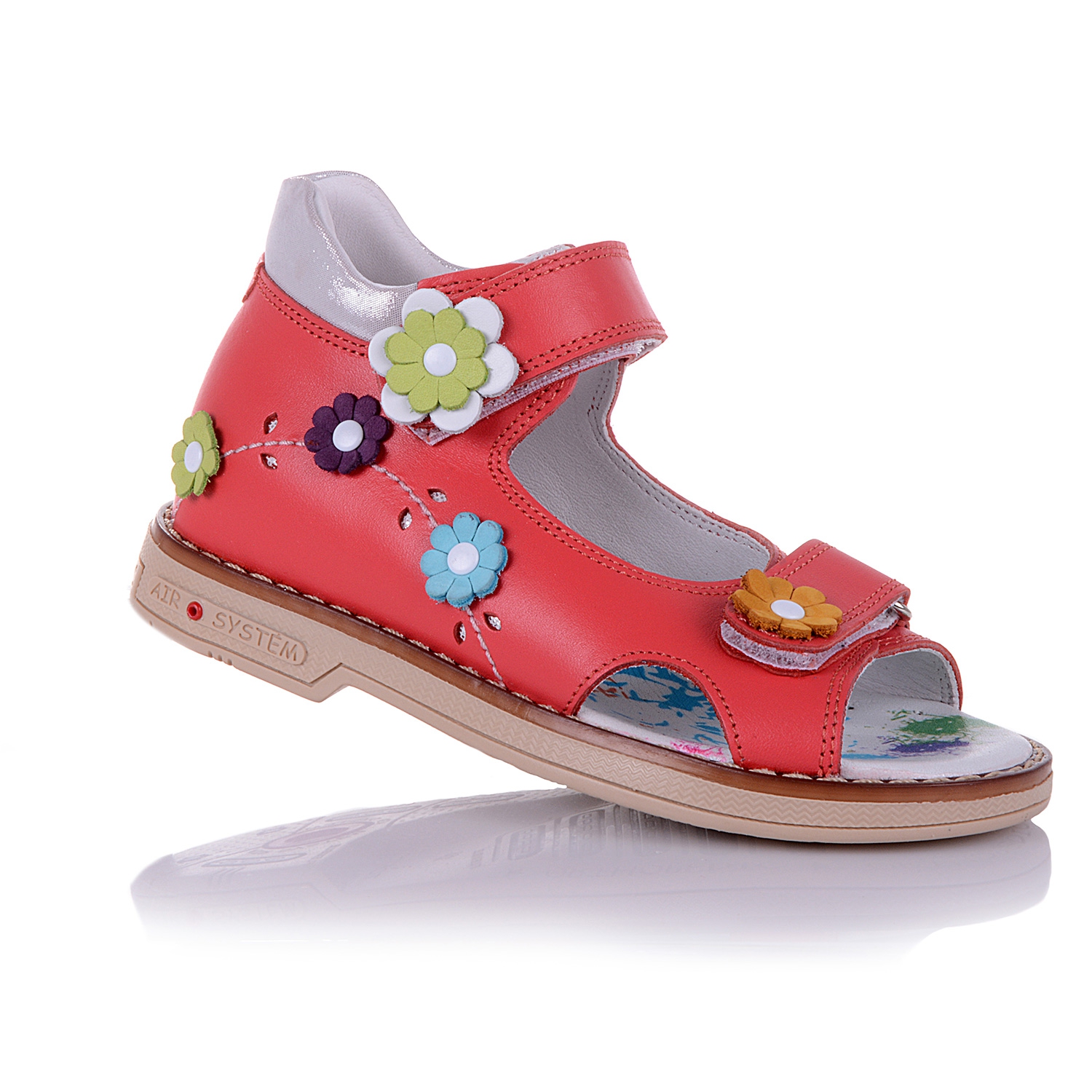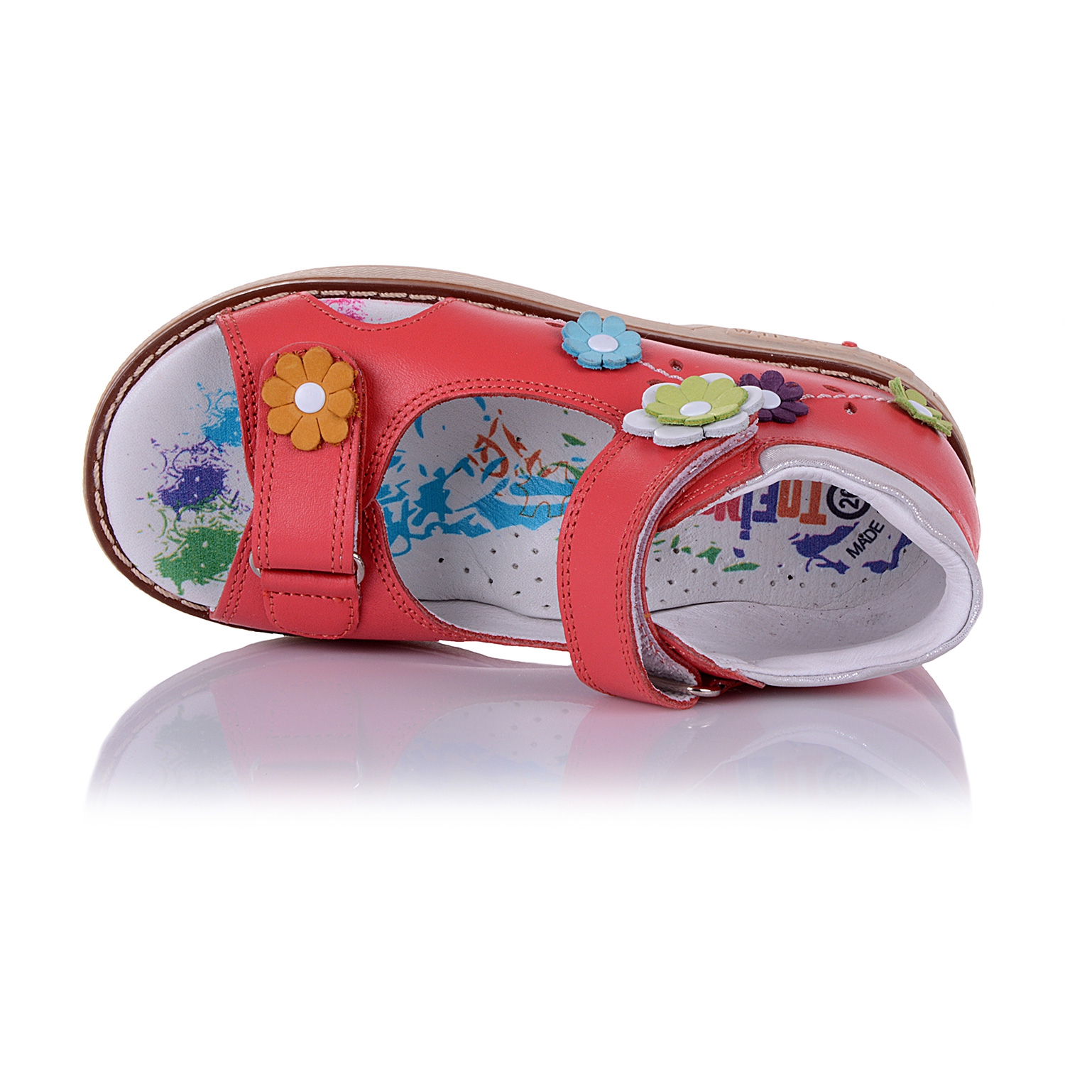 Ортопедические босоножки кораллового цвета с разноцветными цветочками. Сверху фиксируются двумя липучками. Снаружи кожа и внутри кожаные. Высокая твердая пятка, супинатор и ортопедический каблук Томаса.
