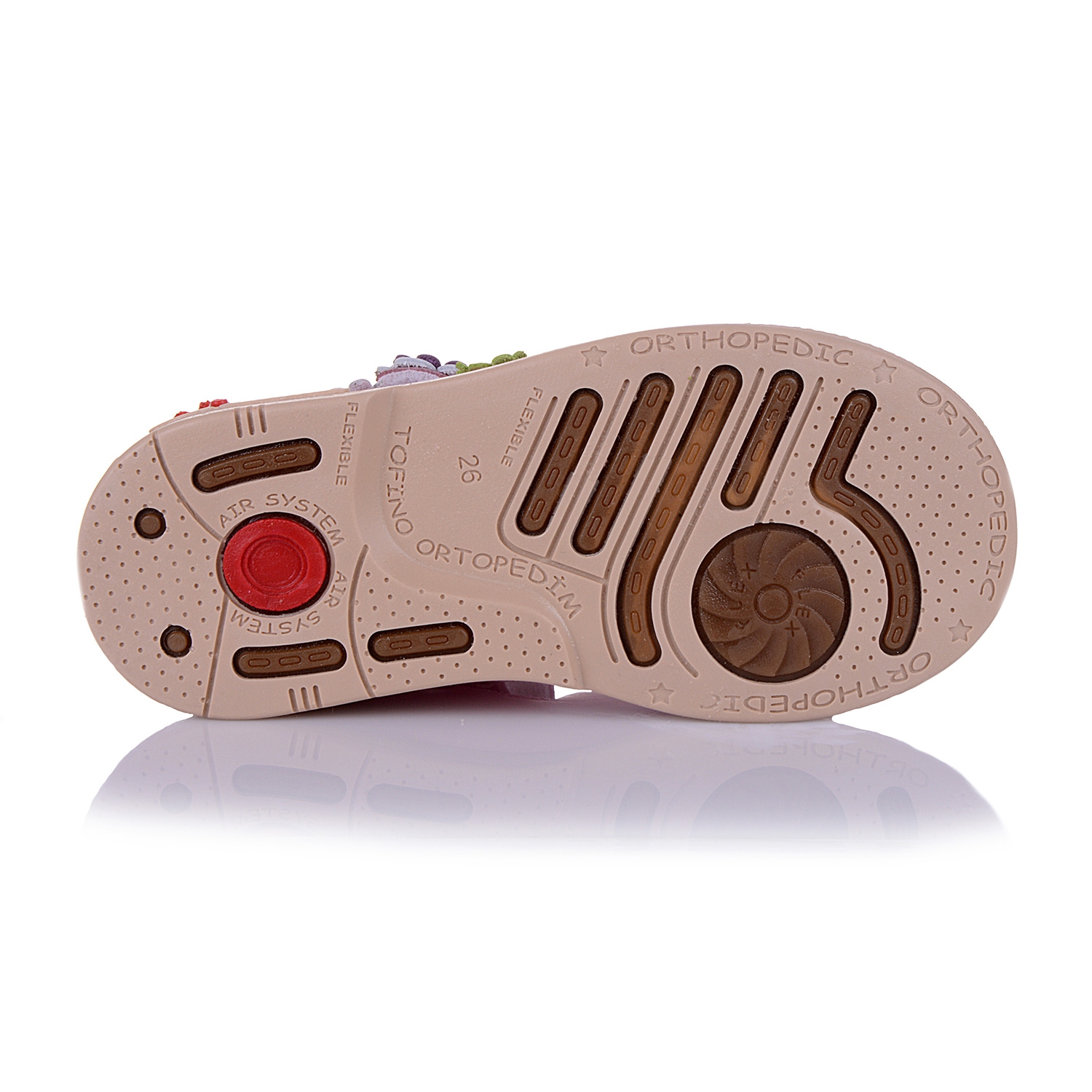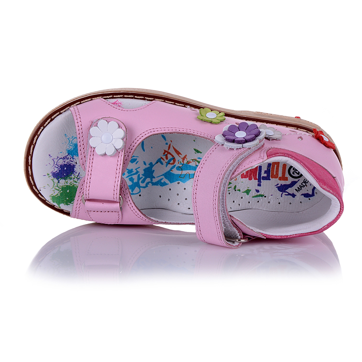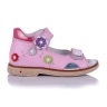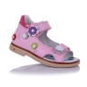 Ортопедические босоножки розового цвета с разноцветными цветочками. Сверху фиксируются двумя липучками. Снаружи кожа и внутри кожаные. Высокая твердая пятка, супинатор и ортопедический каблук Томаса.