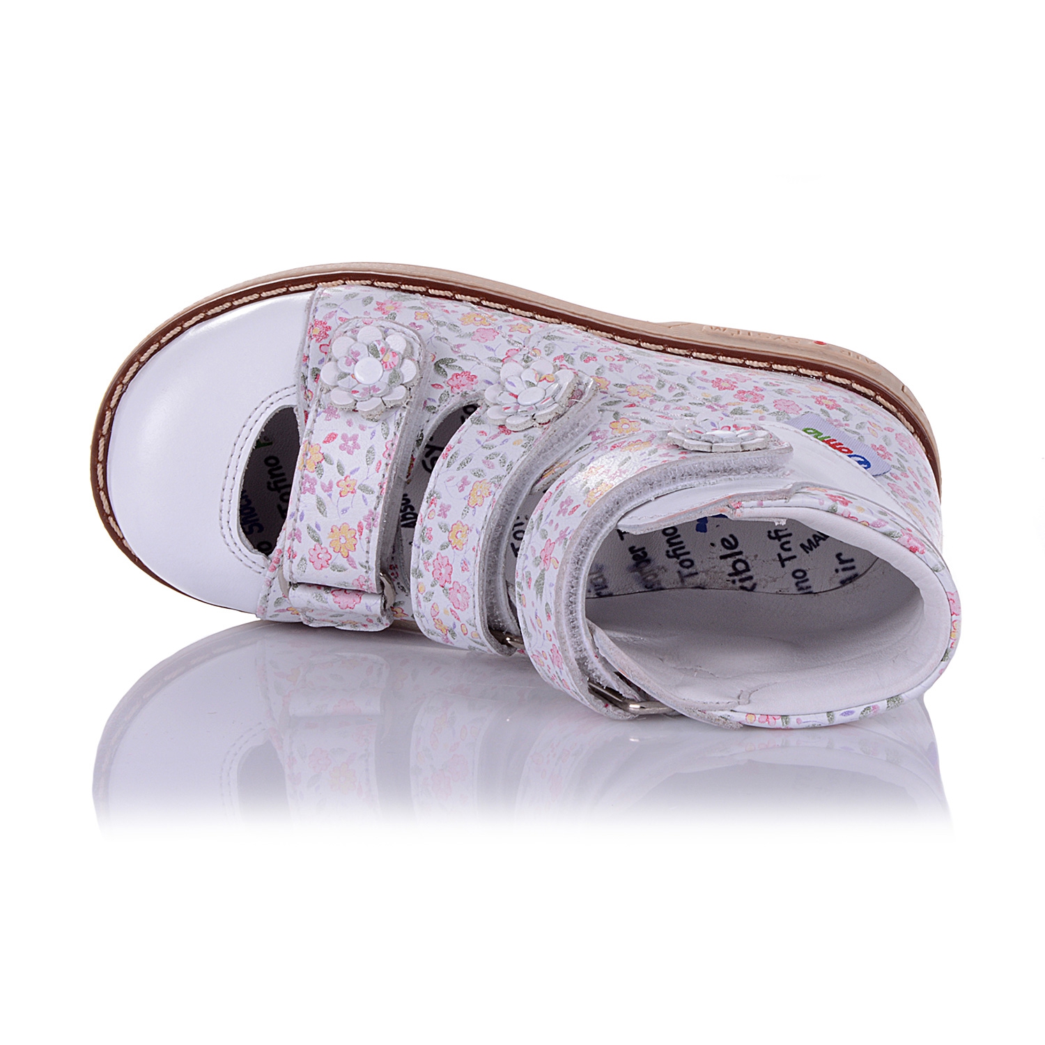 Босоножки-берцы ортопедические с разноцветными цветочками (закрытый носок). Сверху фиксируются тремя липучками. Снаружи и внутри кожаные. Завышенная твердая пятка, супинатор и ортопедический каблук Томаса.