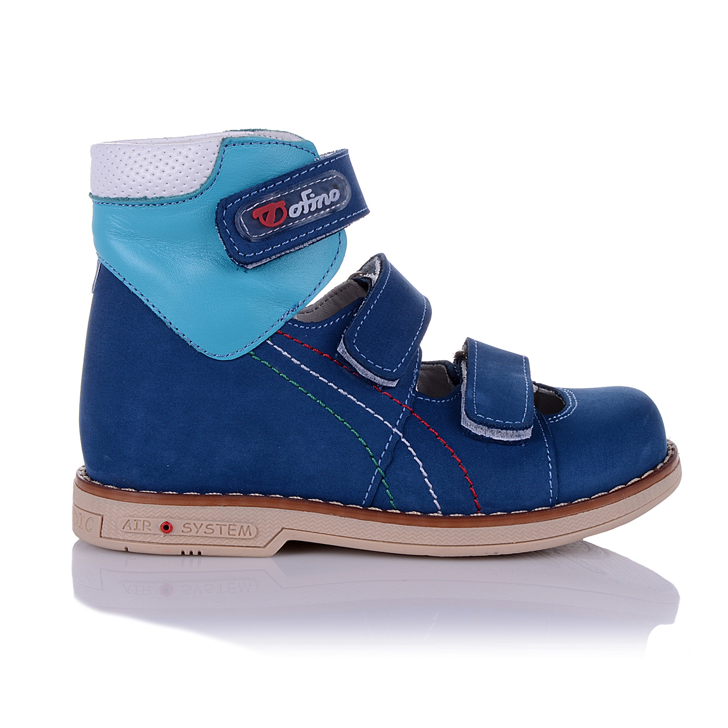 Босоножки-берцы ортопедические с завышенной пяткой синего цвета с закрытым носком. Сверху фиксируются тремя липучками. Снаружи нубук, внутри кожаные. Завышенная твердая пятка, супинатор и ортопедический каблук Томаса.