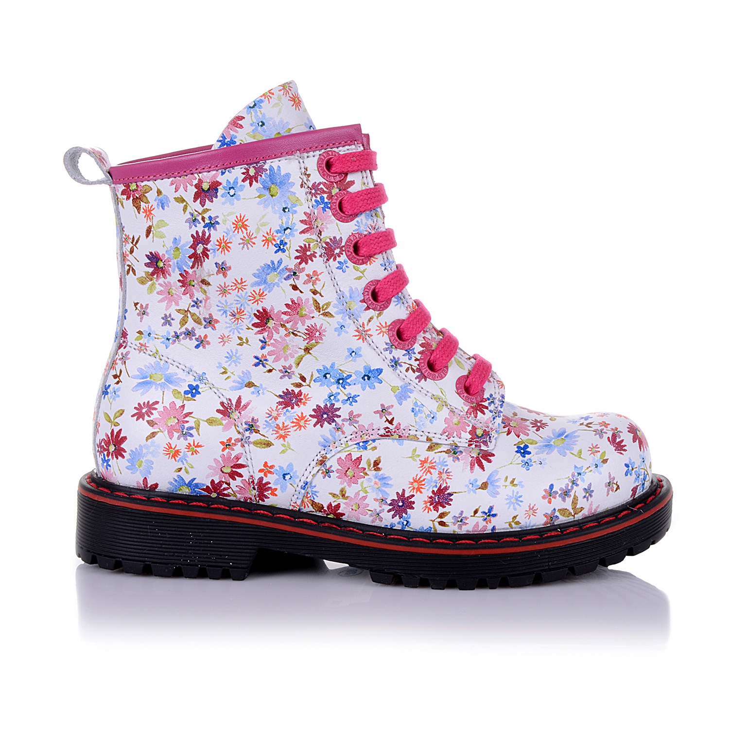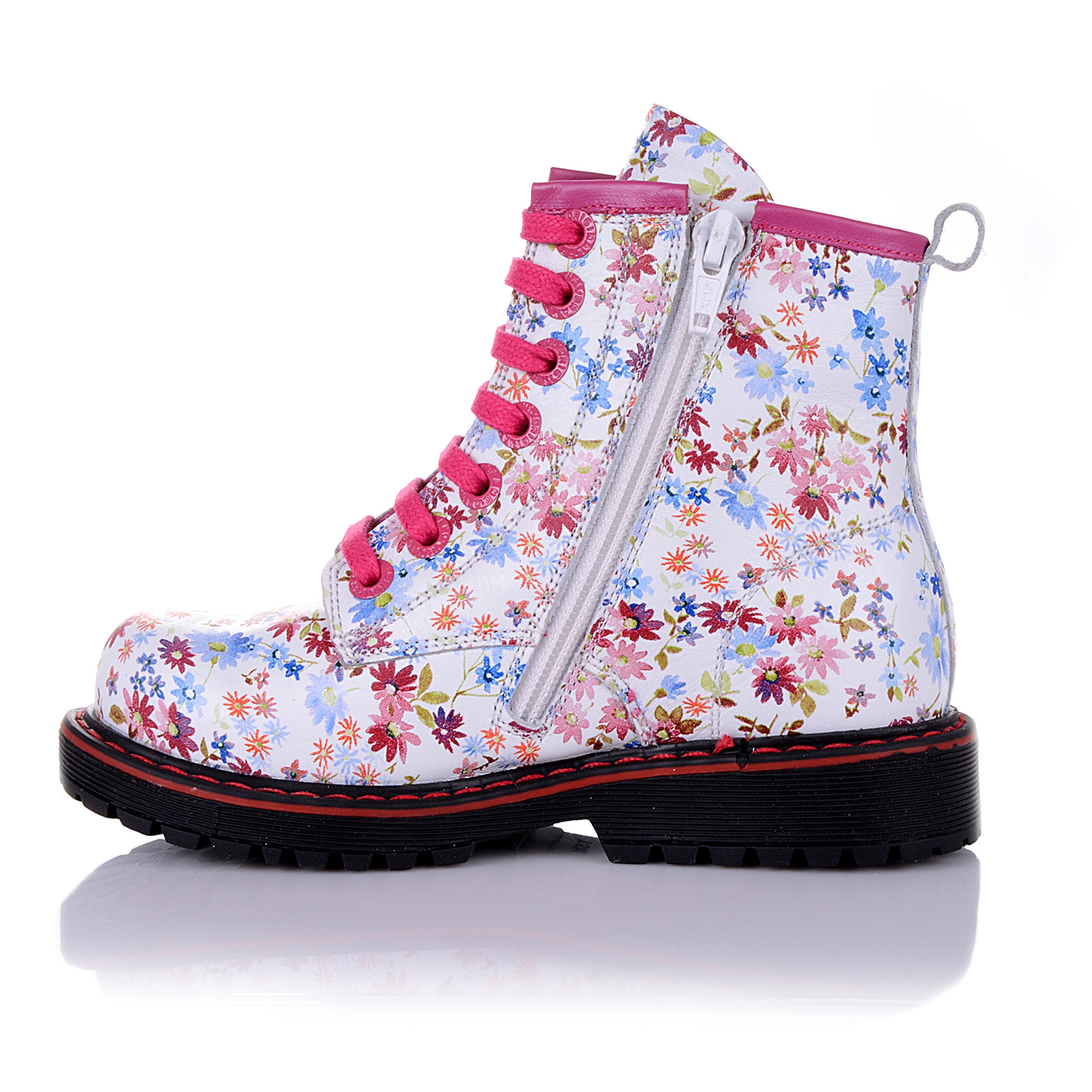 Демисезонные ортопедические ботинки с цветным принтом. Сверху регулируются шнурками, С внутренней стороны - на молнии. Снаружи кожа, внутри - на флисе. Есть ортопедический каблук Томаса, твердая пятка и супинатор.