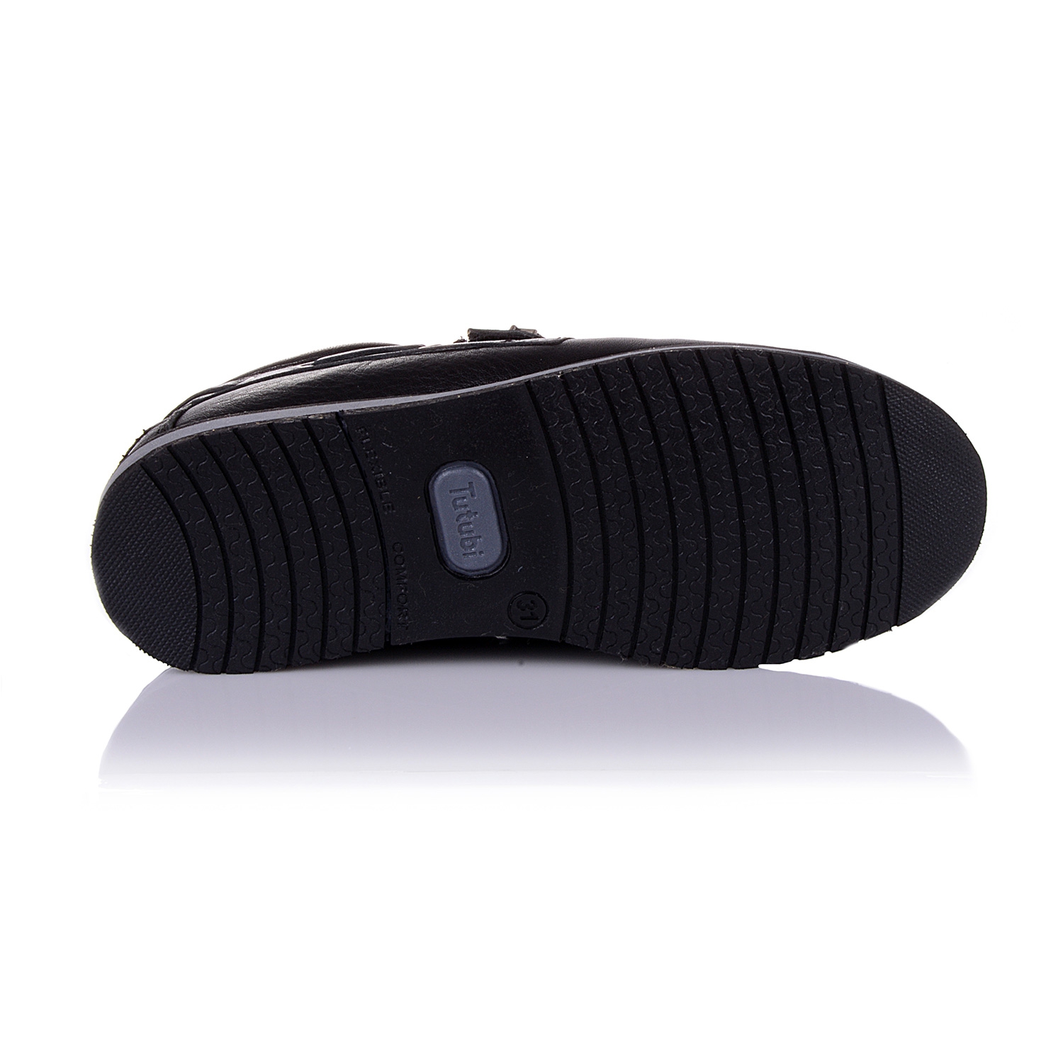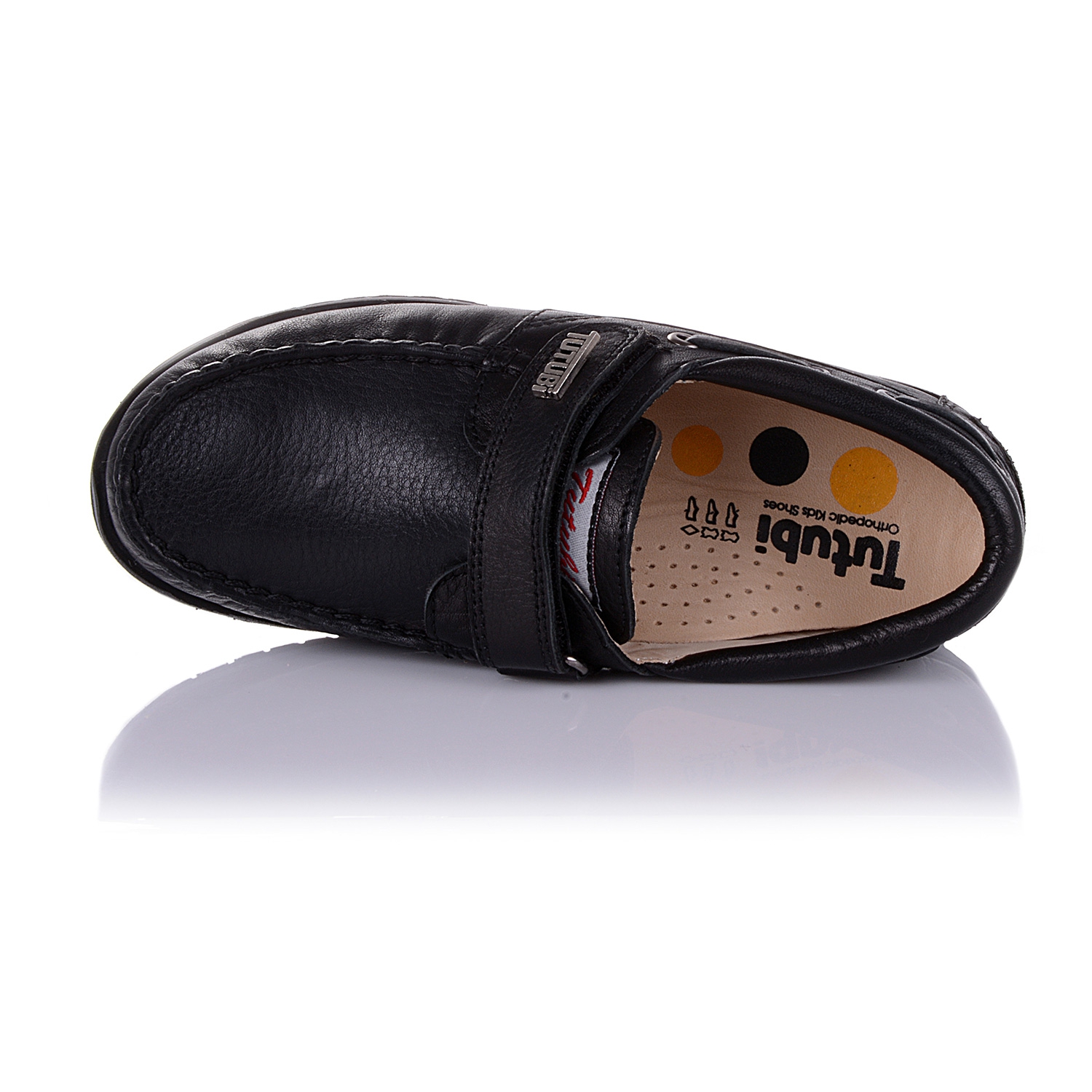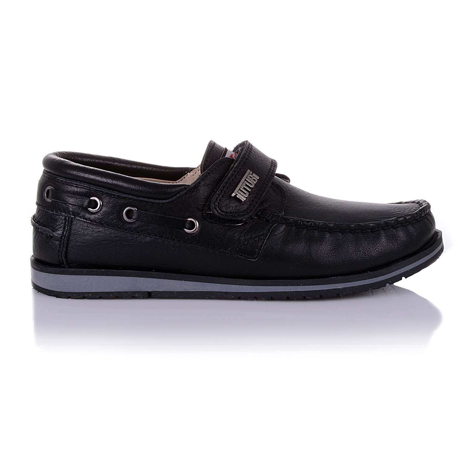Мокасины черного цвета. Сверху регулируются липучкой. Снаружи и внутри кожаные. Есть твердый задник и супинатор.