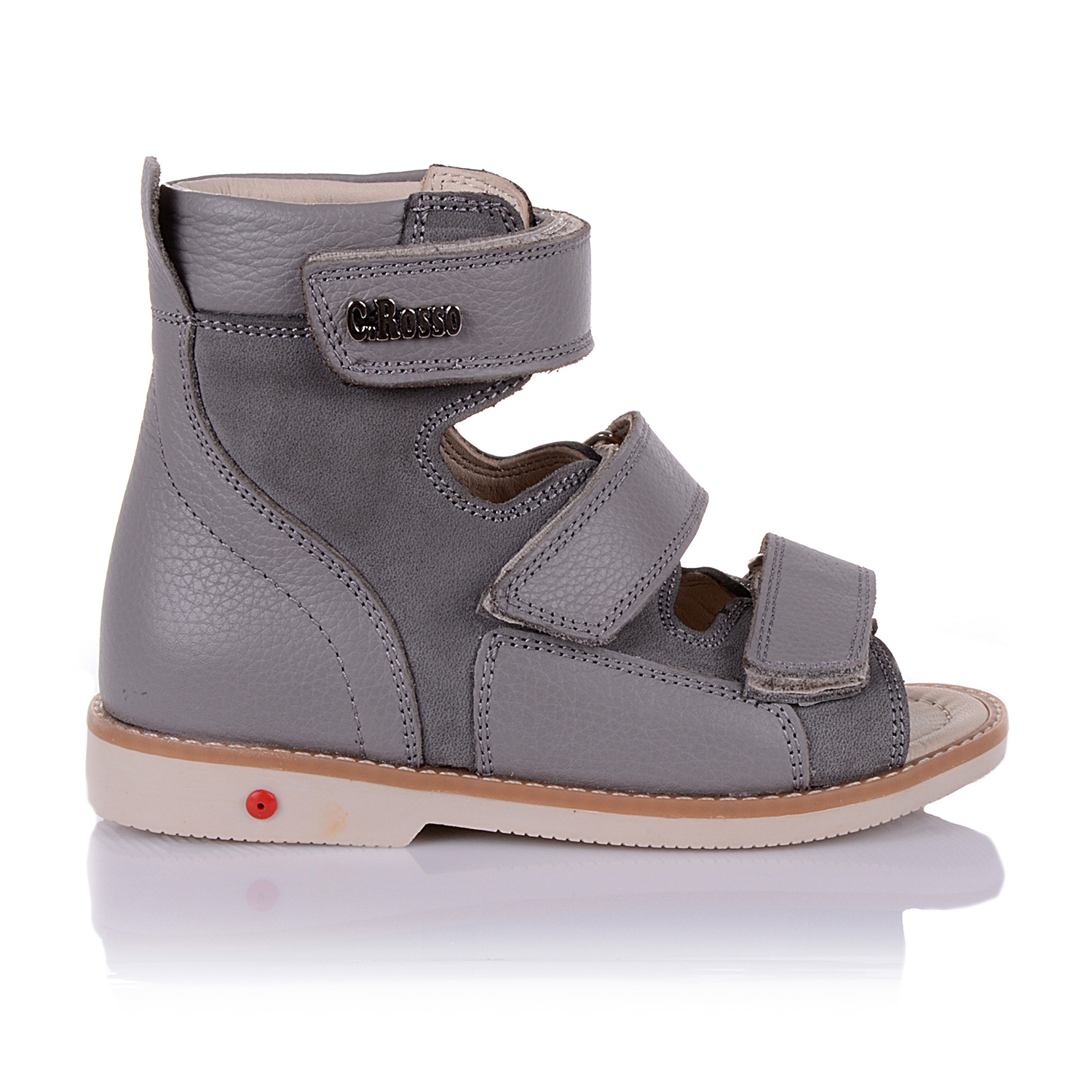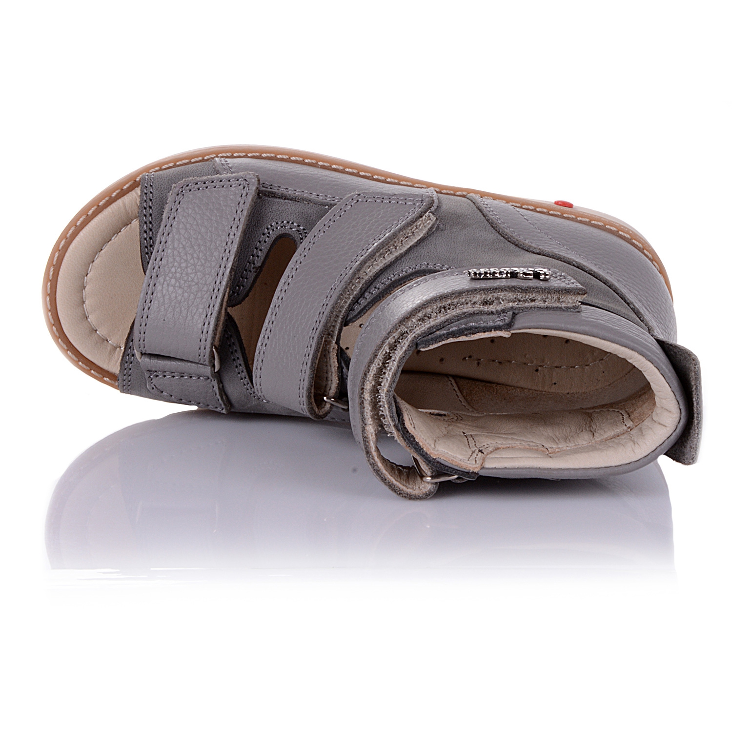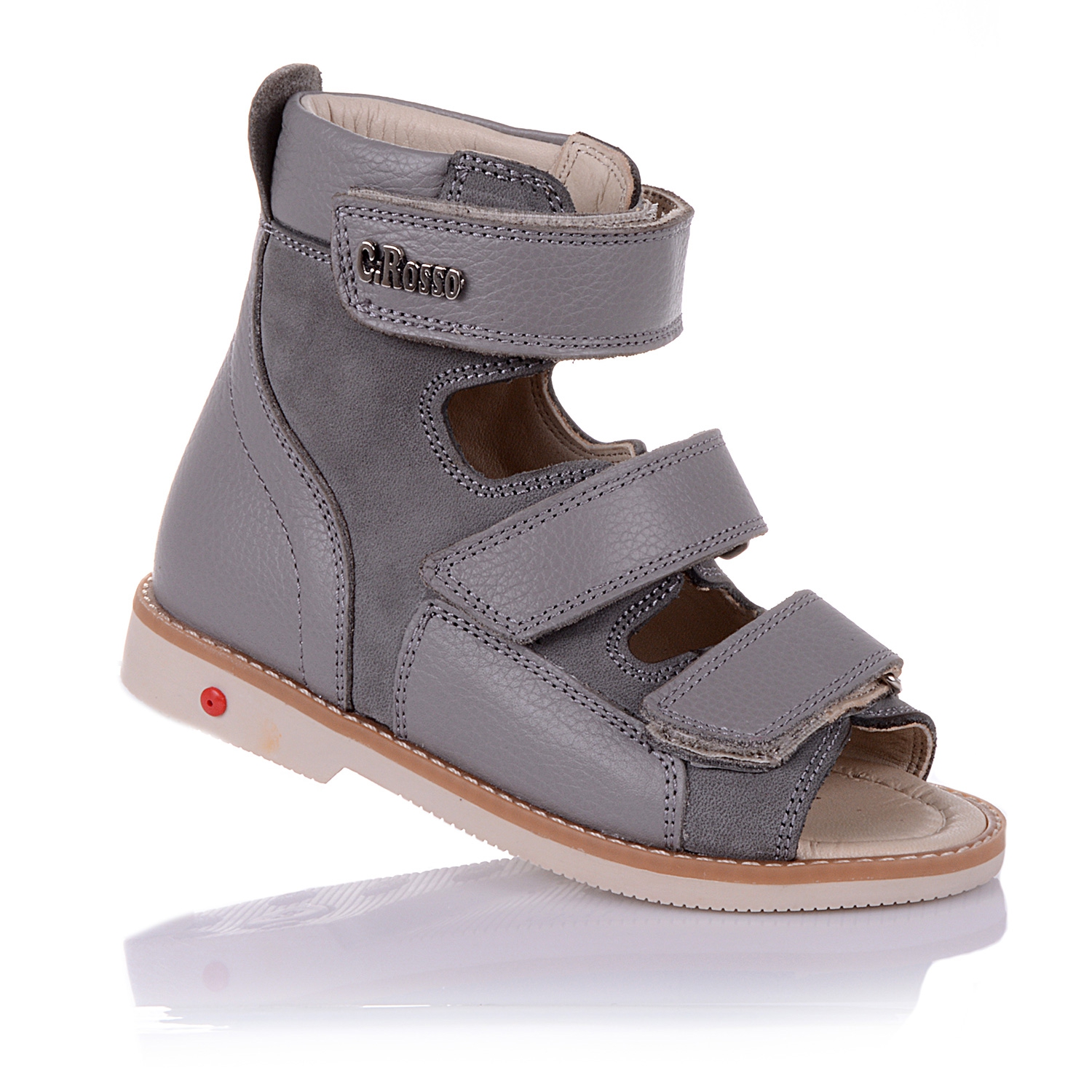 Босоножки-берцы серого цвета с открытым носком. Сверху фиксируются тремя липучками. Снаружи кожа + нубук, внутри кожаные. Завышенная твердая пятка, супинатор и ортопедический каблук Томаса.