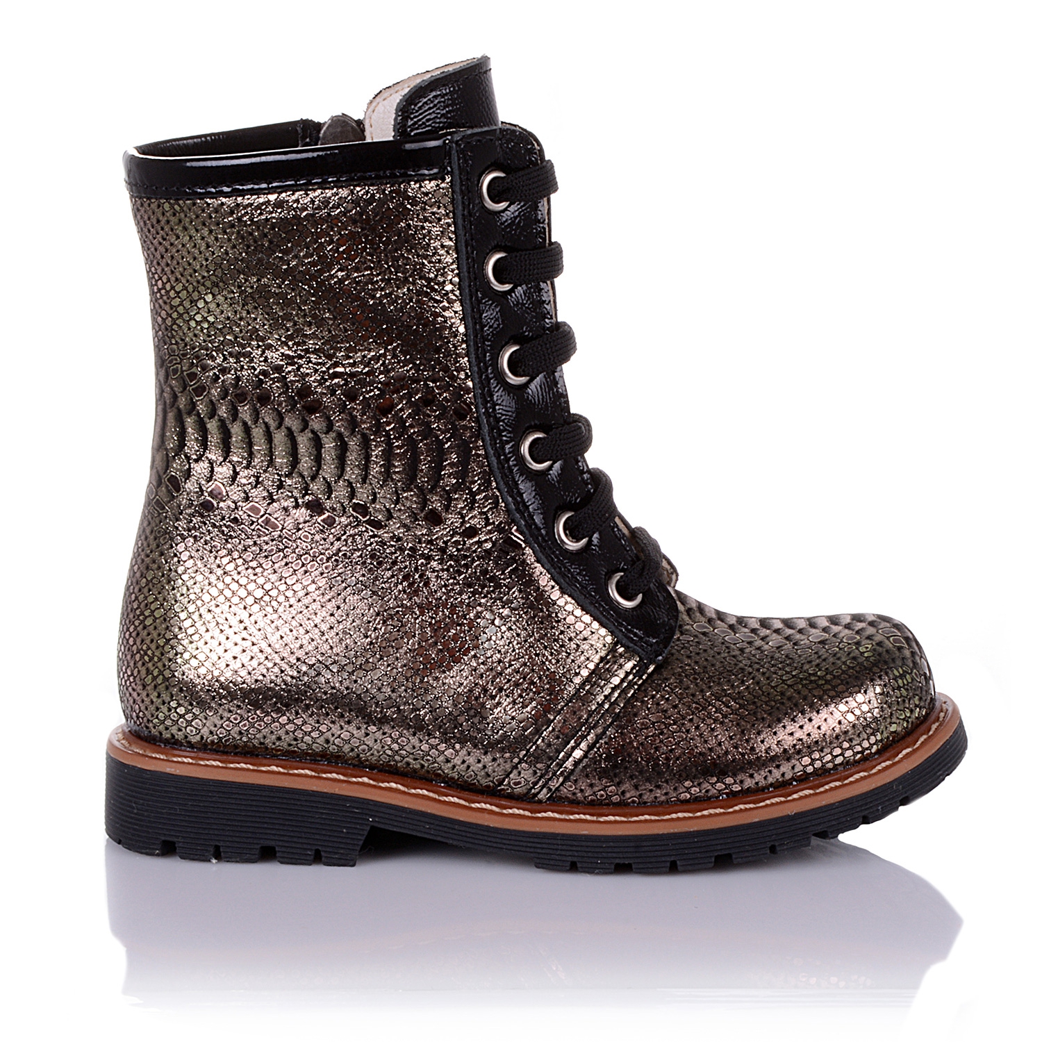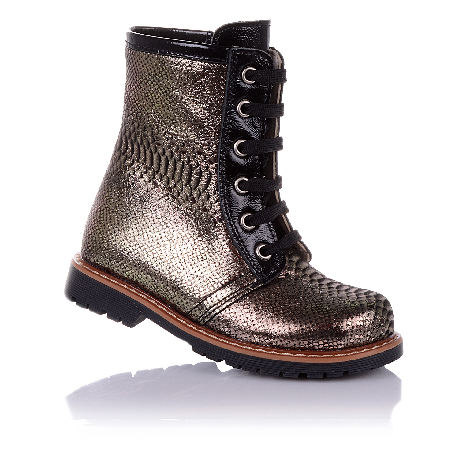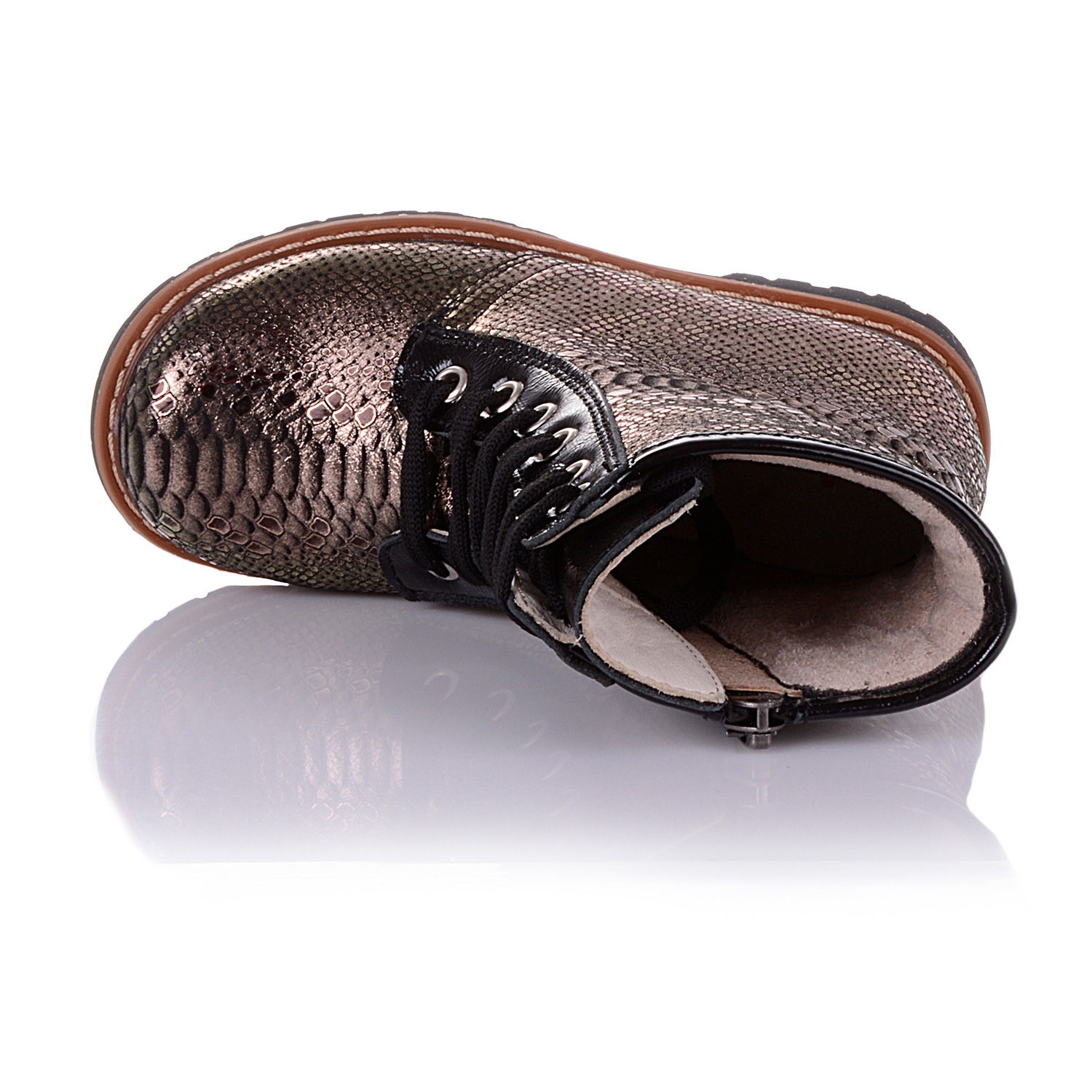 Демисезонные ортопедические ботинки темно-золотистого цвета. Сверху регулируются шнурками, С внутренней стороны - на молнии. Снаружи кожа, внутри - на флисе. Есть ортопедический каблук Томаса, твердая пятка и супинатор.