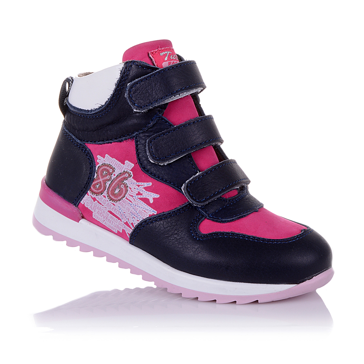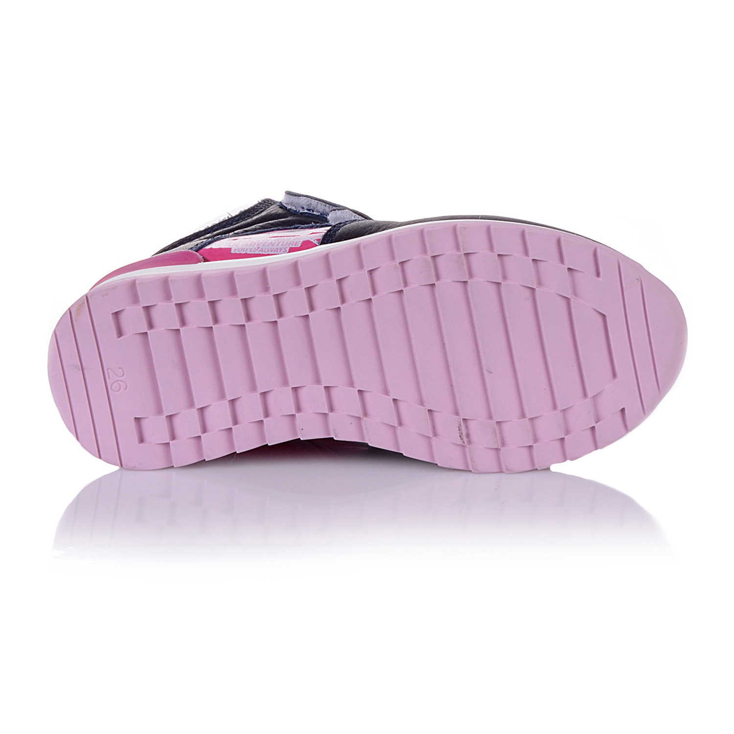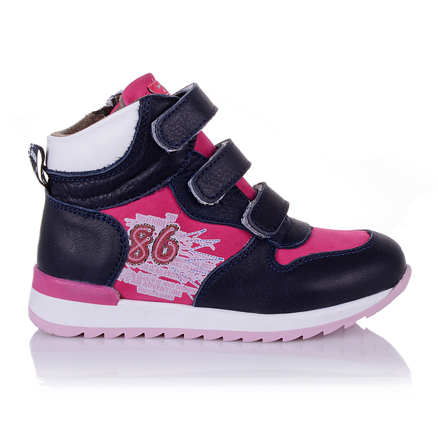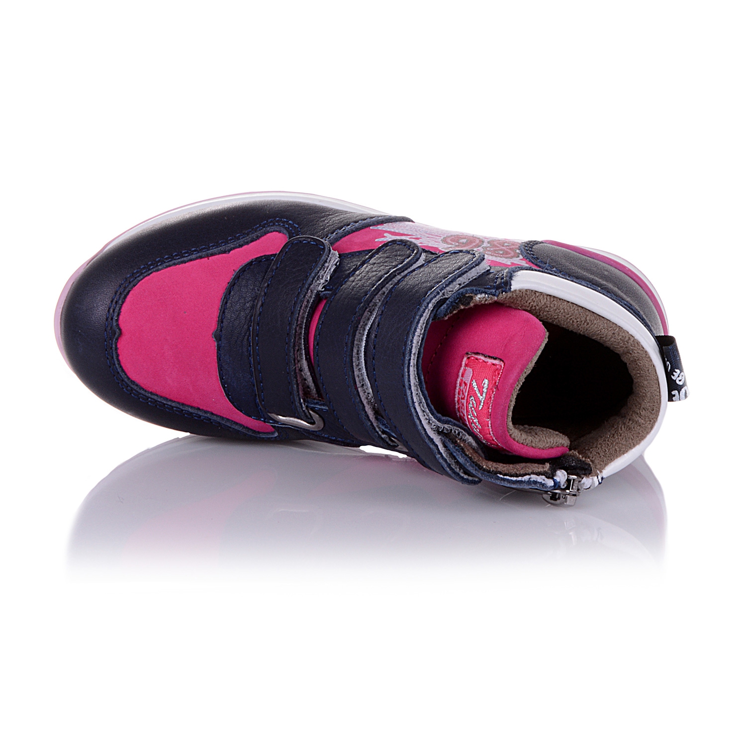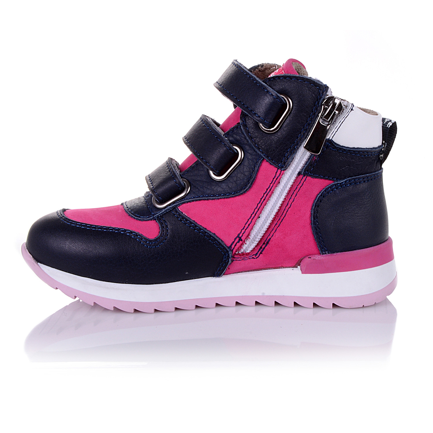 Демисезонные ботинки темно-синего цвета с розовыми вставками. Сверху регулируются тремя липучками, с внутренней стороны - на молнии. Снаружи кожа, внутри - на флисе. Есть супинатор, твердая пятка очень прочная подошва.