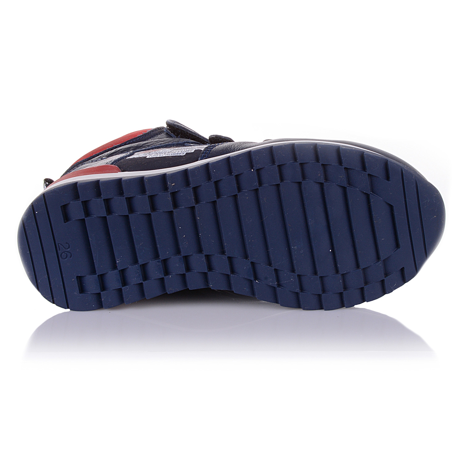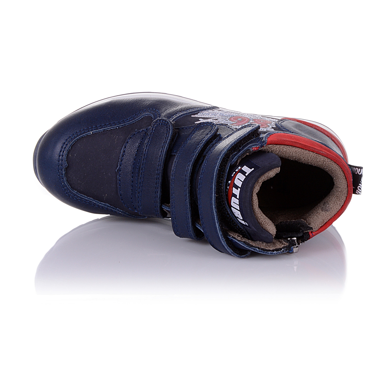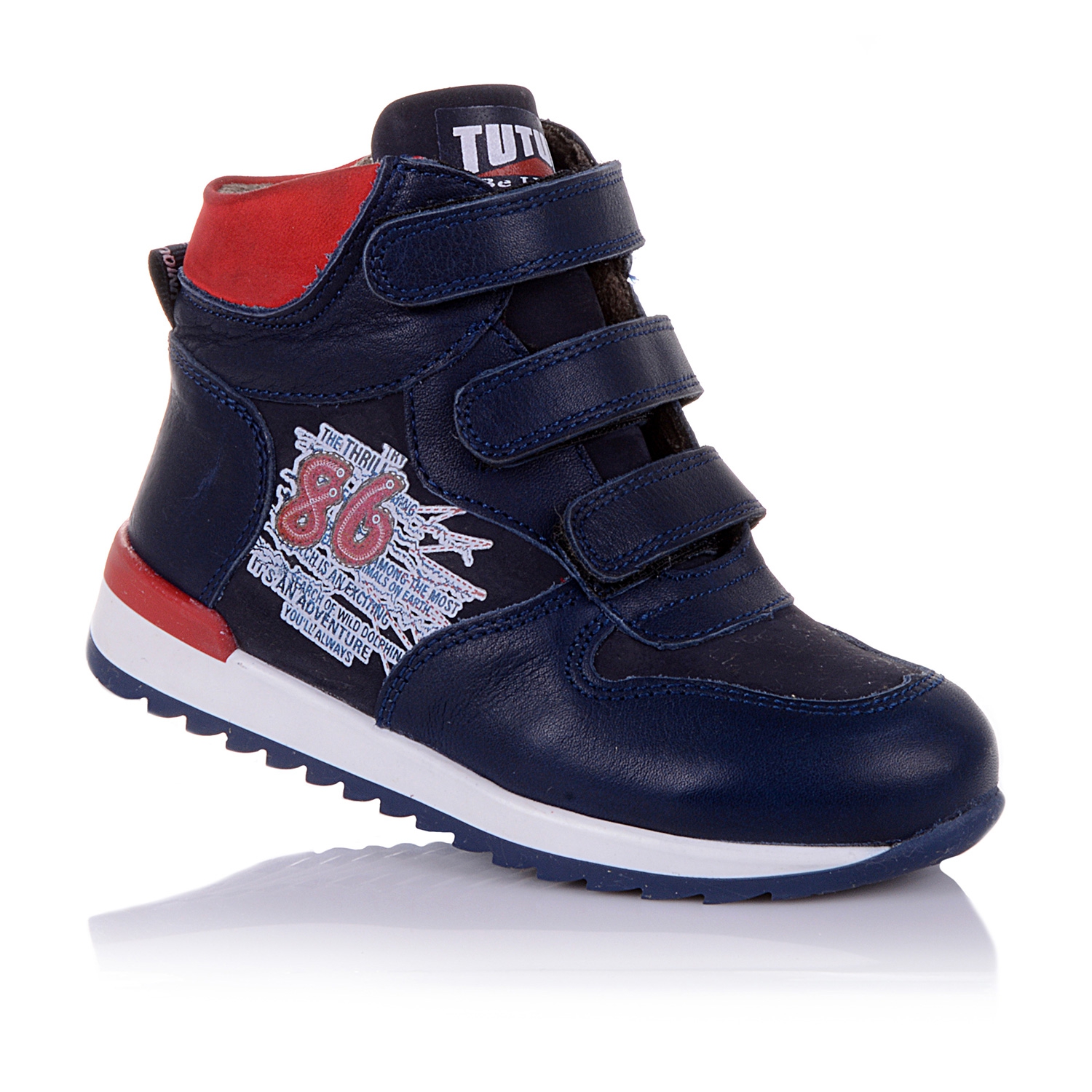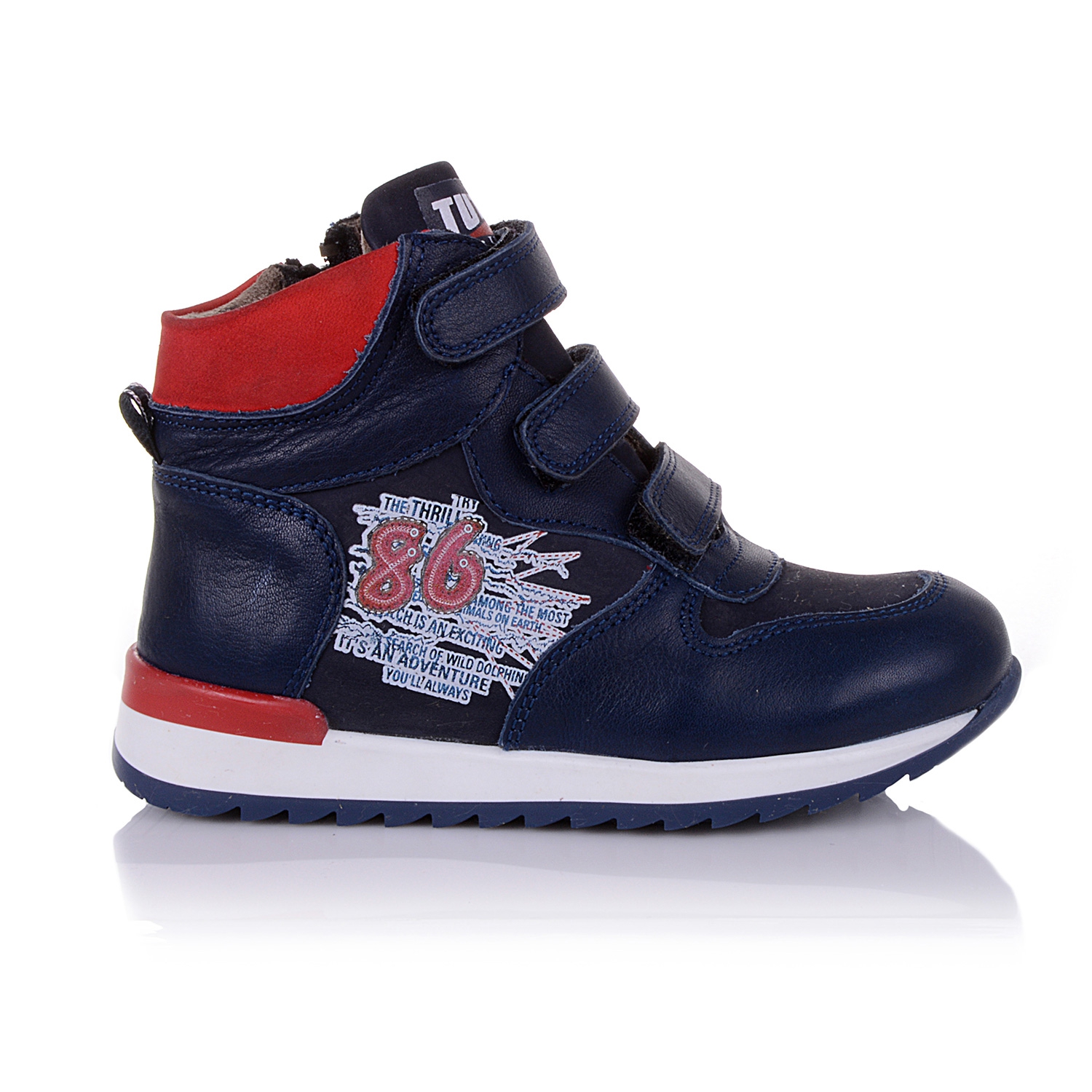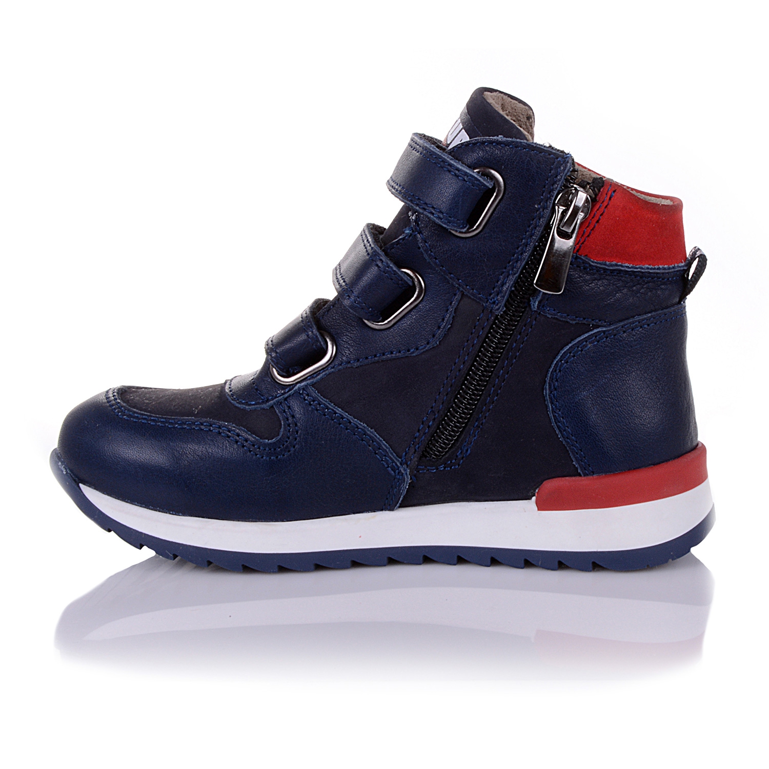 Демисезонные ботинки темно-синего цвета. Сверху регулируются тремя липучками, с внутренней стороны - на молнии. Снаружи кожа, внутри - на флисе. Есть супинатор, твердая пятка очень прочная подошва.
