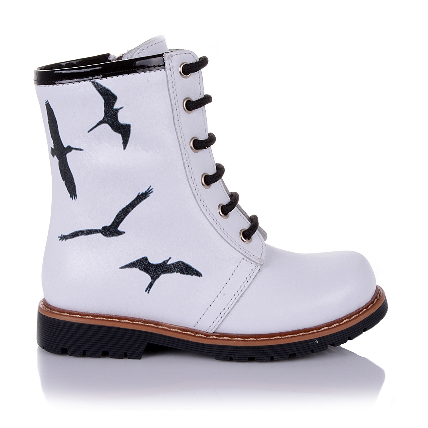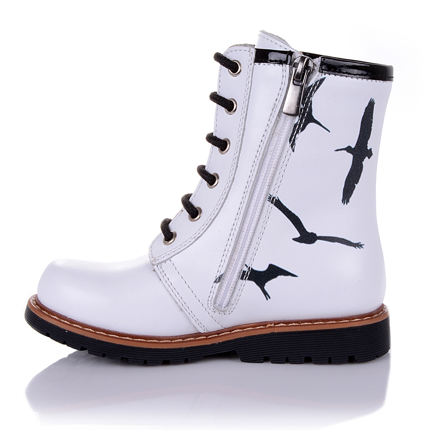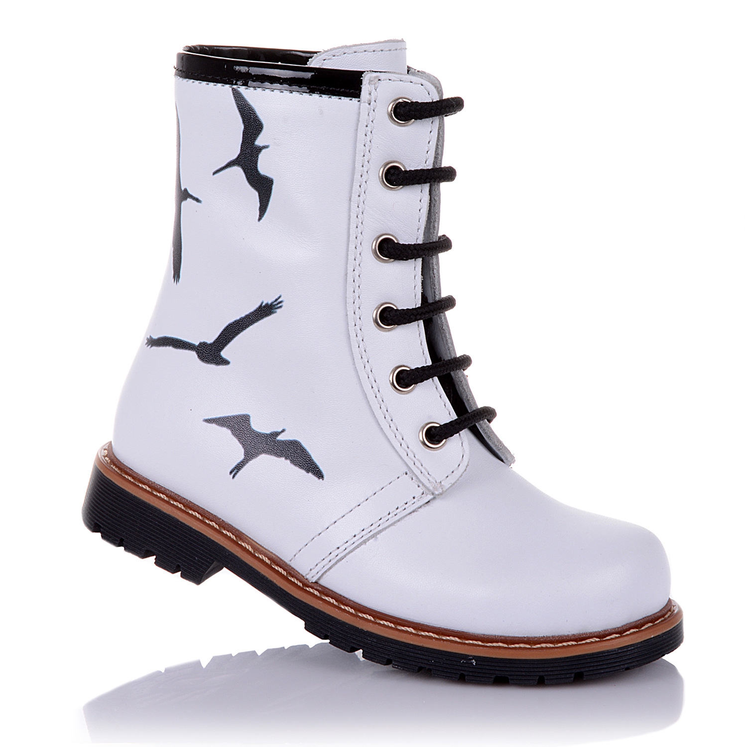Ортопедические демисезонные ботинки с цветным принтом. Сверху регулируются шнурками, С внутренней стороны - на молнии. Снаружи кожа, внутри - на флисе. Есть ортопедический каблук Томаса, твердая пятка и супинатор.