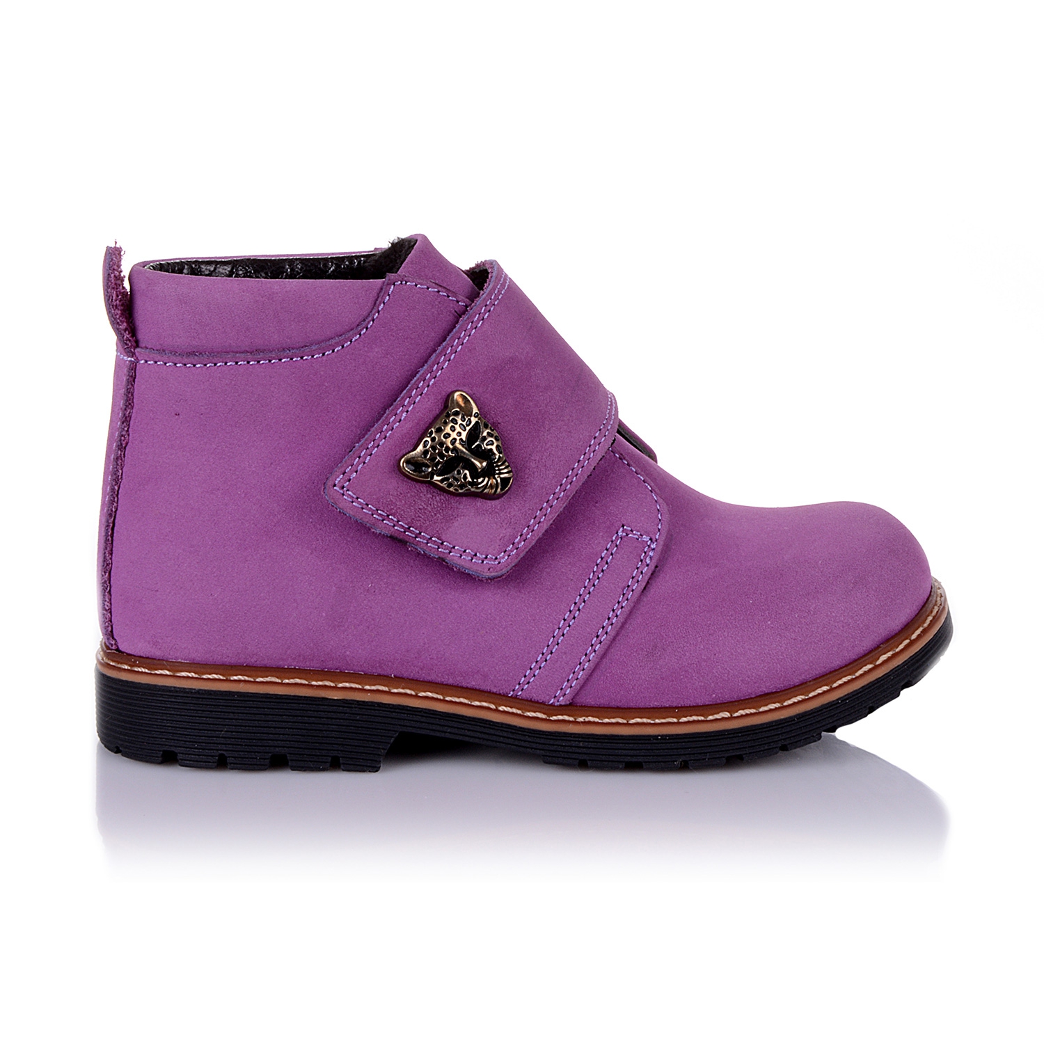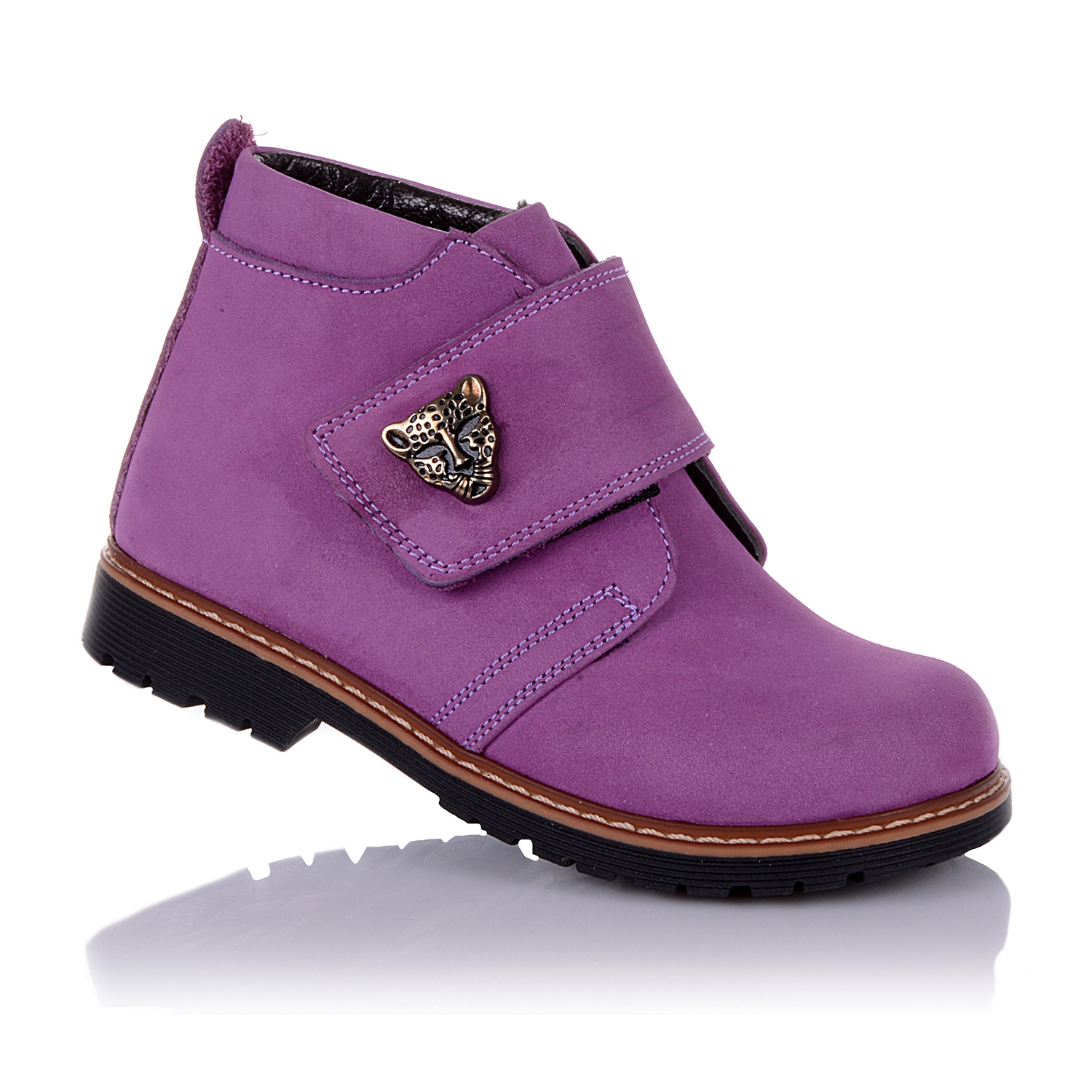 Демисезонные ортопедические ботинки сиреневого цвета. Сверху регулируются широкой липучкой. Снаружи нубук, внутри - ворсистый флис. Есть ортопедический каблук Томаса, высокий твердый задник и супинатор.