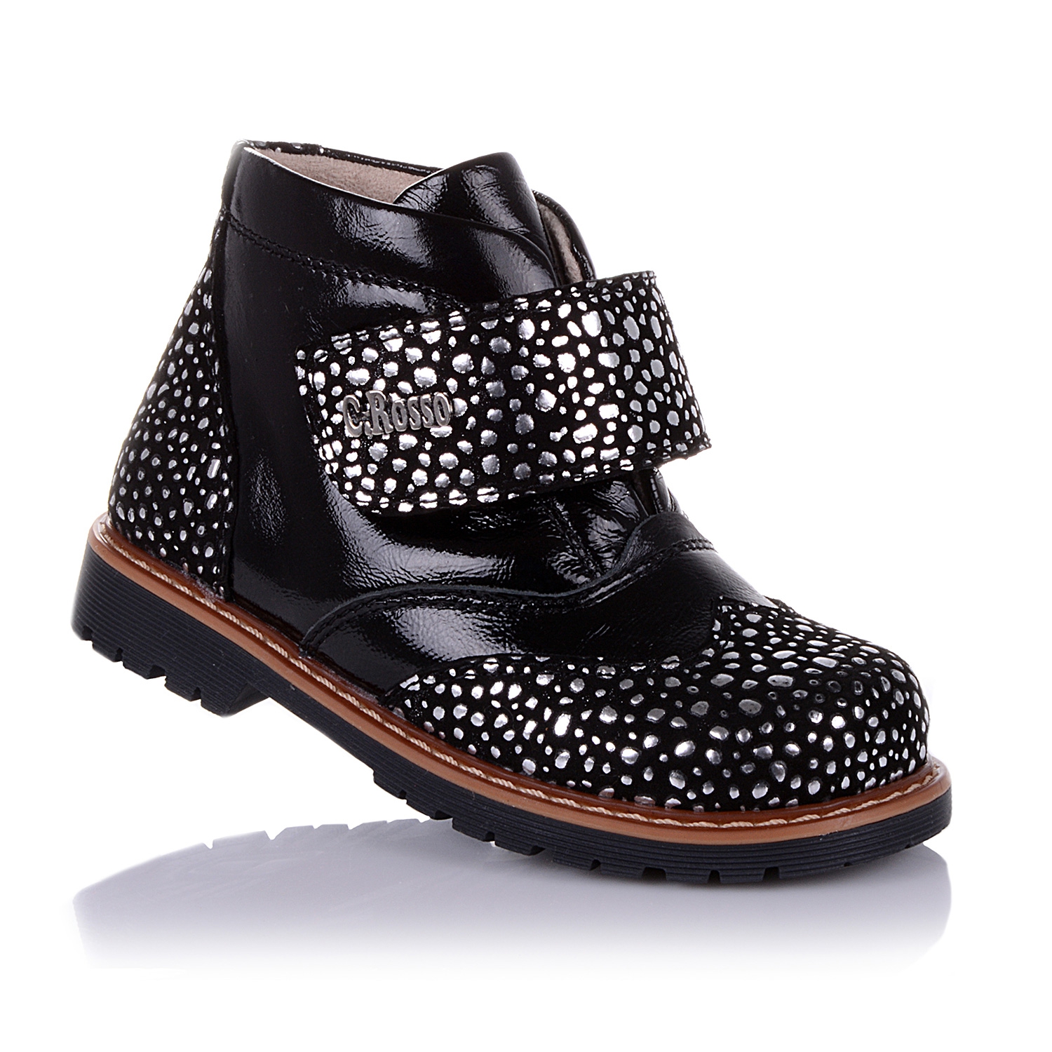 Демисезонные ортопедические ботинки черного цвета. Сверху регулируются широкой липучкой. Снаружи кожа (лак) + нубук, внутри - на флисе. Есть ортопедический каблук Томаса, твердая пятка и супинатор.