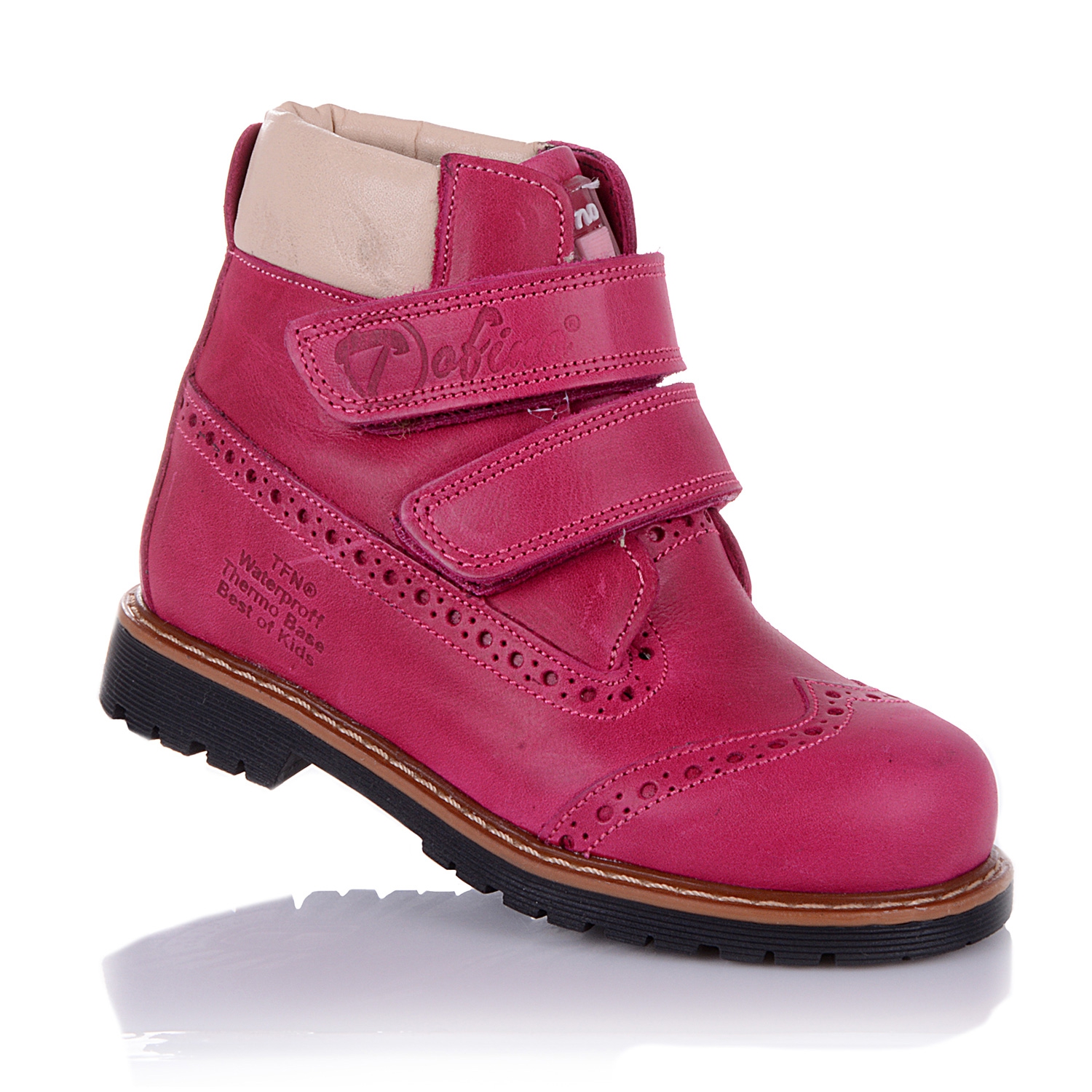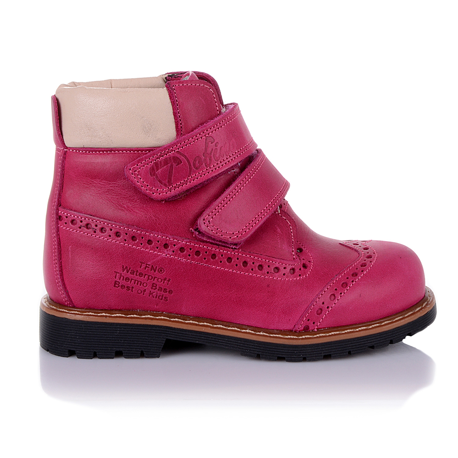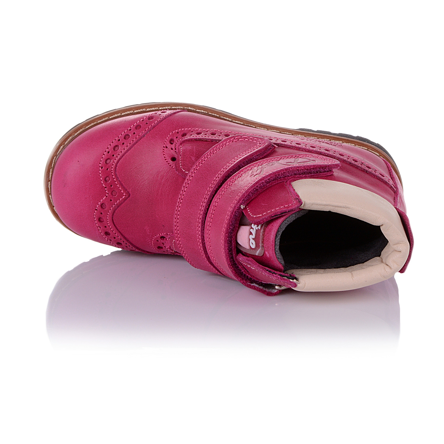 Демисезонные ортопедические ботинки розового цвета. Сверху регулируются двумя липучками. Снаружи кожа (жирный нубук), внутри - на флисе. Есть ортопедический каблук Томаса, высокий твердый задник и супинатор.