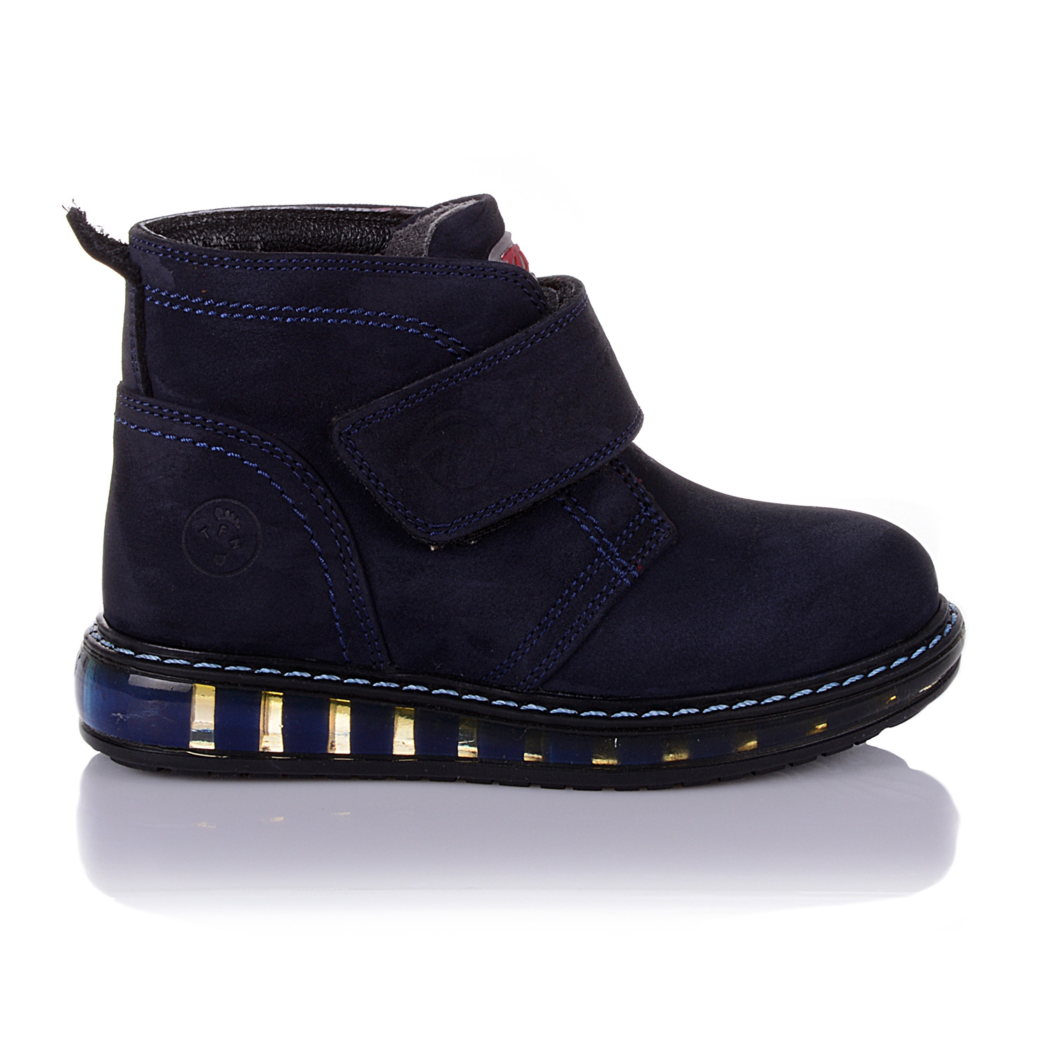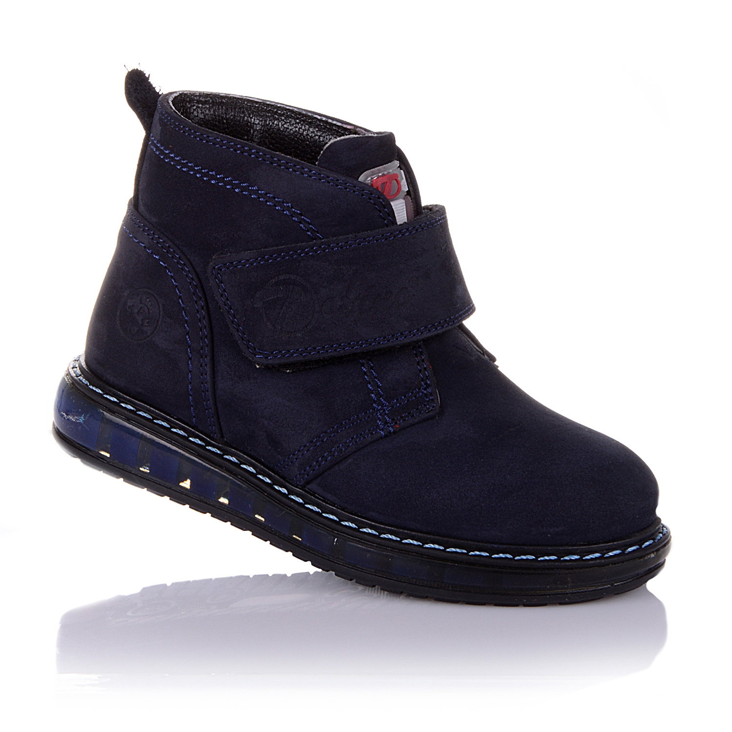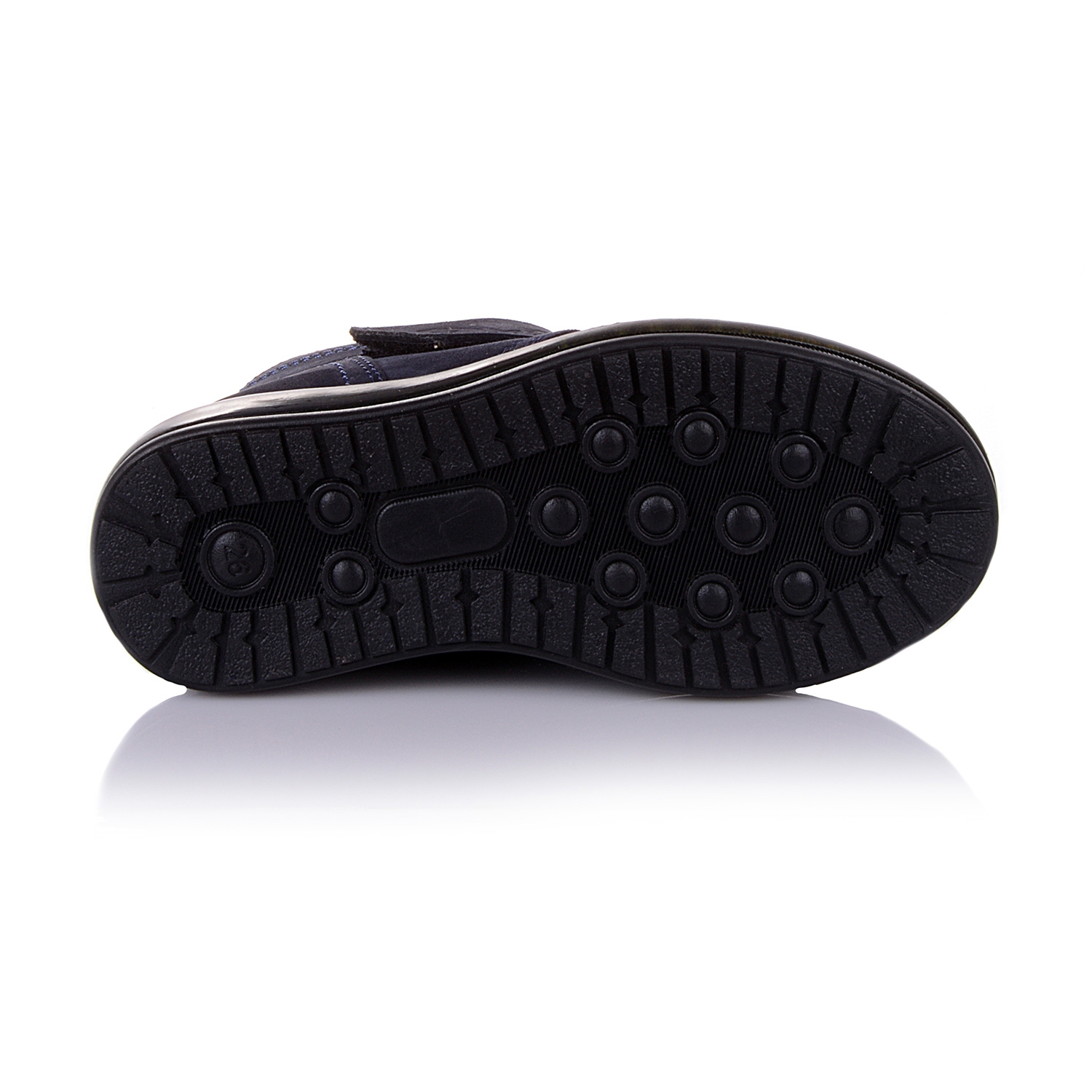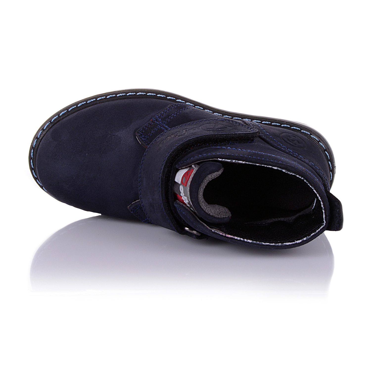Демисезонные ботинки темно-синего цвета. Сверху регулируются широкой липучкой. Снаружи нубук, внутри - флис. Есть высокий твердый задник, супинатор, прочная стильная подошва.