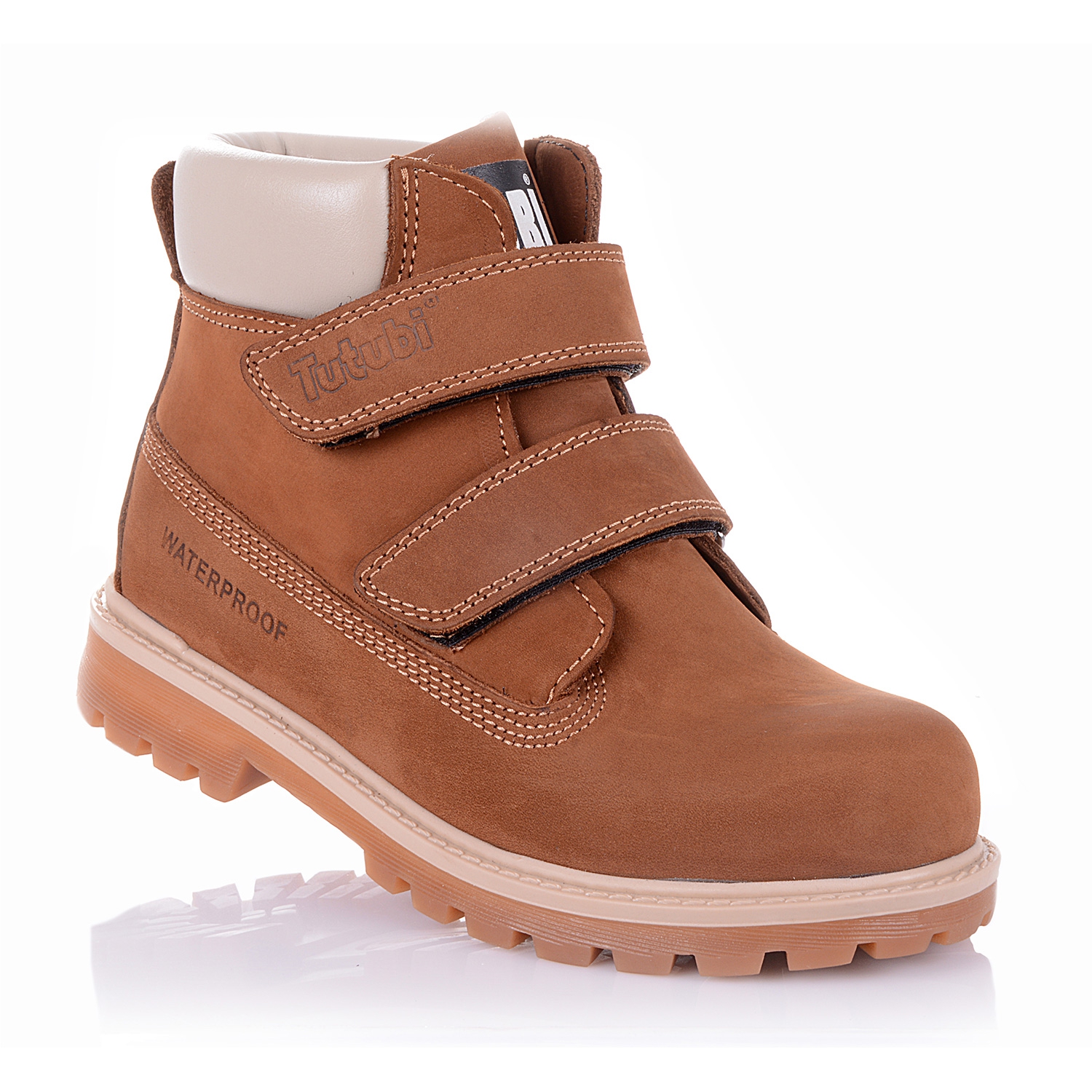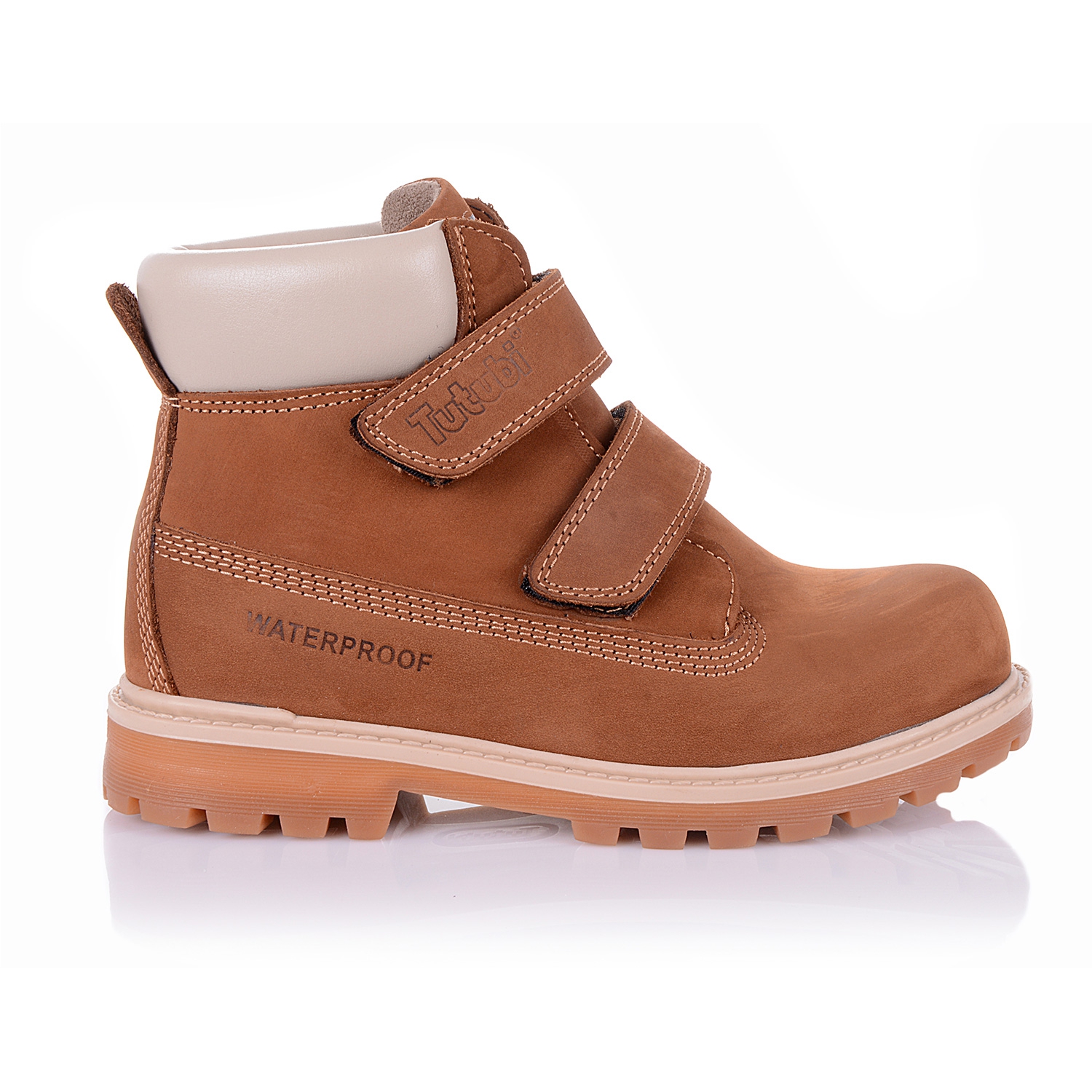 Зимние ортопедические ботинки горчичного цвета. Сверху регулируются двумя липучками. Снаружи нубук, внутри - натуральный мех (цигейка). Есть высокий твердый задник, супинатор и тракторная подошва.