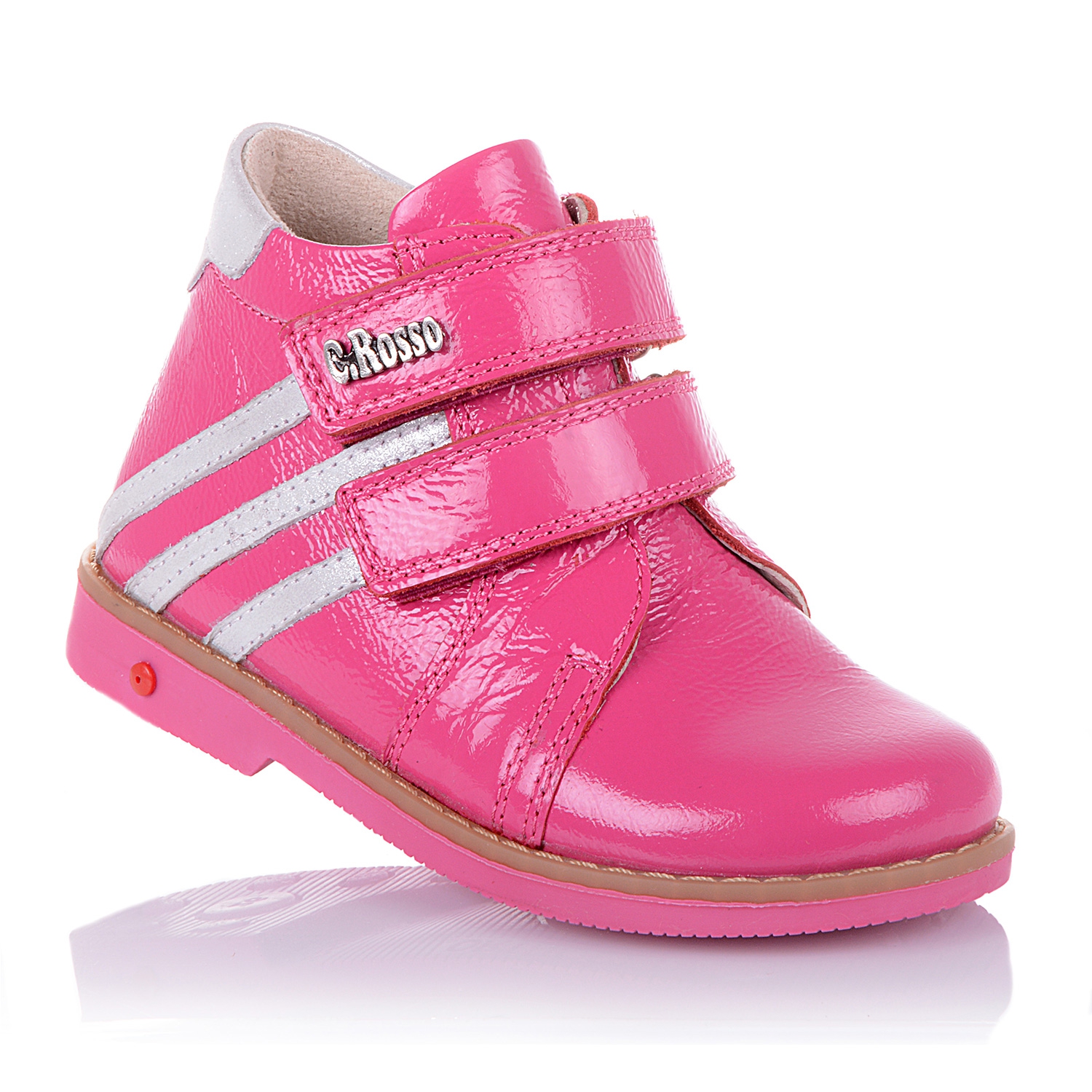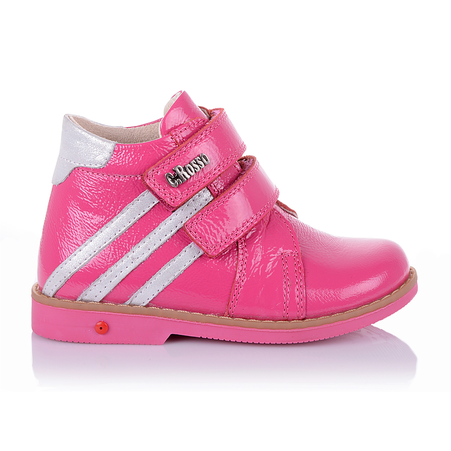 Демисезонные ортопедические ботинки ярко-розового цвета с перламутровым отливом. Регулируются двумя липучками сверху. Снаружи кожа, внутри - на флисе. Есть ортопедический каблук Томаса, супинатор и твердый задник.