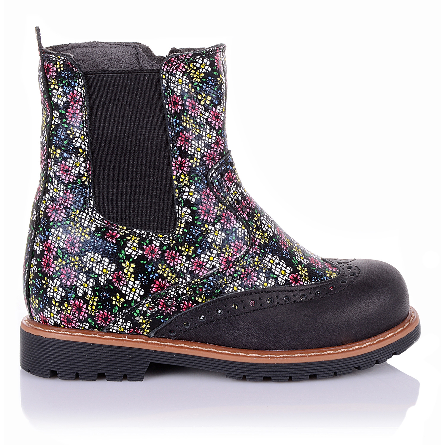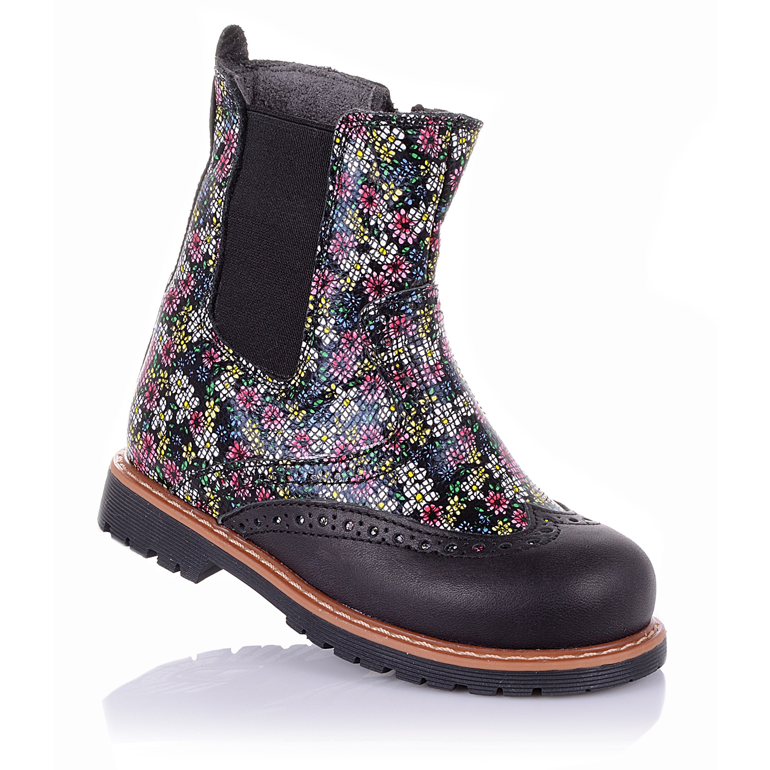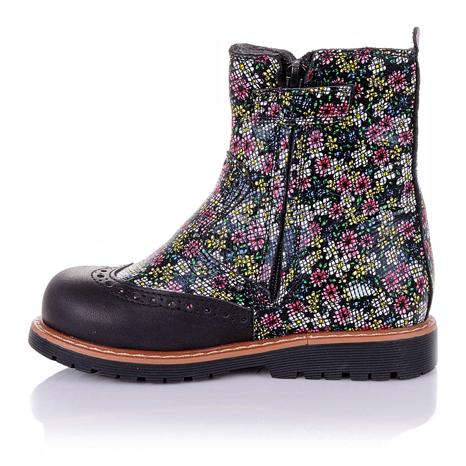 Ортопедические демисезонные сапожки с разноцветным принтом. С внутренней стороны - на молнии, с внешней на резиночке. Снаружи кожа, внутри - на флисе. Есть супинатор, ортопедическая твердая пятка, каблук Томаса.