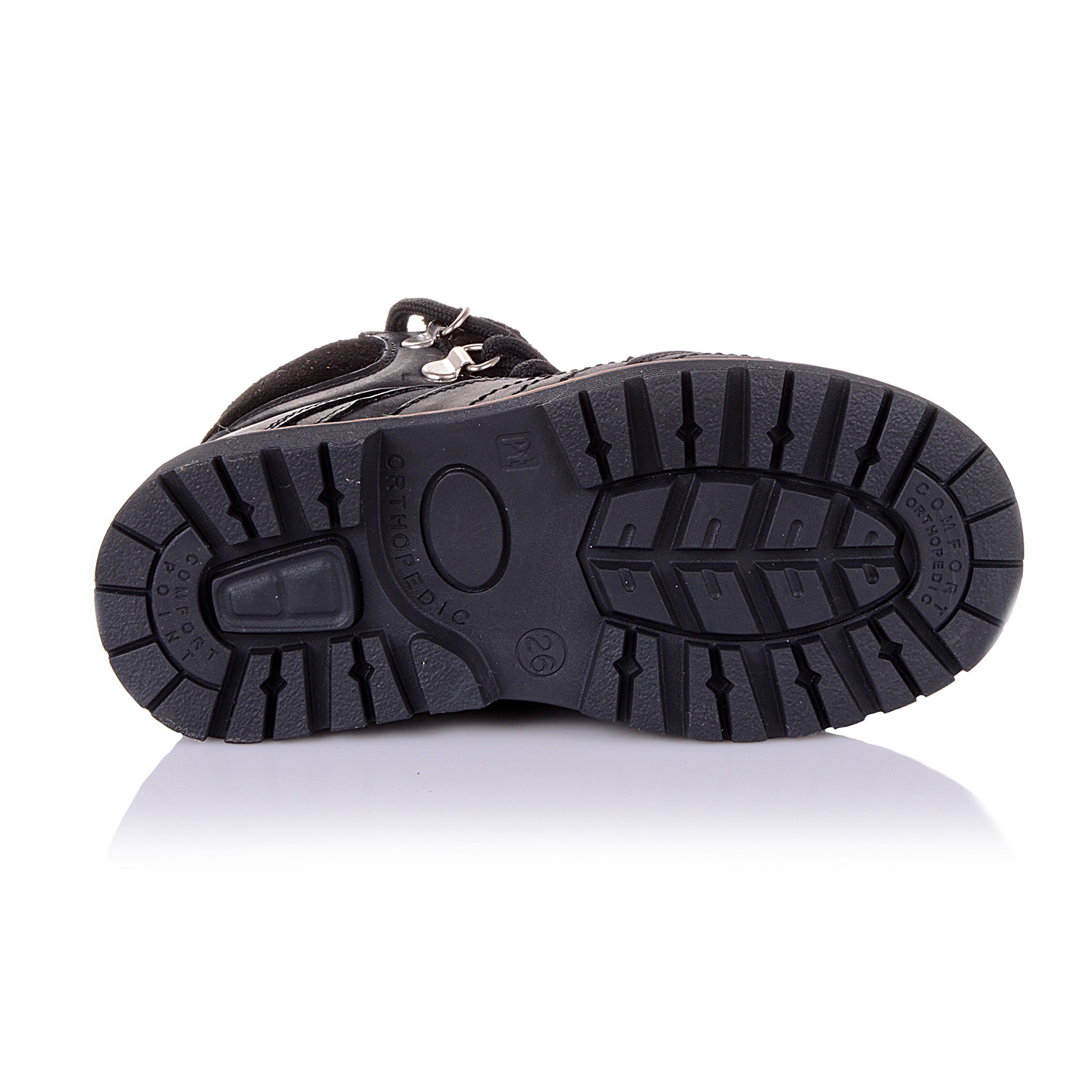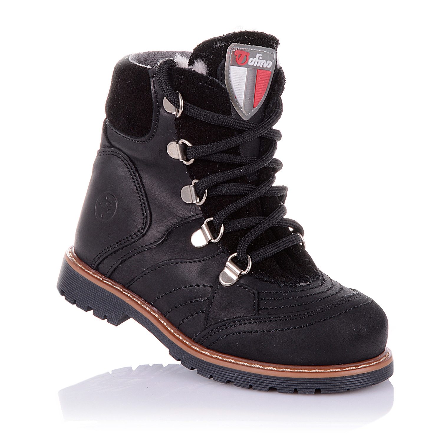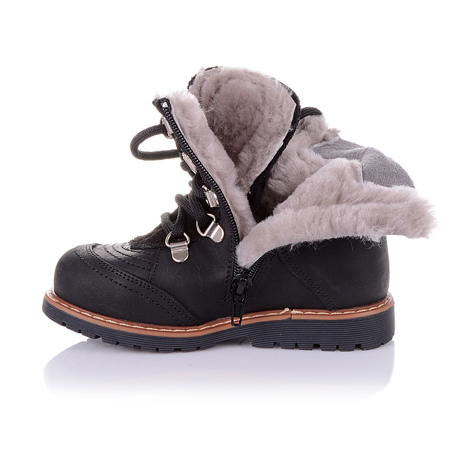 Зимние ортопедические ботинки черного цвета. Сверху регулируются шнурками, С внутренней стороны - на молнии. Снаружи кожа (жирный нубук), внутри - натуральный мех (цигейка). Есть супинатор, высокий твердый задник, каблук Томаса.
