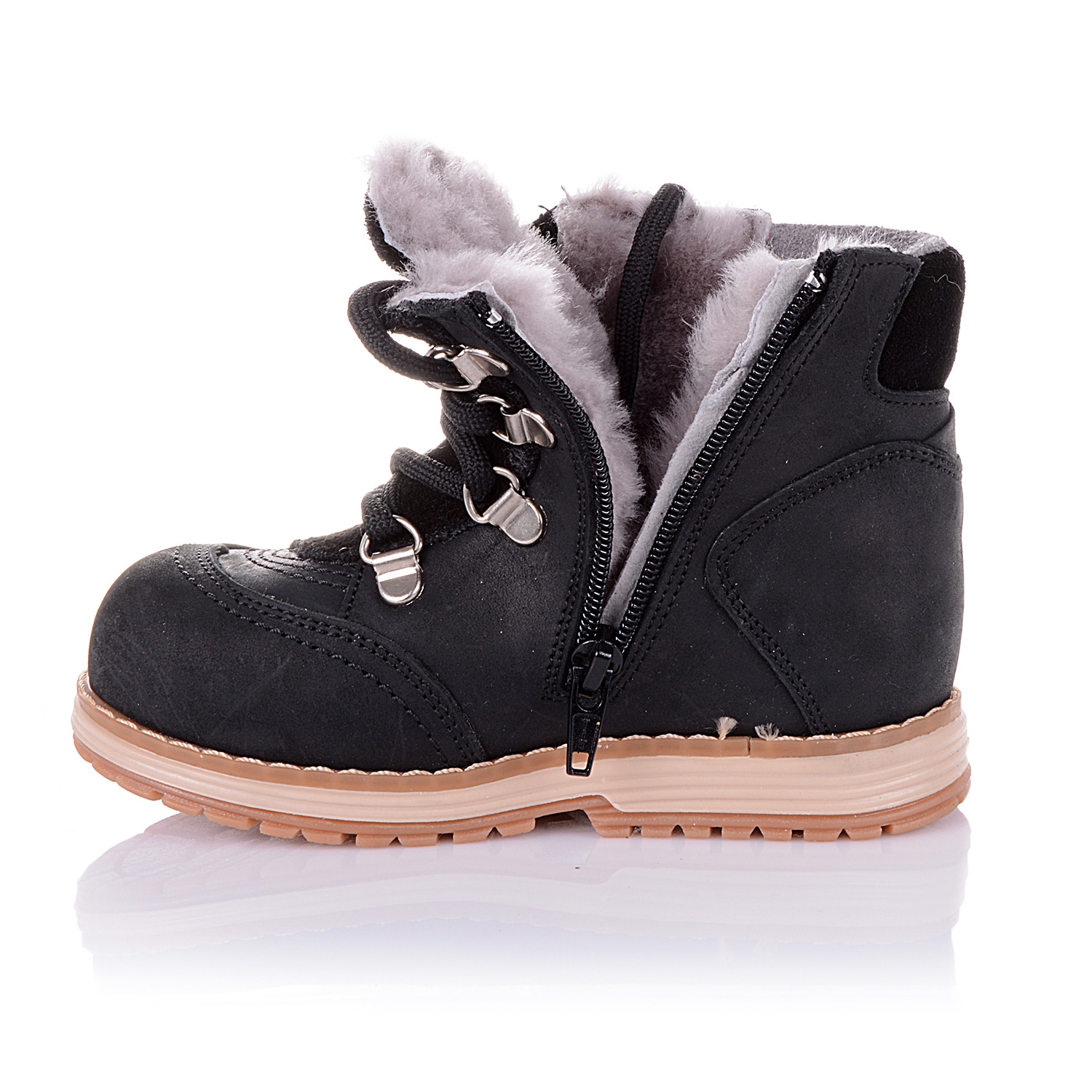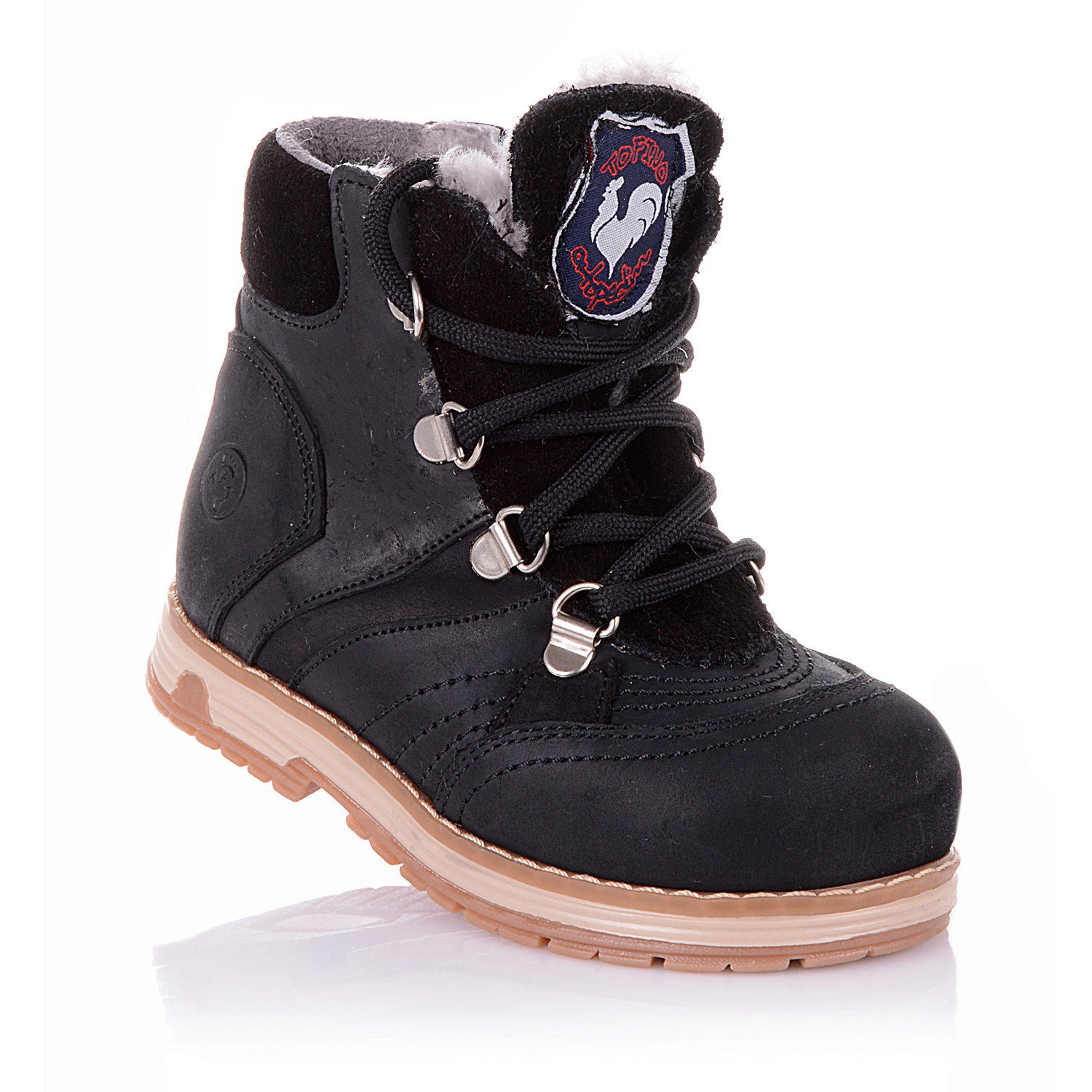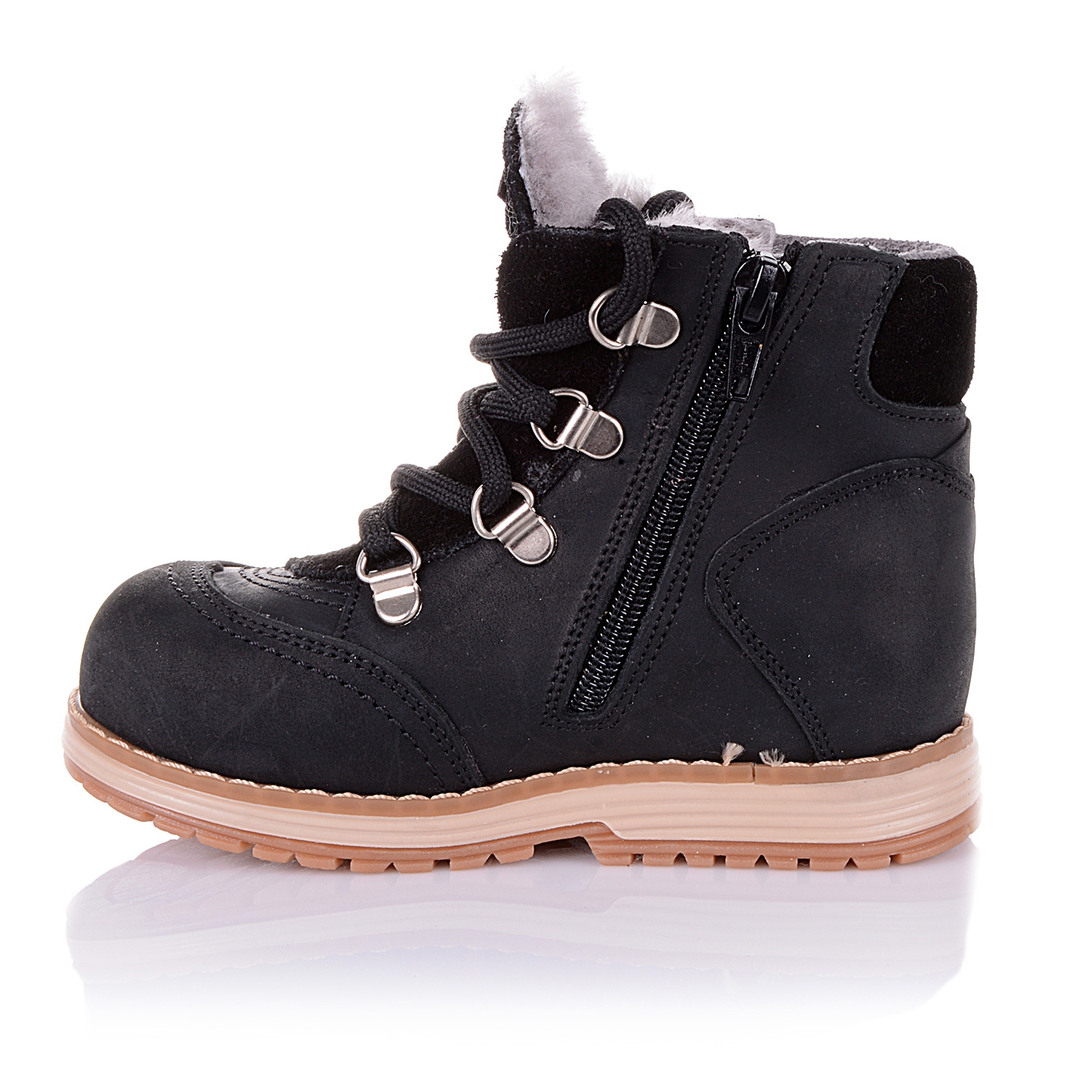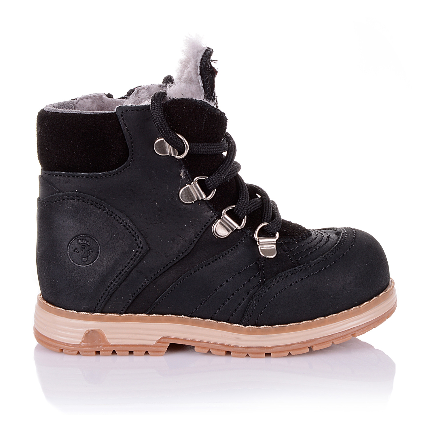 Зимние ортопедические ботинки черного цвета. Сверху регулируются шнурками, С внутренней стороны - на молнии. Снаружи кожа (жирный нубук), внутри - натуральный мех (цигейка). Есть супинатор, высокий твердый задник, каблук Томаса.