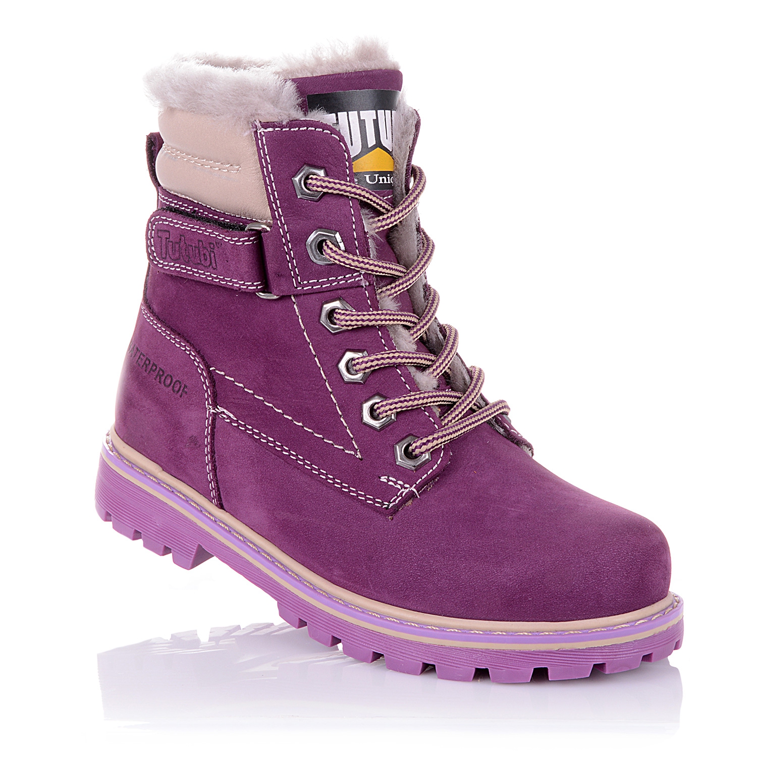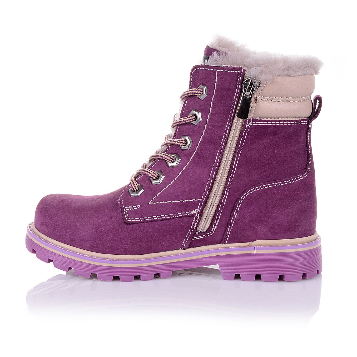 Зимние ортопедические ботинки сиреневого цвета. Сверху регулируются шнурками, сбоку на молнии. Снаружи нубук, внутри - натуральный мех (цигейка). Есть высокий твердый задник, супинатор и тракторная подошва.