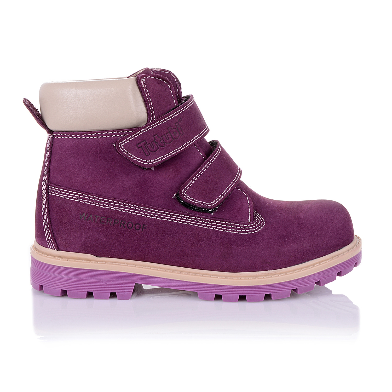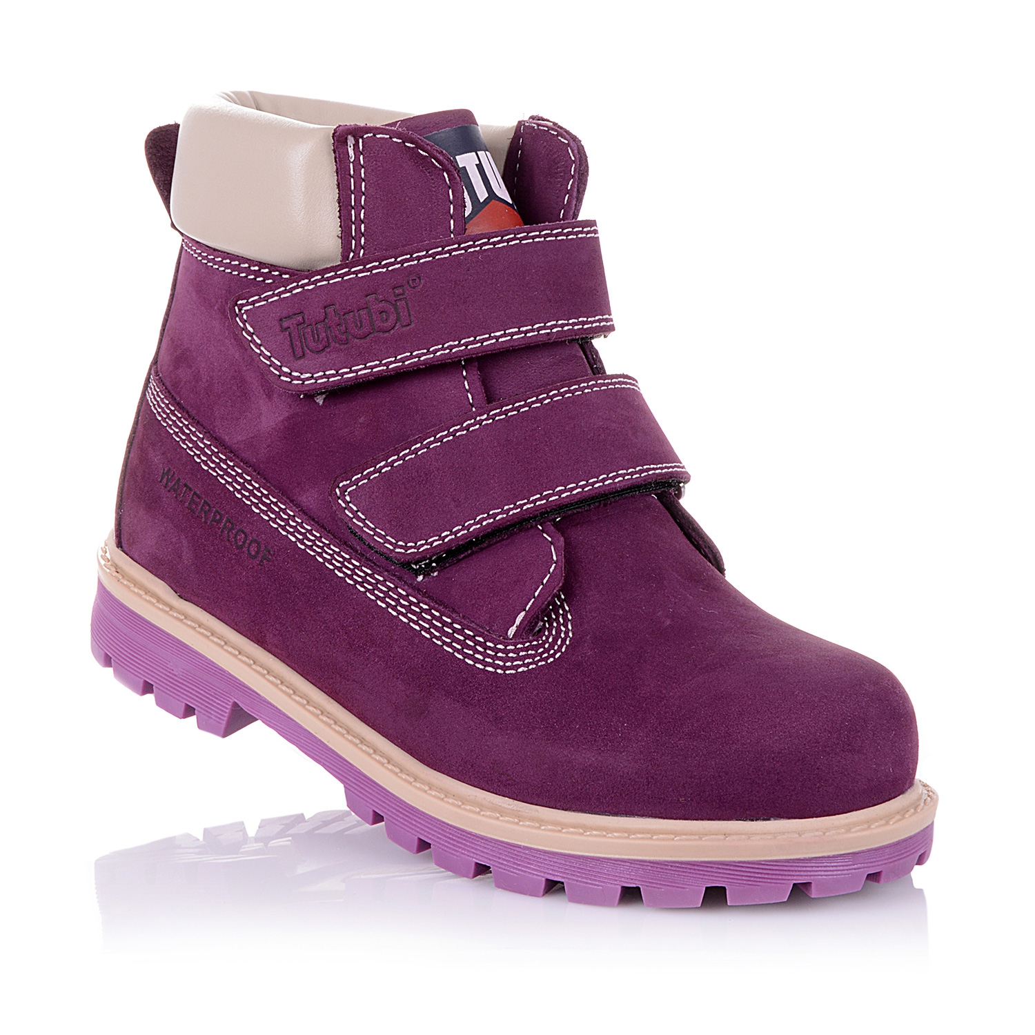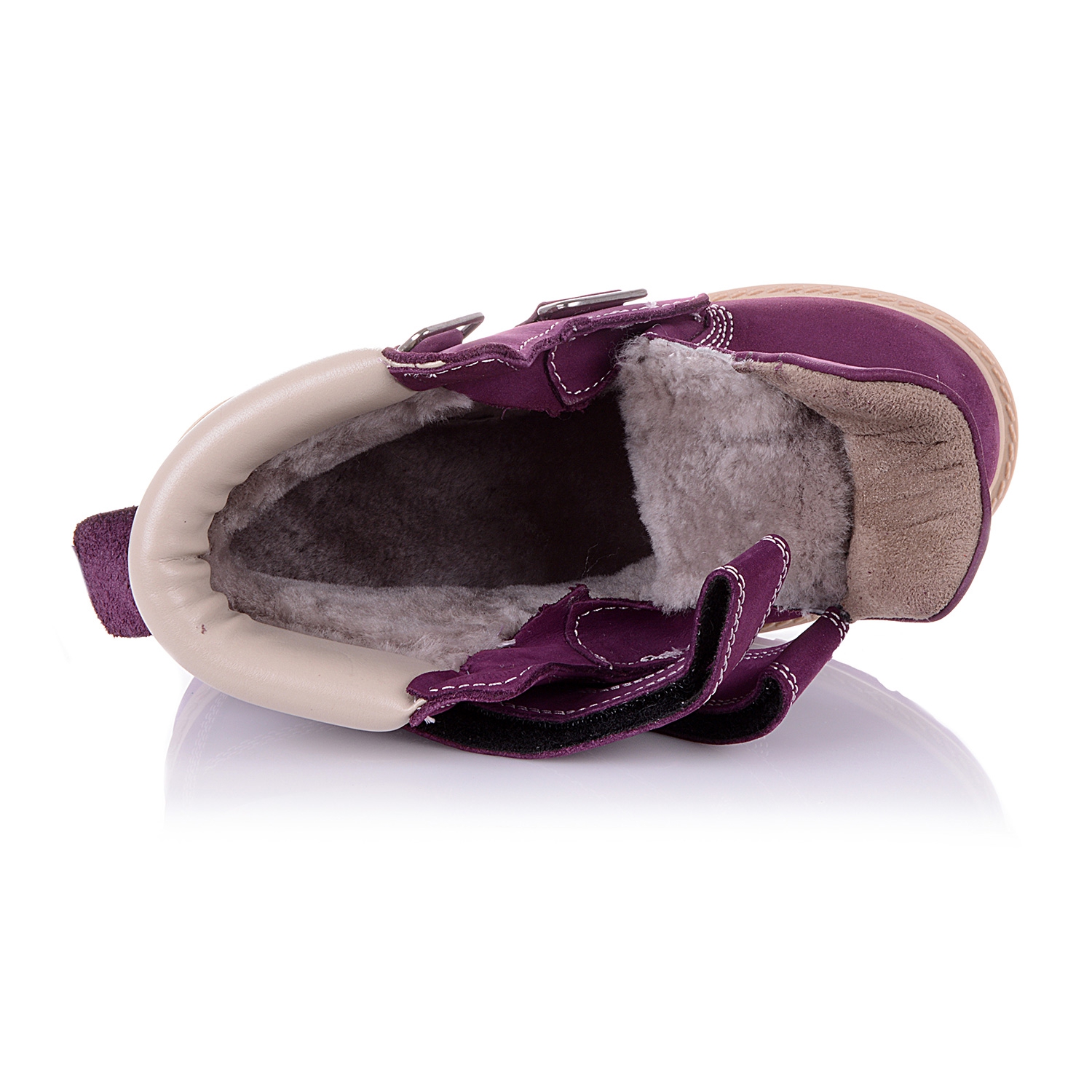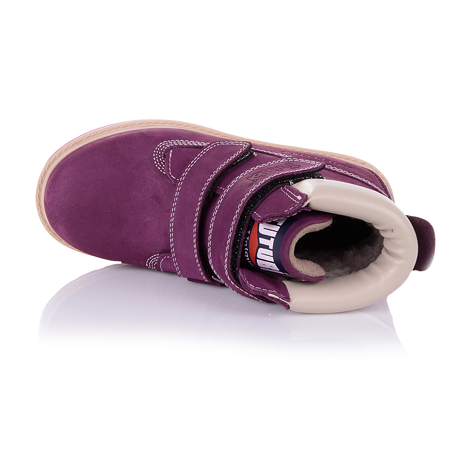 Зимние ортопедические ботинки сиреневого цвета. Сверху регулируются двумя липучками. Снаружи нубук, внутри - натуральный мех (цигейка). Есть высокий твердый задник, супинатор и тракторная подошва.