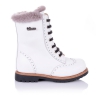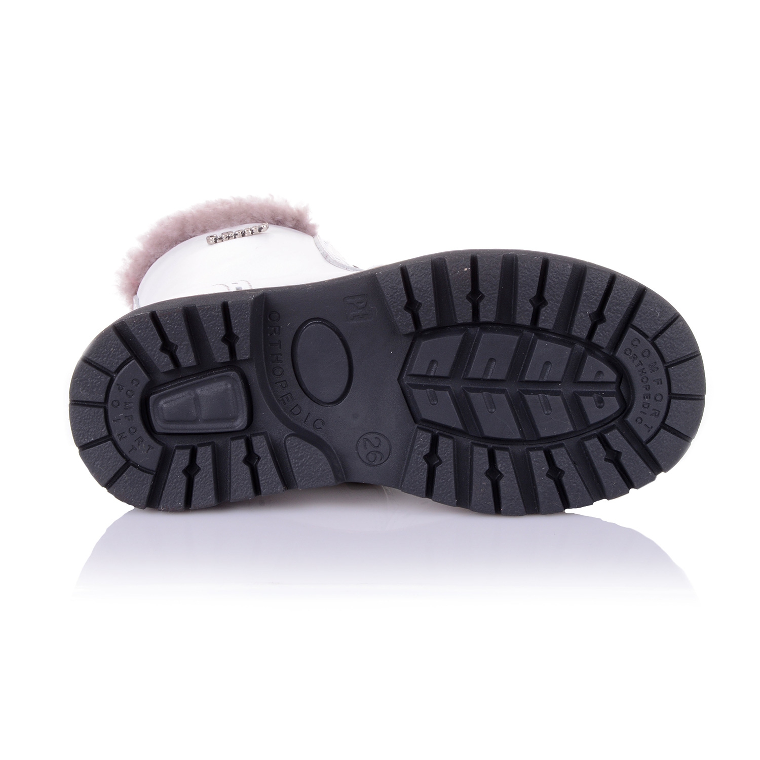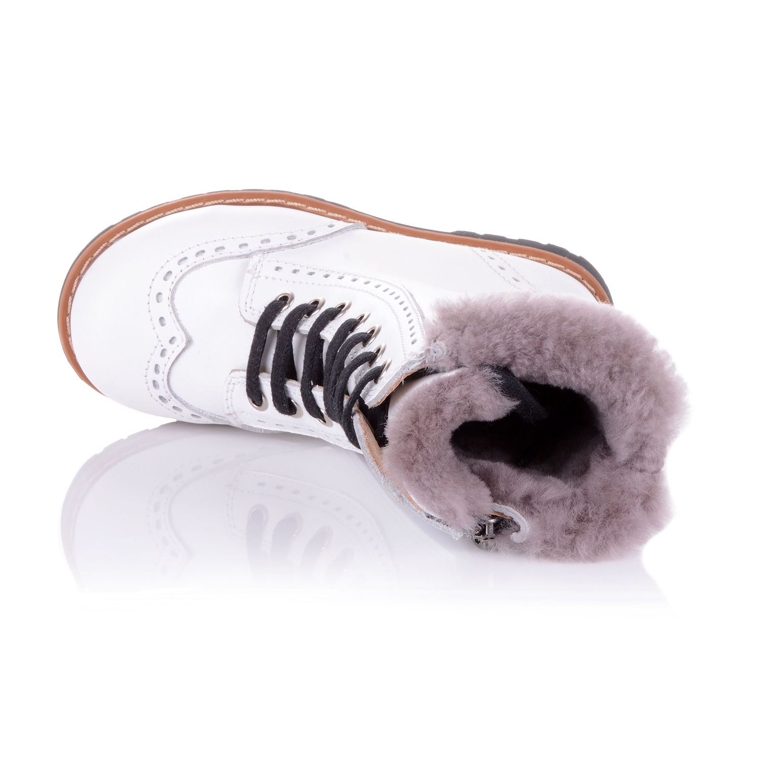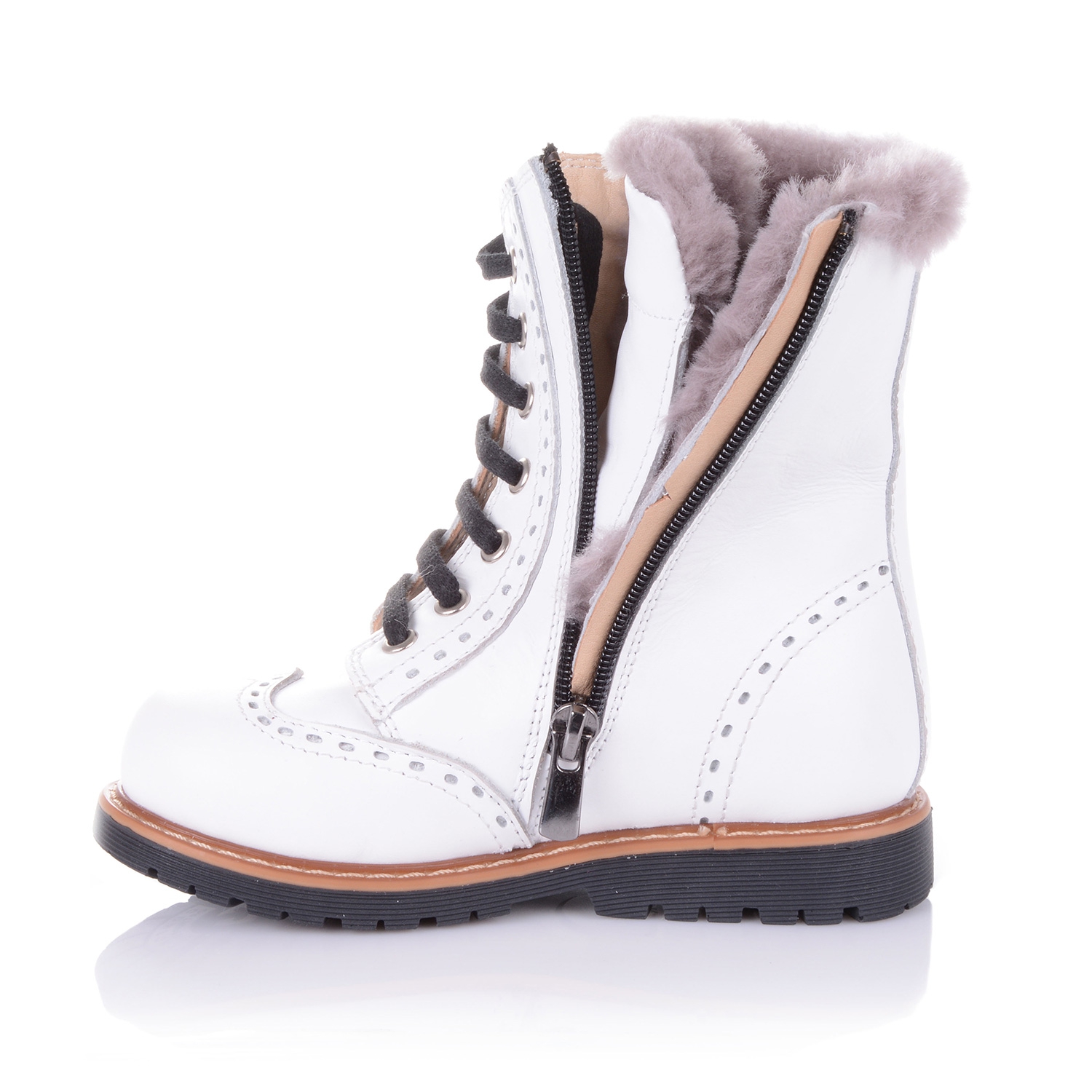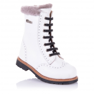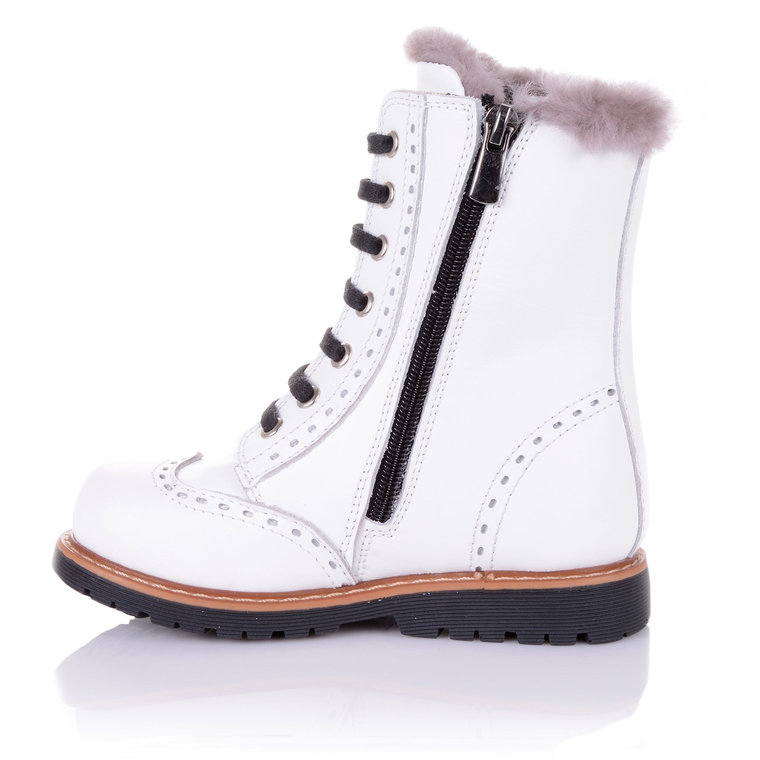 Зимние ортопедические ботинки (берцы) белого цвета. Сверху на шнурках, С внутренней стороны - на молнии. Снаружи кожа, внутри - на меху (натуральная цигейка). Есть супинатор, высокий твердый задник, каблук Томаса.