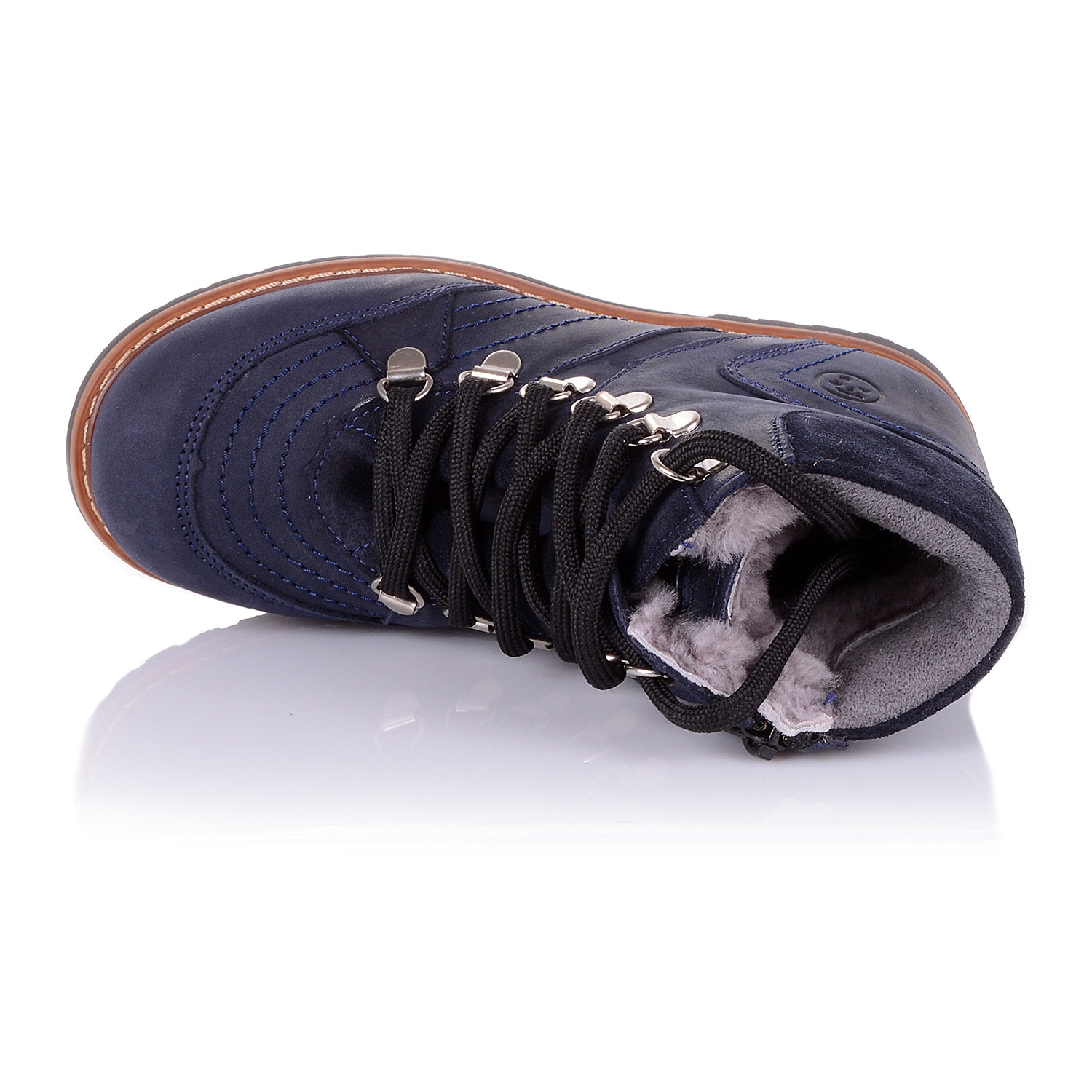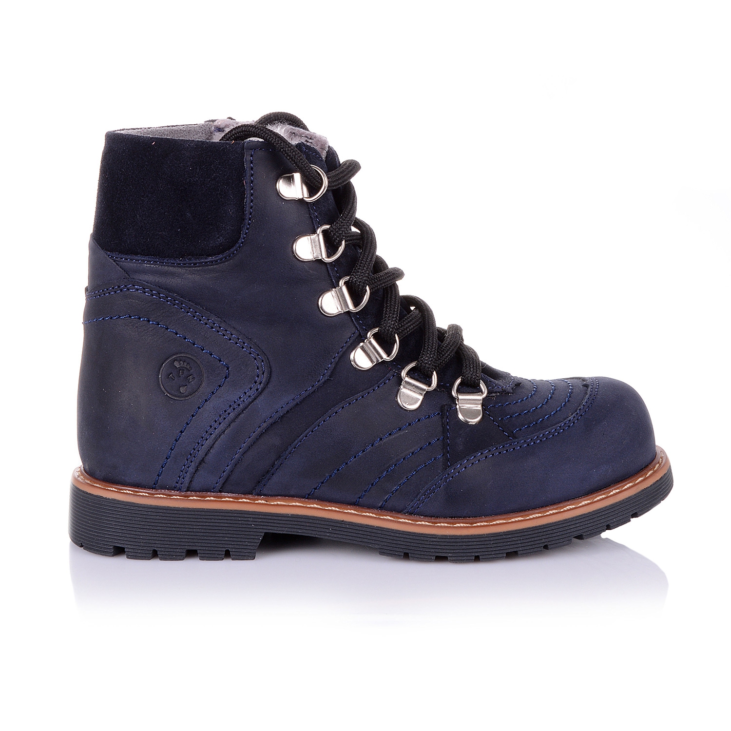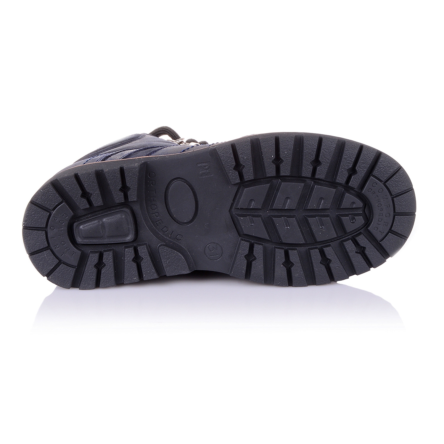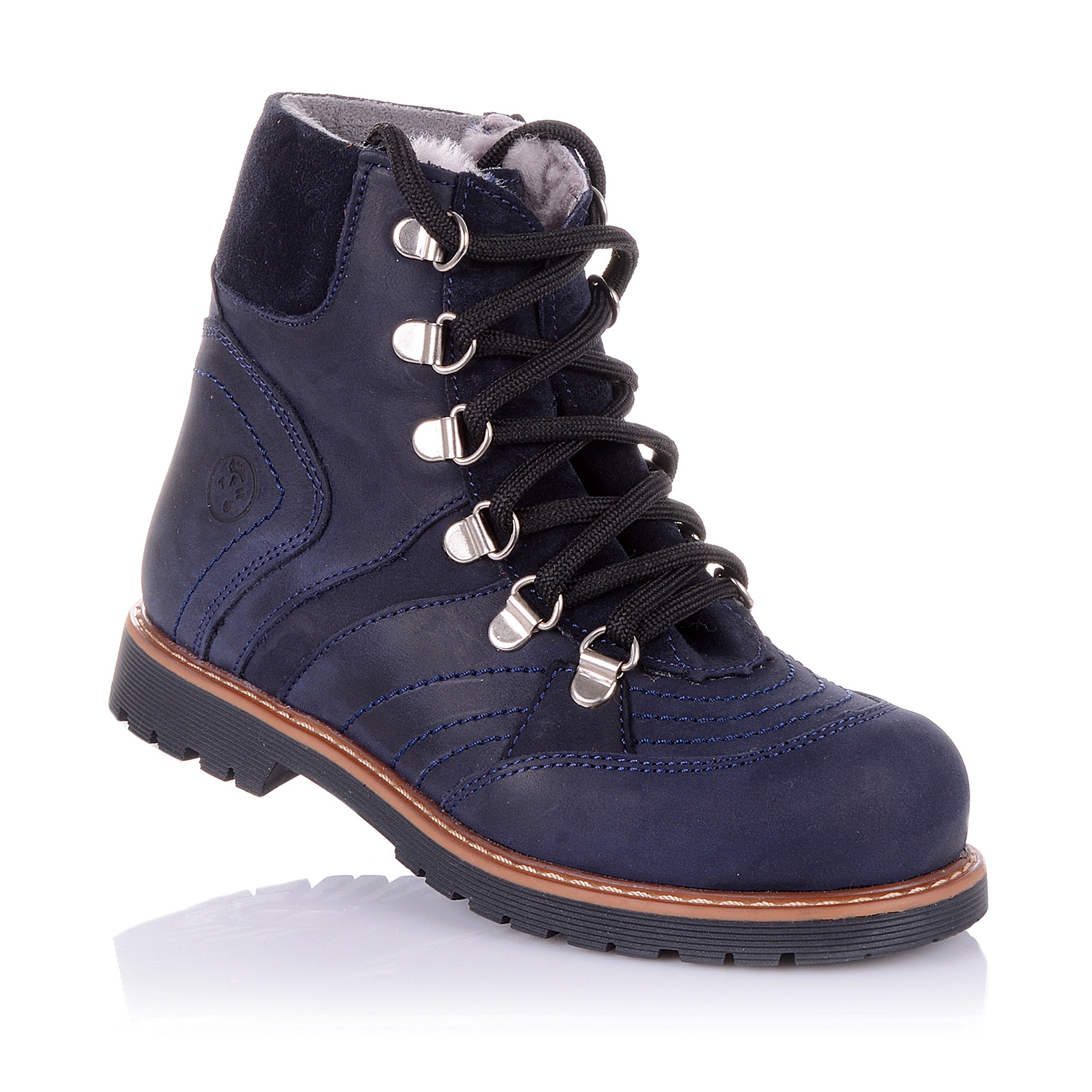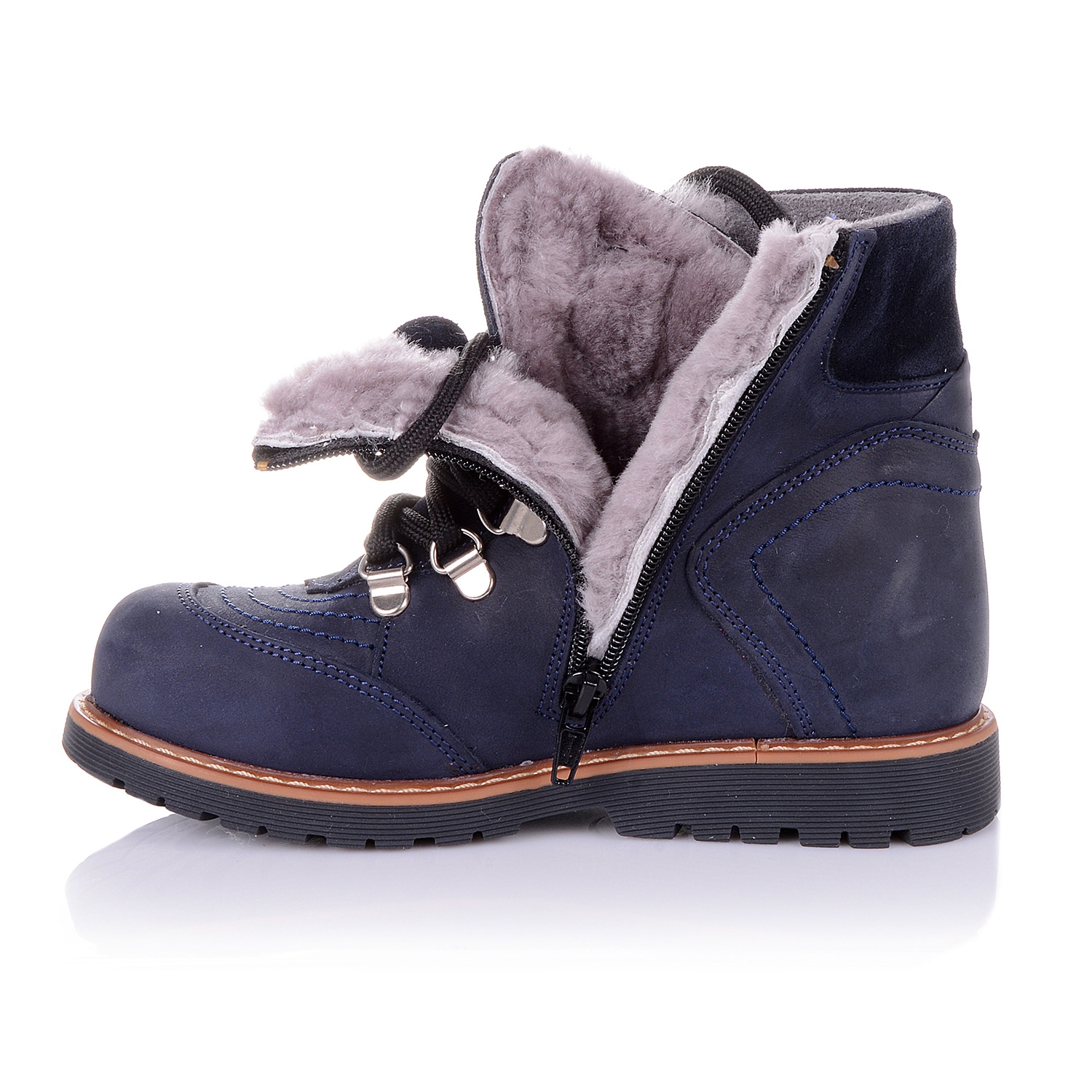 Зимние ортопедические ботинки темно-смнего цвета. Сверху регулируются шнурками, С внутренней стороны - на молнии. Снаружи кожа (жирный нубук), внутри - натуральный мех (цигейка). Есть супинатор, высокий твердый задник, каблук Томаса.