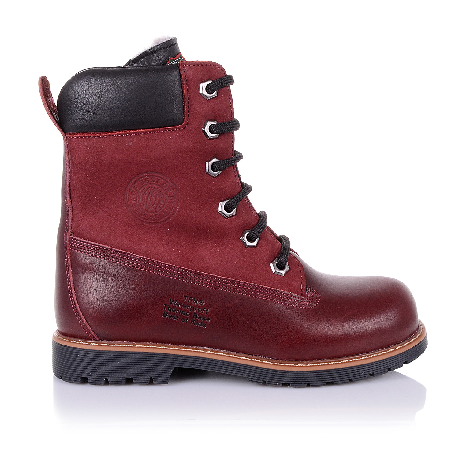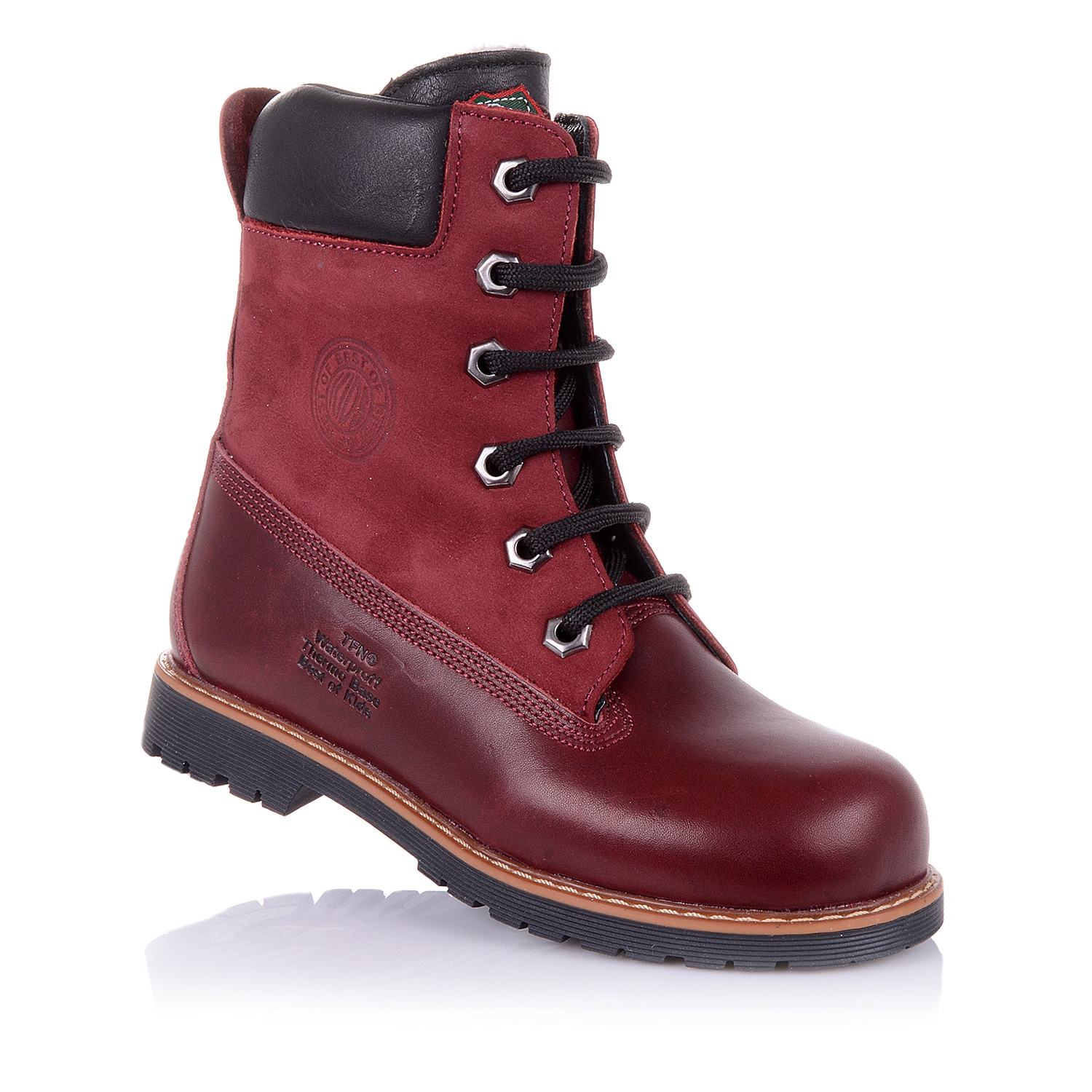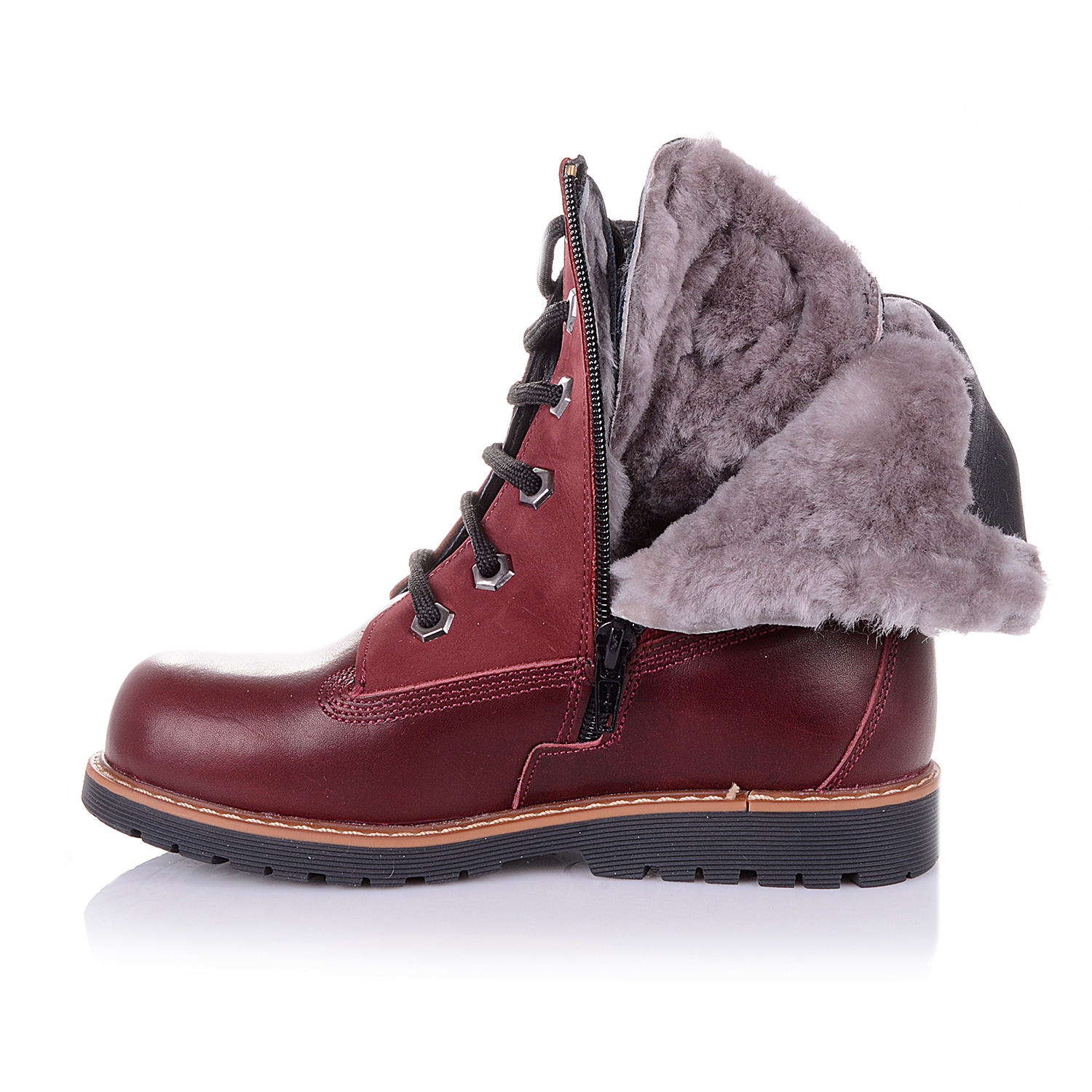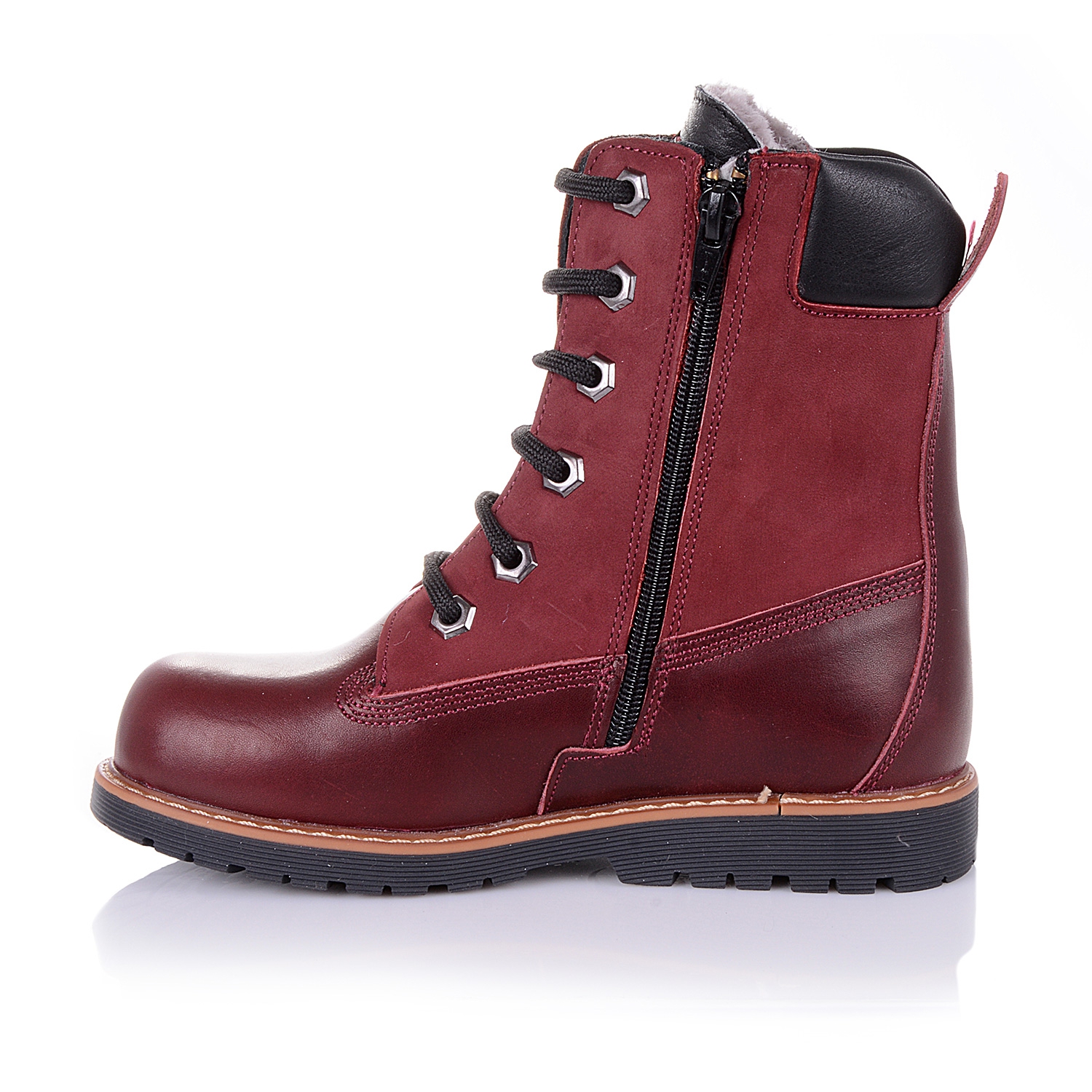 Зимние ортопедические ботинки (берцы) бордового цвета. Сверху регулируются шнурками, С внутренней стороны - на молнии. Снаружи кожа + нубук, внутри - натуральный мех (цигейка). Есть супинатор, высокий твердый задник, каблук Томаса.