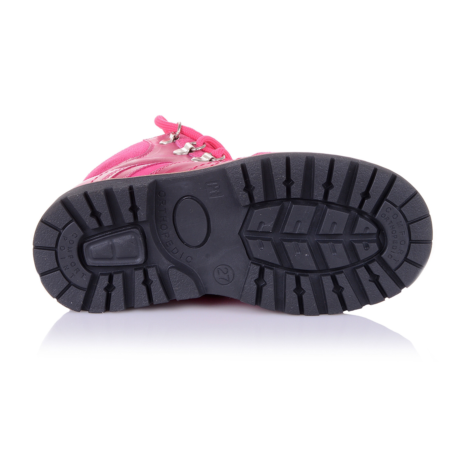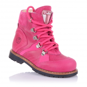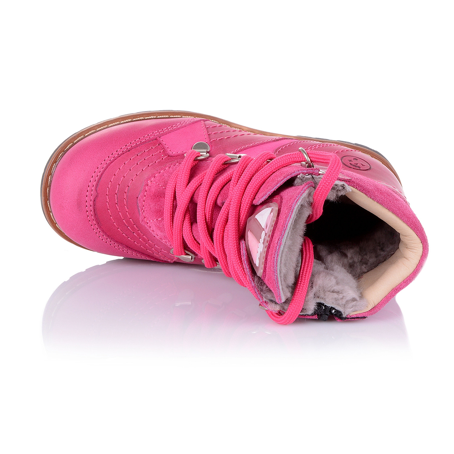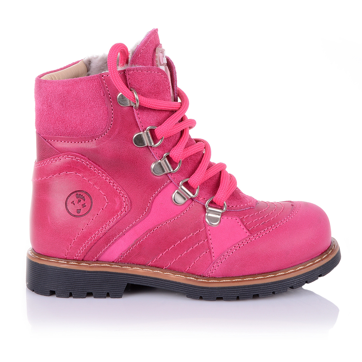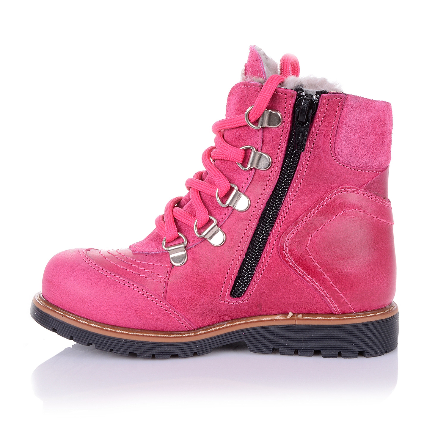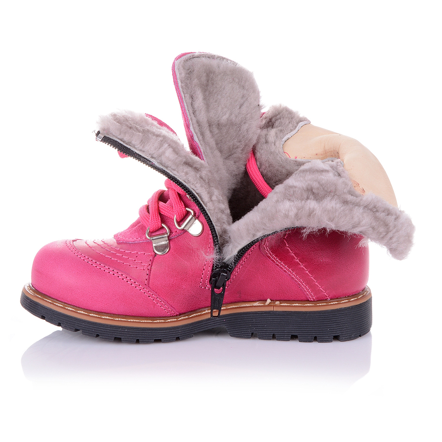 Зимние ортопедические ботинки ярко-розового цвета. Сверху регулируются шнурками, С внутренней стороны - на молнии. Снаружи кожа (жирный нубук), внутри - натуральный мех (цигейка). Есть супинатор, высокий твердый задник, каблук Томаса.