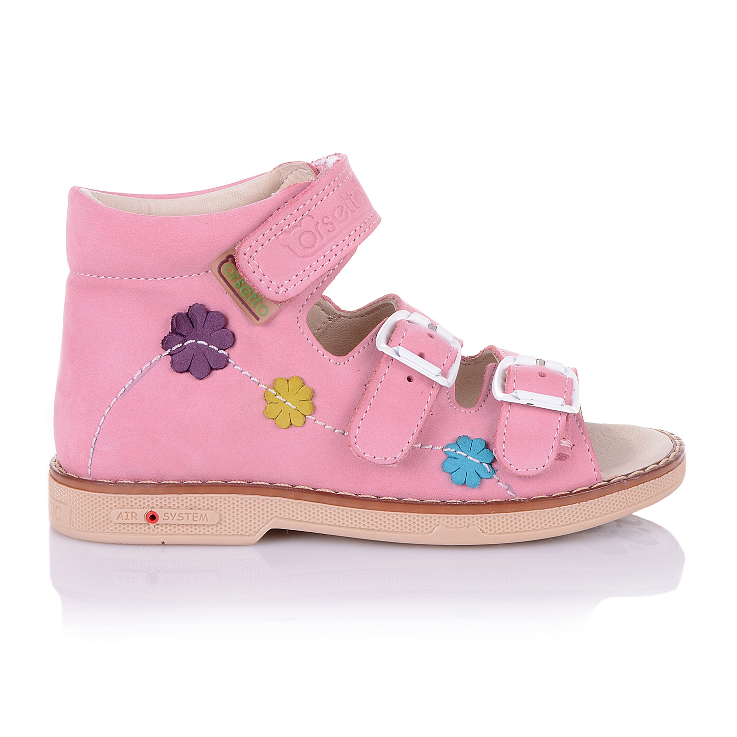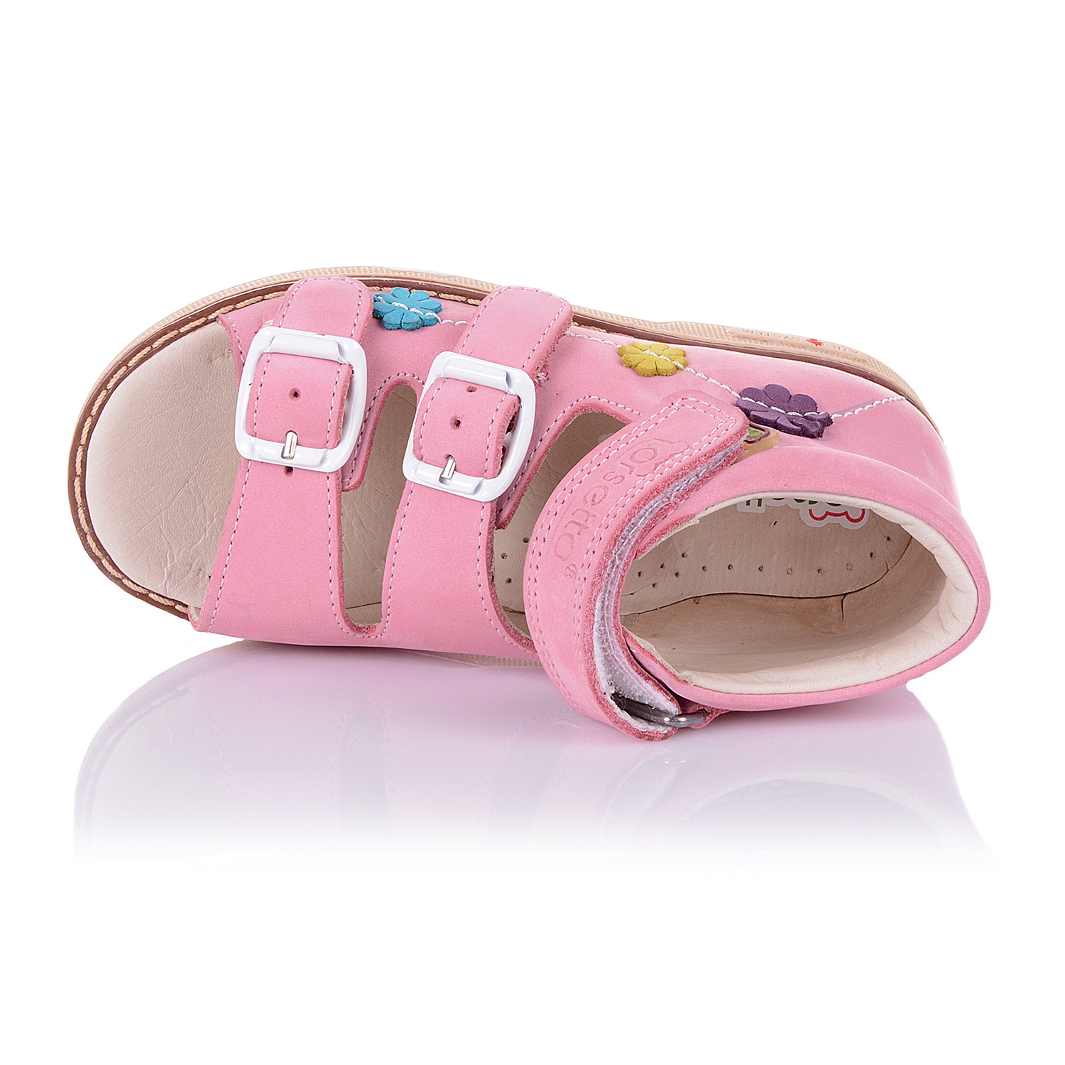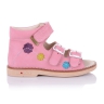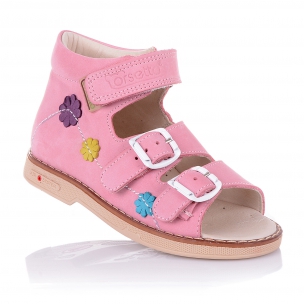 Ортопедические босоножки нежно-розового цвета с разноцветными цветочками, которые пришиты к изделию. Внутренняя и внешняя часть выполнена из натуральной кожи. Удобная фиксация на два ремешка и липучку позволяет подобрать туфли на ногу разной полноты и высоты свода. Стелька с супинатором и твердый задник обеспечивают физиологически правильное положение ножки. Подошва, износостойкая из термокаучука, со скошенным каблуком Томаса и антишоковыми вставками, которые снимают ударную нагрузку на пяточную кость.