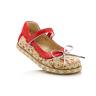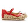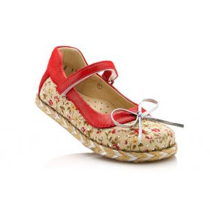 Туфли Tiflani бежево-коричневого цвета с цветочками, камушками и красной окантовкой с напылением, сверху фиксируются липучкой. Снаружи гобелен + кожаные вставки с напылением, внутри кожаные, есть супинатор, твердая пятка.