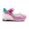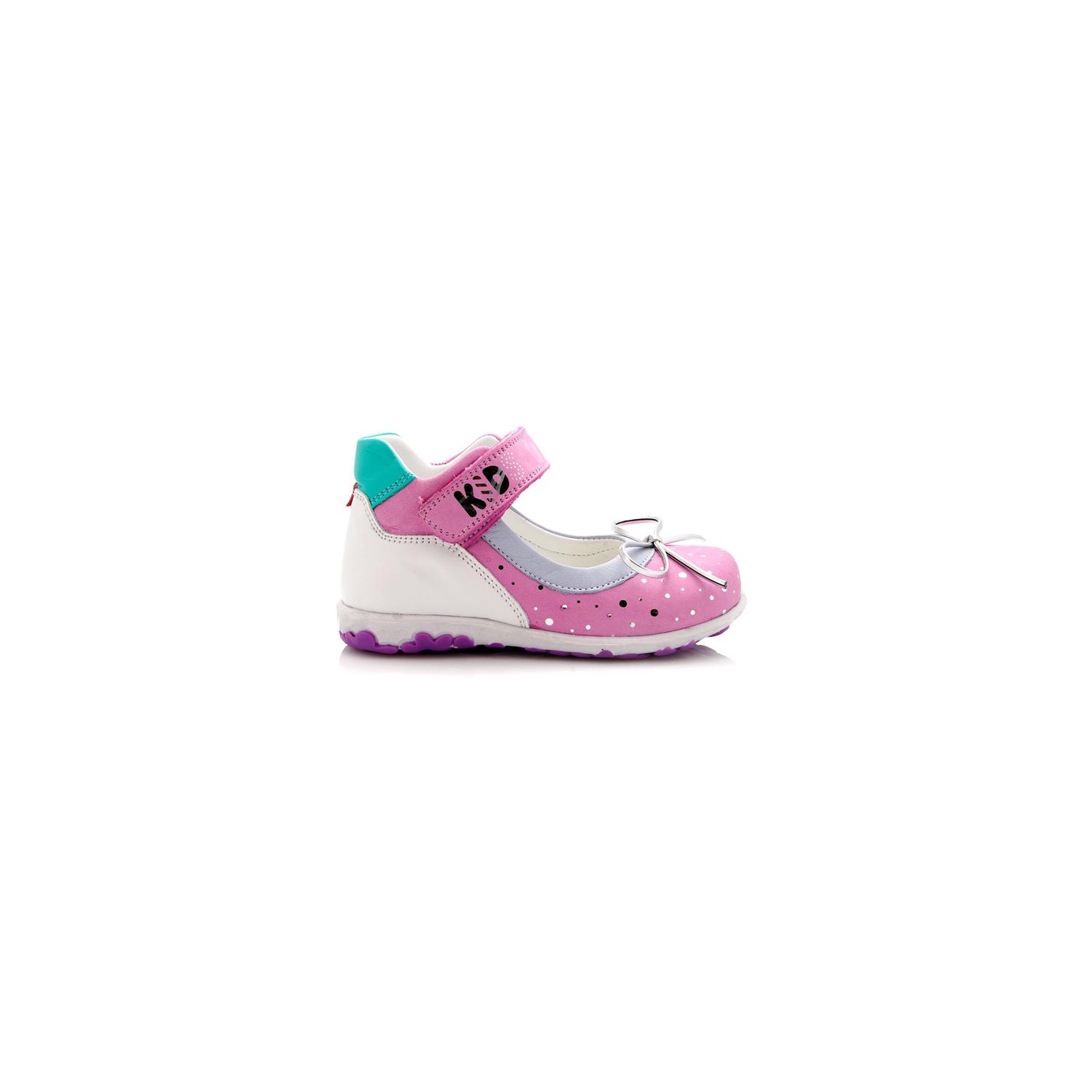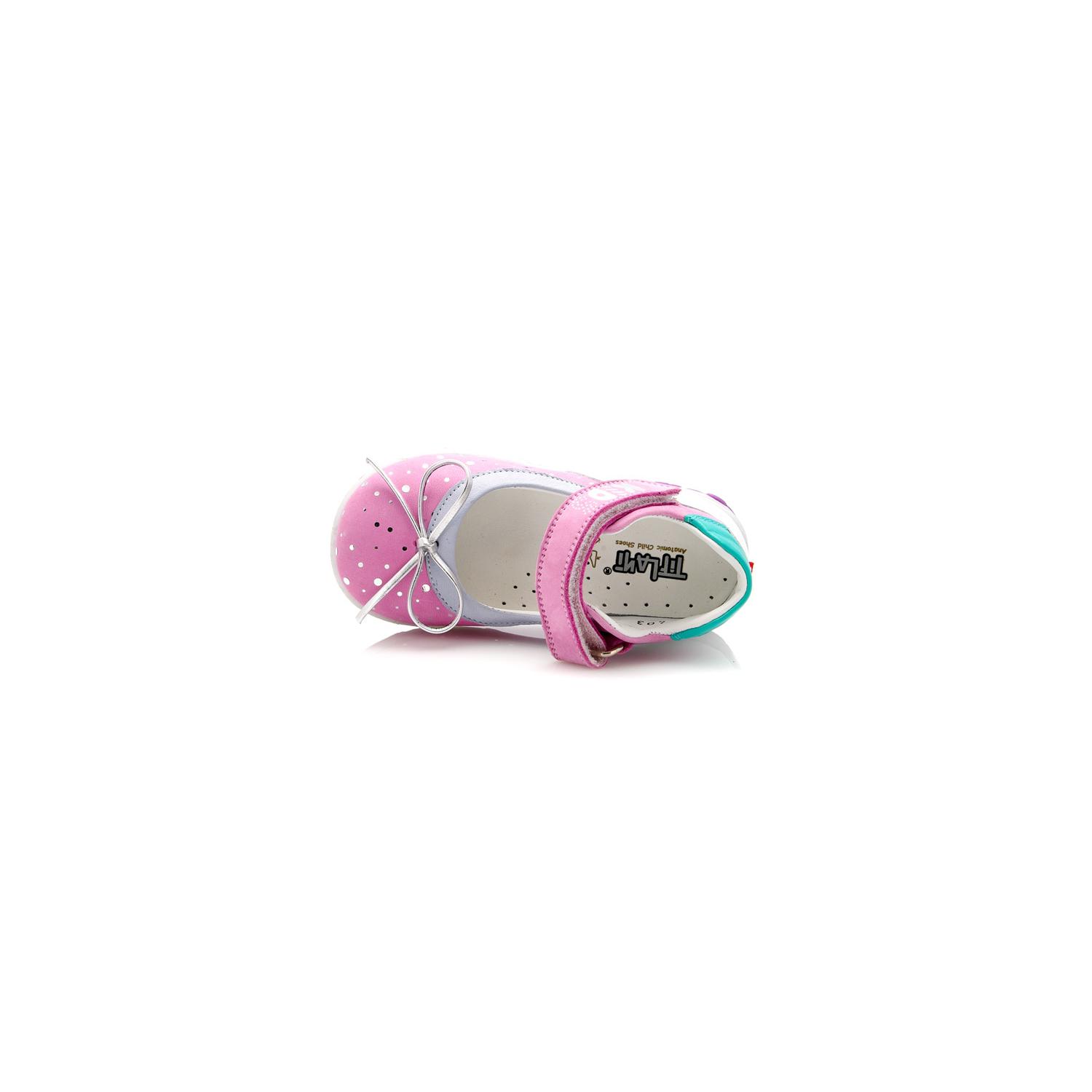Туфли Tiflani розового цвета с белой и бирюзовой вставкой, сверху фиксируются липучкой. Снаружи кожа + гладкий нубук, внутри - кожа, есть супинатор, твердая пятка.